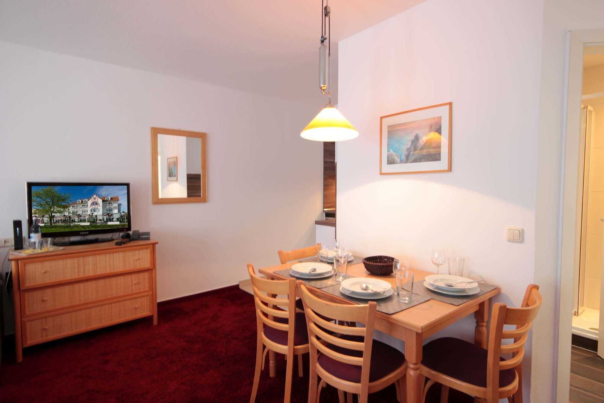 Ihre 1-Zimmer Ferienwohnung 225RB16 ist ca. 45 qm groß und für bis zu 4 Personen gut geeignet. Das Appartement erreichen Sie mit dem Aufzug bis zur 2. Etage, dann über eine Treppe eine halbe Etage runter. Neben dem kombinierten Wohn- und Schlafraum mit Doppelbett sowie Schlafsofa, auf dem die 3. und 4. Person gut schlafen können, gehört ein Essbereich, Flachbild TV sowie WLAN zur Nichtraucherwohnung. Vom Balkon haben Sie einen seitlichen Blick auf die Strandpromenade und zur Binzer Seebrücke. Ebenfalls können Sie eine voll ausgestattete integrierte Küchenzeile mit Geschirrspüler, Nespresso-Maschine, Backofen, Mikrowelle, Wasserkocher, Toaster und Kaffeemaschine nutzen. Das Badezimmer erwartet Sie mit Waschtisch, WC und Dusche.