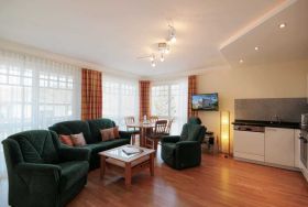 Ihre luxuriöse 3-Raum Ferienwohnung 90230 hat eine Größe von ca. 70 qm und ist für max. 6 Personen eingerichtet. Sie befindet sich im Erdgeschoss und verfügt über einen großen Südwestbalkon, von dem Sie einen wunderschönen Blick auf den Schmachter See haben. Die Ferienwohnung ist aufgeteilt in einen gemütlichen Wohnraum, eine offene moderne Markeneinbauküche mit Granitarbeitsplatte, zwei Schlafzimmer, ein Duschbad mit Waschtisch und WC sowie eine separate Gästetoilette. Das Wohnzimmer ist mit einem Essplatz und einer Sitzgruppe, die auch eine Schlafgelegenheit für die 5. und 6. Person bietet, möbliert. Die technische Ausstattung beinhaltet einen Flachbildfernseher und eine Musikanlage. Außerdem ist ein kostenfreier Internetzugang nutzbar. Die Küche ist mit Kühlschrank, Backofen, Ceranfeld, Geschirrspüler und weiteren Elektrogeräten komplett ausgestattet. Ein Schlafzimmer verfügt über ein Doppelbett und einen Kleiderschrank, das 2. Schlafzimmer über eine Schlafcouch.