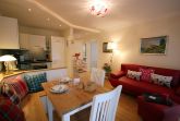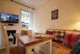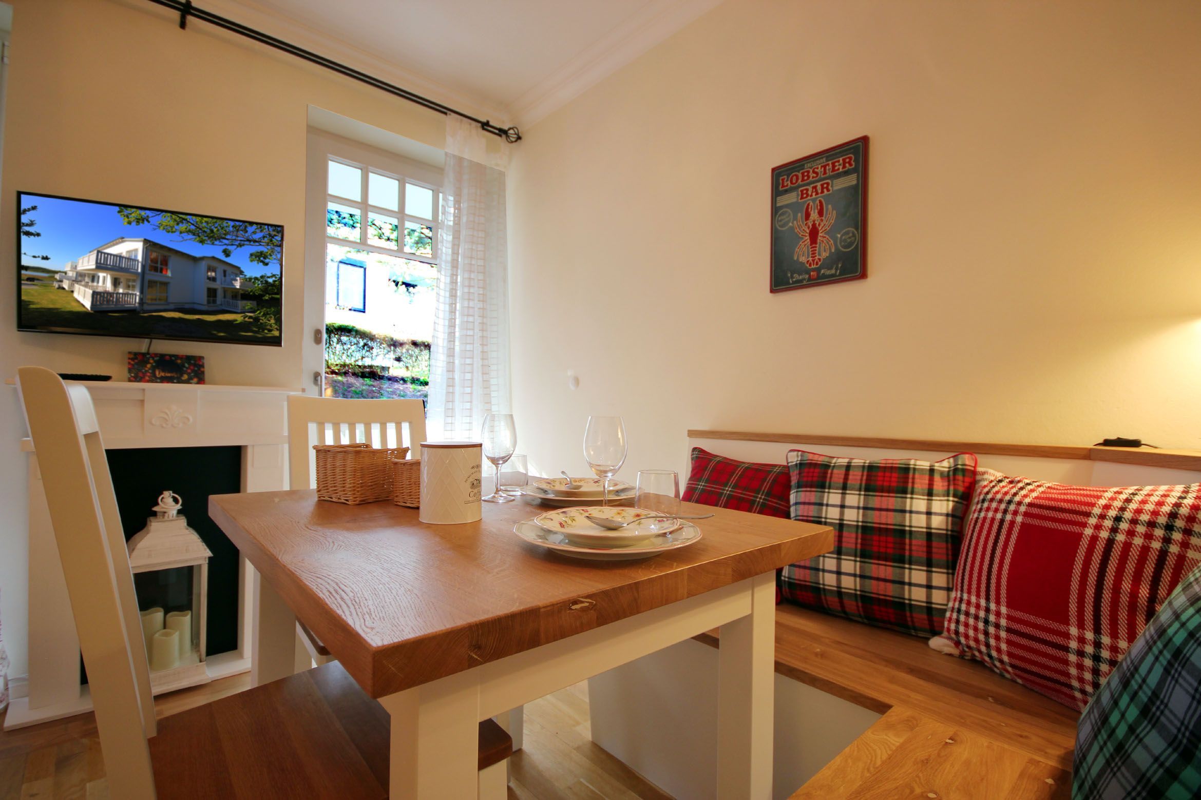 Das Wohnzimmer ist mit einer Essecke aus Massivholz und einer Lederschlafcouch (Liegefläche 1,50 x 2,10 m), die auch eine Schlafgelegenheit für die 3. Person bietet, möbliert.