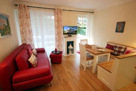 Die Ferienwohnung ist aufgeteilt in einen gemütlichen Wohnraum, eine offene moderne Markeneinbauküche mit Granitarbeitsplatte, ein Schlafzimmer und ein Tageslichtbad mit Glasdusche, Waschtisch und WC.