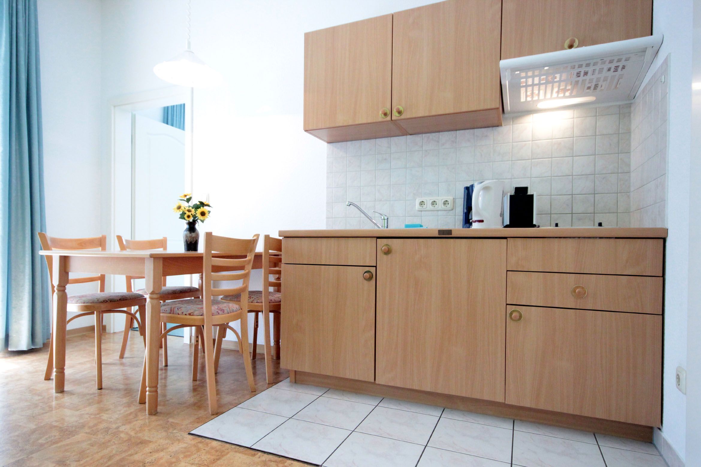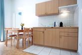Die Wohnküche ist mit einem Kühlschrank, Kochfeld, Kaffeemaschine, Wasserkocher, Toaster und diversen Kleingeräten ausgestattet. Ein sonniger in Richtung Süden gerichteter Balkon schließt sich dem Wohnbereich an.
