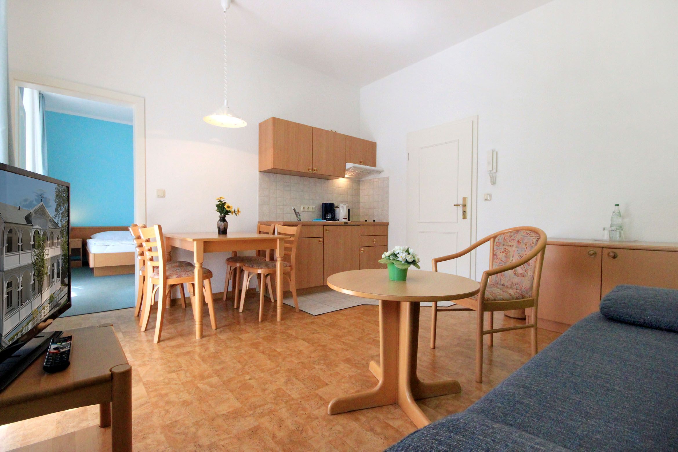 Im Wohnraum gibt es eine gemütliche Sitzecke mit Schlaffunktion für die 3. Person, Flachbild-TV sowie einen separaten Essplatz