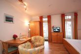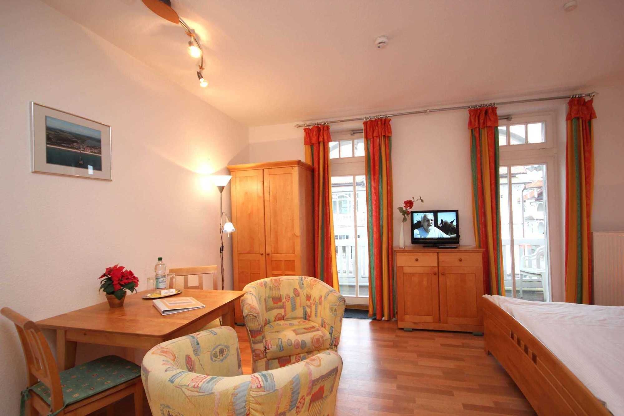 Das helle 1-Raum Appartement ist geschmackvoll eingerichtet. Im kombinierten Wohn- Schlafraum mit Küchenzeile finden Sie ein bequemes Doppelbett, eine Sitz-Essecke und einen Kleiderschrank. Gleich rechts vom Eingang befindet sich das Badezimmer mit Waschtisch, Dusche und WC. Die Küchenzeile ist mit Kühlschrank, Cerankochfeld, Geschirrspüler und diversen Kleingeräten ausgestattet. Ein Flachbildfernseher und ein Radiowecker sind ebenfalls vorhanden.
