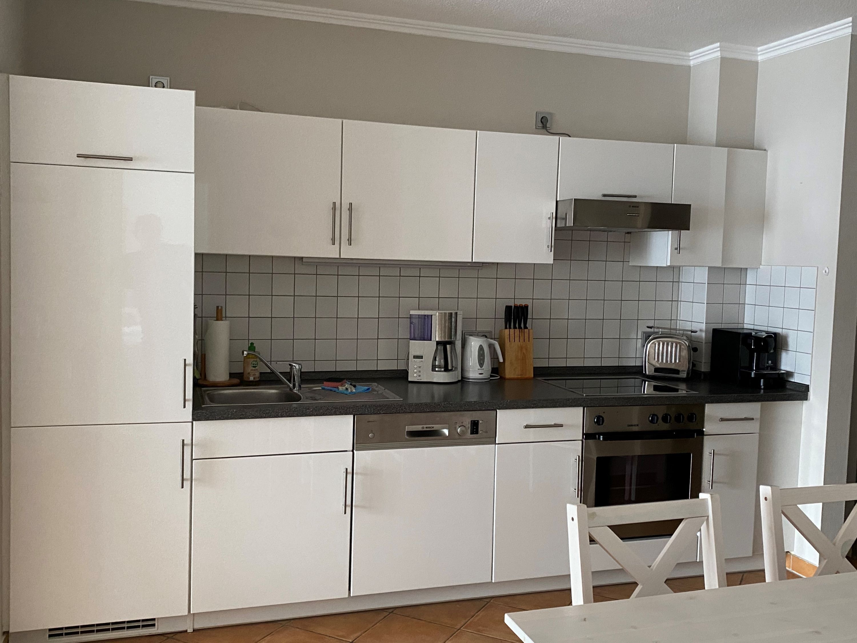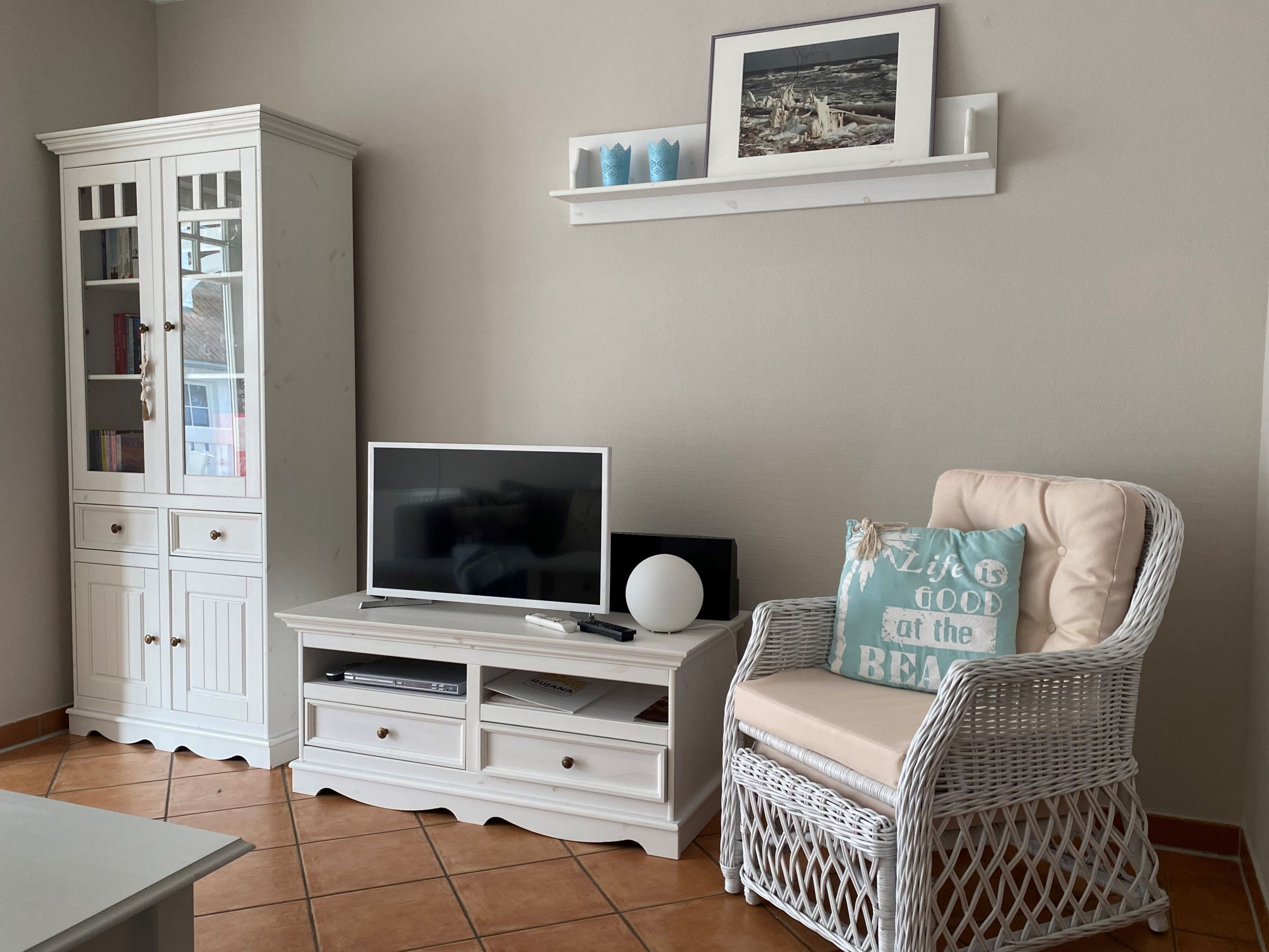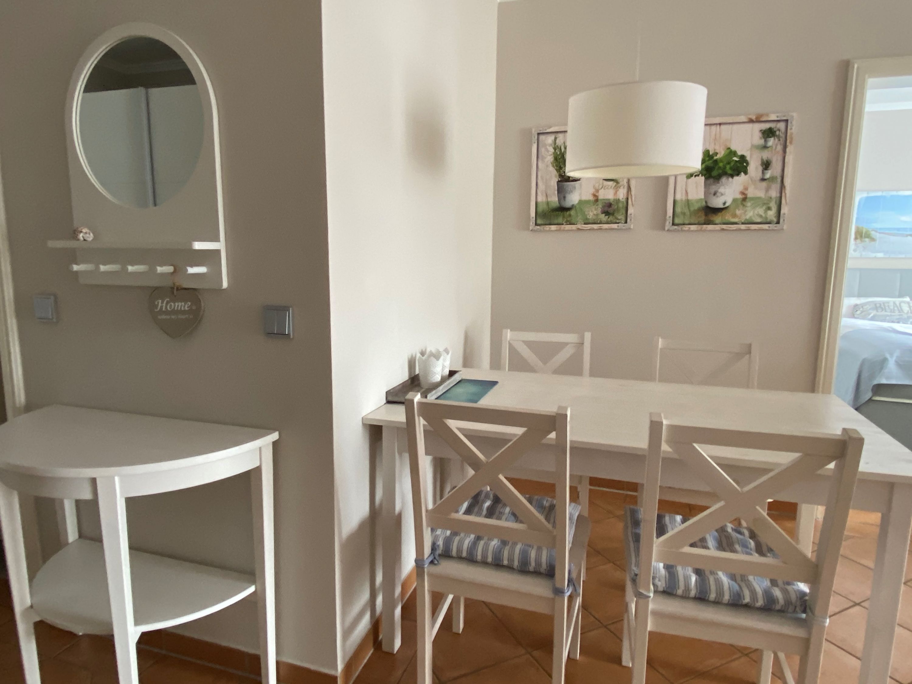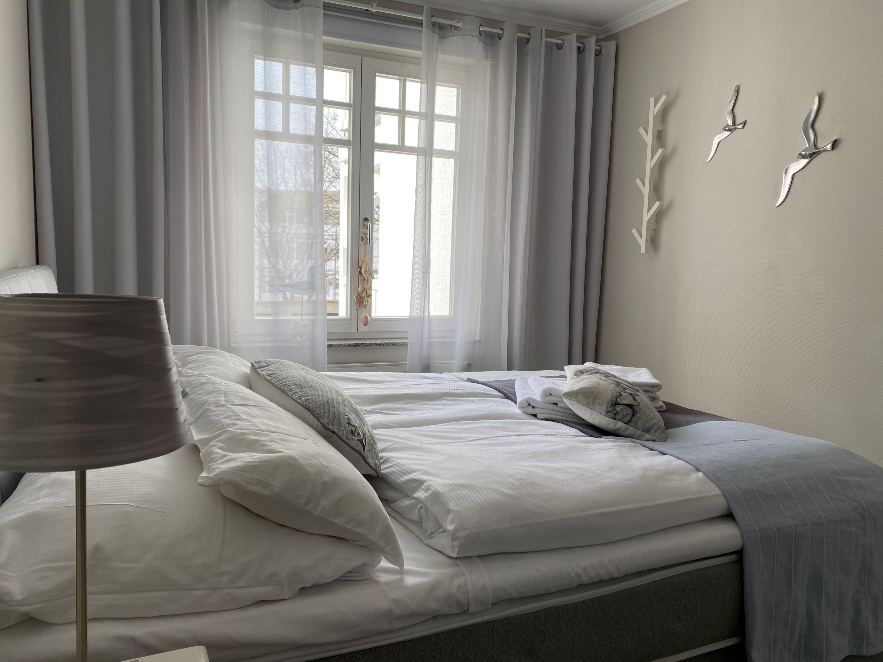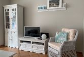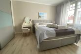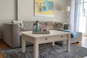 Die Wohnung wurde aufwendig saniert und hochwertig ausgestattet. Bei der Einrichtung wurde viel Wert auf natürliche Materialen und eine maritime Note in dezenten, natürlichen Farben gelegt. Der Wohnbereich ist mit weißen Massivholzmöbeln ausgestattet und verleiht dem Raum skandinavische Frische und maritime Leichtigkeit. Im Wohnraum befindet sich ein gemütlicher Essplatz sowie das zum Entspannen einladende Ecksofa, welches eine Schlaffunktion für die 3. und 4. Person bietet. Als Unterhaltungselektronik stehen ein Smart LED-Flachbildfernseher, DVD-Player und Radio/CD-Spieler zur Verfügung. Der Internetzugang ist über WLAN kostenfrei. Das moderne Bad verfügt über hochwertige Armaturen, Handtuchheizkörper, Dusche, WC sowie Waschtisch, Fön und Fußbodenheizung. Die in den Wohnbereich integrierte Küche ist modern mit einer Kühl-/Gefrierkombination, einem Backofen mit 4-Platten-Cerankochfeld, einer Geschirrspülmaschine, einer NESPRESSO-Kapselmaschine, Filterkaffeemaschine, Wasserkocher, Toaster, einem hochwertigen Messerset sowie diversen Kleingeräten ausgestattet. Das Schlafzimmer bietet, neben einem rückenfreundlichen Boxspringbett (H3) mit bequemen Einstieg (65 cm Höhe), höchsten Schlafkomfort, einen geräumigen Kleiderschrank sowie eine Frisierkommode im skandinavischen Stil. Ein Hochstuhl steht Ihnen zur Verfügung und bei Bedarf kann auch ein Babyreisebett gestellt werden.