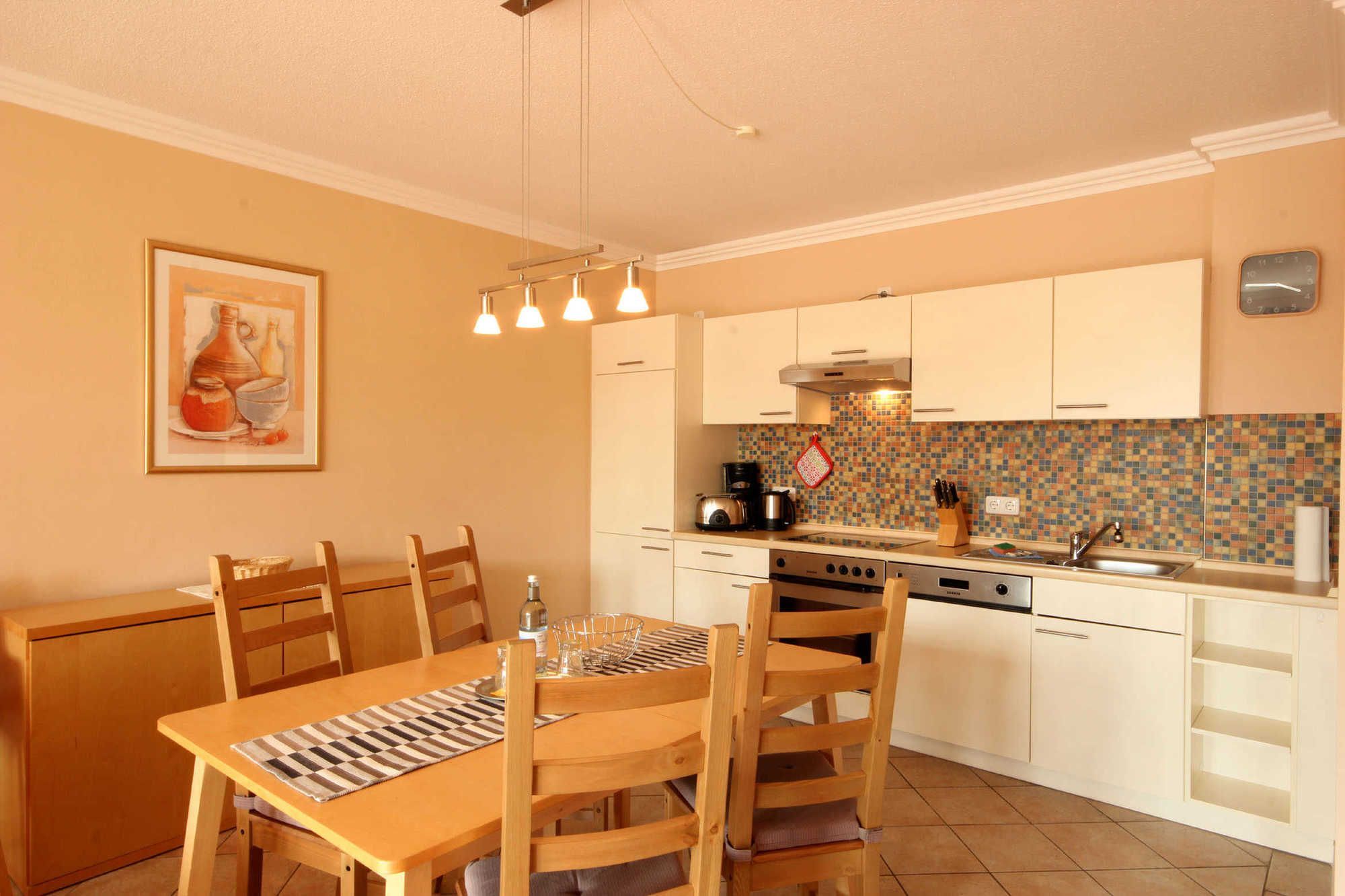 Neben dem schön eingerichteten Wohnraum mit integrierter Küche gibt es einen separaten Schlafraum und ein Badezimmer mit Waschtisch, Dusche und WC. Im Schlafraum befindet sich ein Doppelbett und ein Kleiderschrank. Im Wohnraum können auf dem Schlafsofa weitere zwei Personen schlafen. Sie finden dort auch TV und Radio/CD-Spieler. Die Küche ist mit Geschirrspülmaschine, Kühlschrank und diversen Kleingeräten komplett ausgestattet.