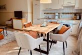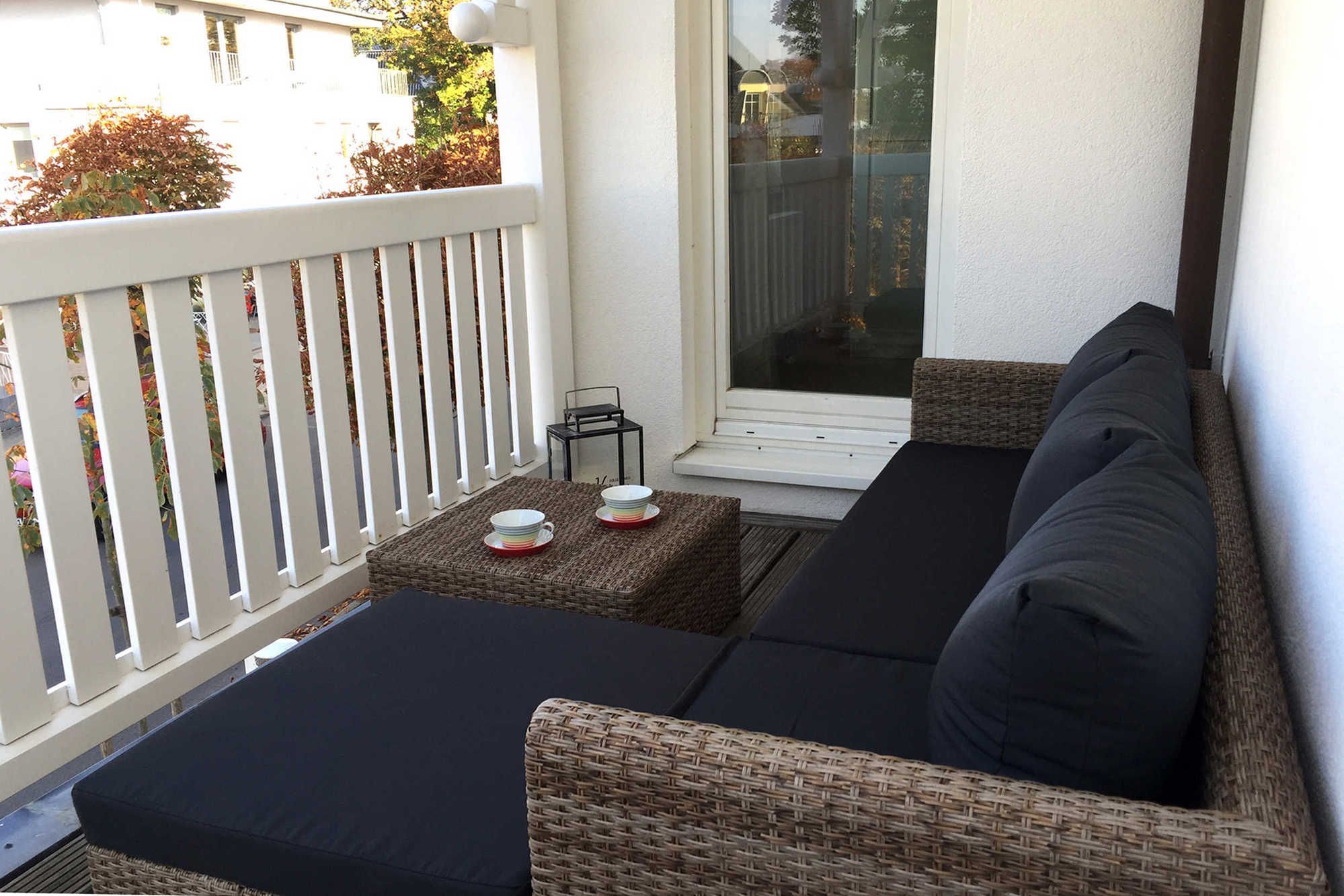 Ihre gemütlich eingerichtete Ferienwohnung 21RB6 befindet sich im 1. Obergeschoss. Die freundliche 3-Raum Wohnung hat eine Größe von ca. 60 qm und ist mit bis zu 5 Personen belegbar. Zwei Balkone, je einer nach Süden und einer nach Westen garantieren luftige Sonnenstunden. Neben dem Wohnraum mit integrierter Küche gibt es zwei Schlafräume und ein Badezimmer mit Waschtisch, Dusche und WC. Im Flur finden Sie eine Garderobe und einen Abstellschrank. Der große Schlafraum ist mit einem bequemen Boxspringbett sowie Flachbild-TV ausgestattet und im kleineren Schlafraum gibt es ein Schrankbett mit gutem Schlafkomfort sowie Flachbild-TV. Eine weitere Schlafmöglichkeit besteht auf dem Rollbett bzw. Schlafsofa im Wohnraum. Stauraum für Kleidung u.ä. finden Sie in allen Räumen. Der Wohnbereich bietet neben Sitz- und Essplatz auch einen Smart-TV und einen Radio/CD-Spieler. Die integrierte Küchenzeile mit Geschirrspülmaschine, Backofen, Herd, Kühlschrank, Kaffeemaschine und Toaster lässt kaum Wünsche offen. Alle unsere Gäste haben einen kostenfreien WLAN-Zugang sowie einen Safe in dieser Wohnung. Fahrräder können im Kellerbereich abgestellt werden. Ein wohnungseigener PKW-Parkplatz steht direkt am Haus zur Verfügung. Haustiere sind nicht erlaubt !