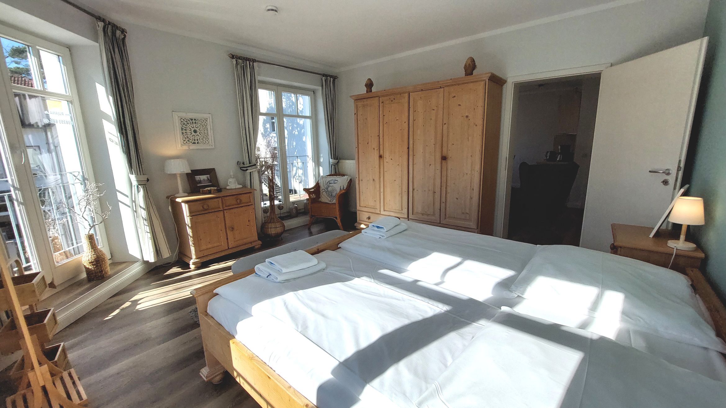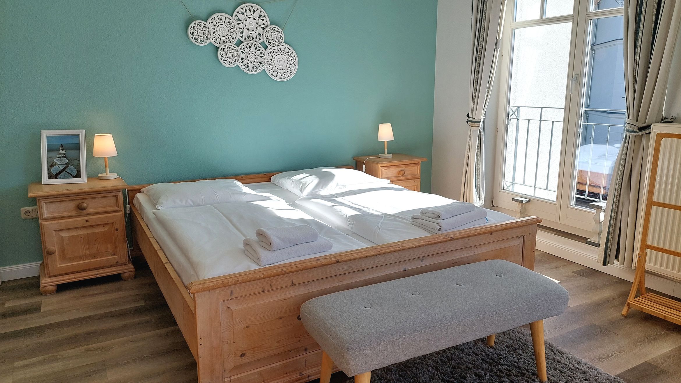 Ihre Ferienwohnung 90302 befindet sich im 1. Obergeschoss des Hauses. Die 2 Zimmer - Wohnung hat eine Größe von ca. 50 qm und verfügt über einen Nordwestbalkon auf dem Sie die Abendsonne genießen können. Neben dem Wohnraum mit integrierter Kochzeile gibt es einen separaten Schlafraum, Flur und ein Badezimmer mit Waschtisch, Dusche und WC. Im lichtdurchfluteten Schlafraum befindet sich ein Doppelbett, ein großer Kleiderschrank und mehrere französische Balkone.
