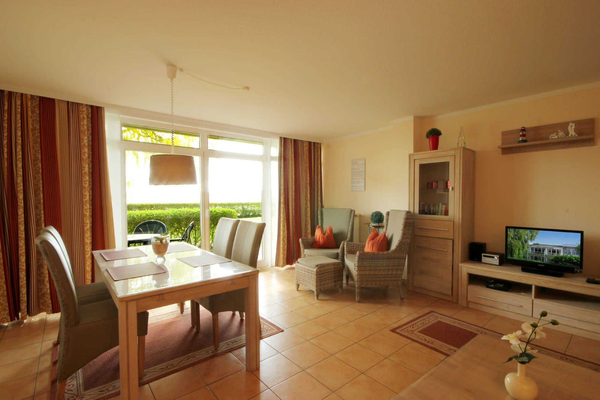 Ihre 2-Raum Nichtraucher - Ferienwohnung 37RB5 hat eine Größe von ca. 52 qm und ist für max. 4 Personen eingerichtet. Sie befindet sich im Erdgeschoss der Villa. Die dazugehörige Südterrasse mit einem wunderschönen Blick bis hin zum Schmachter See lädt zum Sonnenbaden und Verweilen ein. Die Ferienwohnung ist aufgeteilt in einen gemütlichen Wohnraum, eine offene moderne Küche, ein Schlafzimmer und ein Duschbad mit Waschtisch, WC und Kosmetikspiegel. Das Wohnzimmer ist mit einem Essplatz und einer Sitzgruppe, die auch eine Schlafgelegenheit für die 3. und 4. Person bietet, möbliert. Die technische Ausstattung beinhaltet ein Flachbildfernseher mit DVD-Player und eine Musikanlage. Die Küche ist mit Kühlschrank, Backofen, Cerankochfeld, Geschirrspüler, Kaffeemaschine und weiteren Elektrogeräten komplett ausgestattet. Das Schlafzimmer verfügt über ein Doppelbett und einen Kleiderschrank mit Safe. Alle unsere Gäste haben einen gebührenfreien W-Lan Zugang in dieser Wohnung.