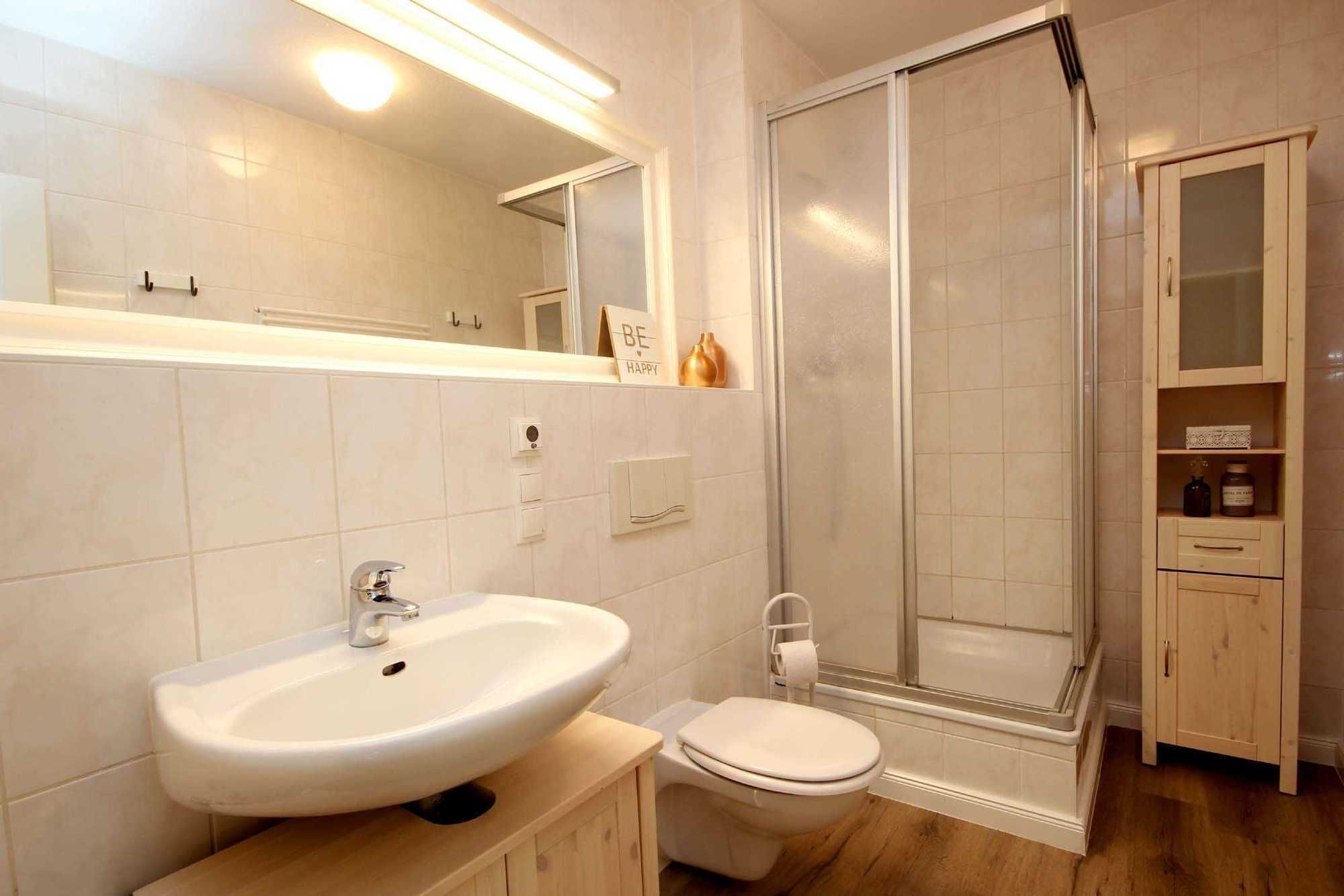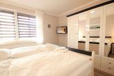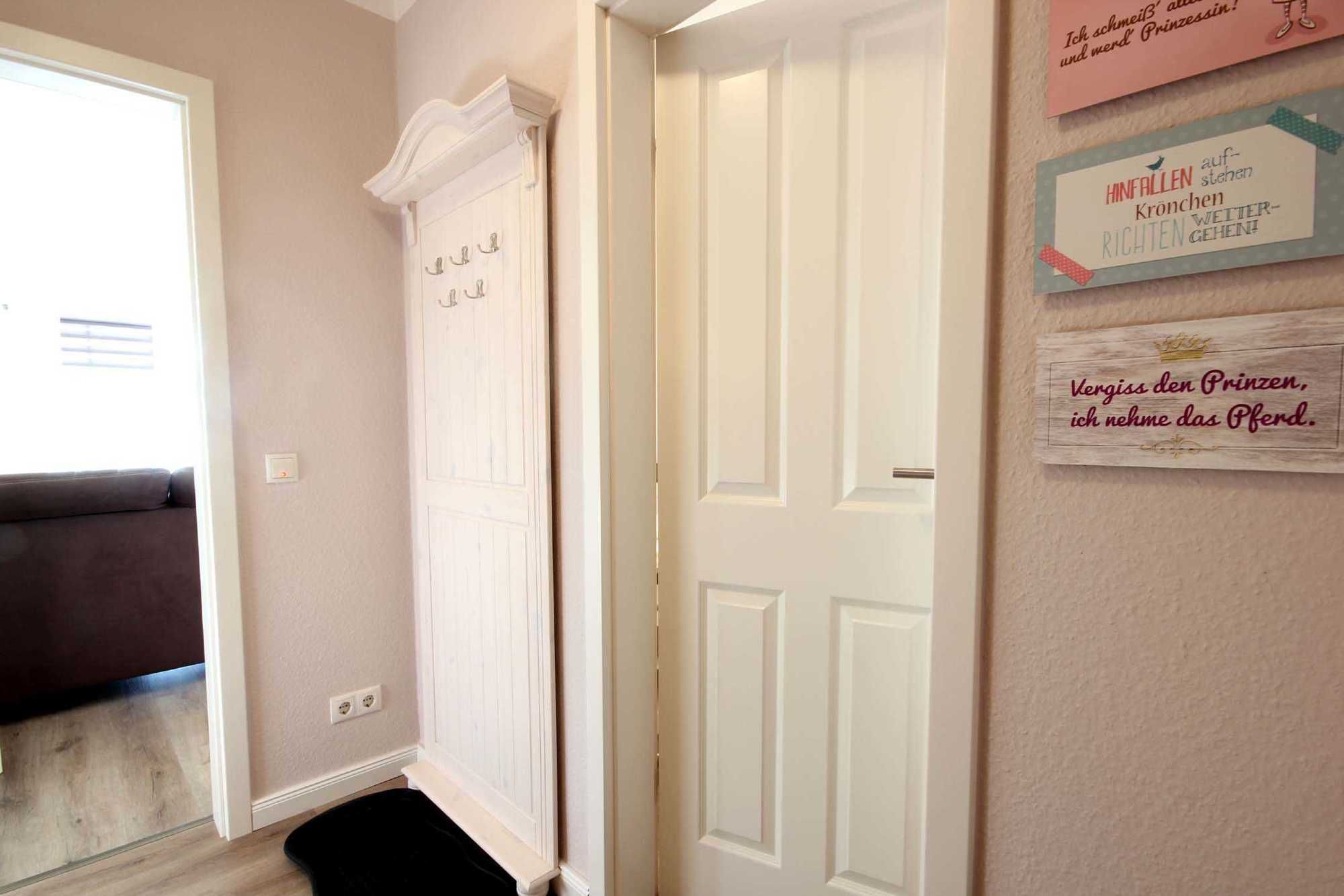 Die hell und hochwertig eingerichtete Ferienwohnung teilt sich auf in einen Flur mit Garderobe, gemütlichen Wohnraum mit zusätzlichem modernen Schrankbett für die 3. und 4. Person, Essbereich und kompletter Wohnküche sowie ein separates Schlafzimmer mit großem Doppelbett und erstklassigen Boxspringmatratzen für einen erholsamen Schlaf, zusätzlichem Flachbild-TV und Kleiderschrank mit Spiegel sowie ein Badezimmer mit Waschtisch, WC und Dusche.
