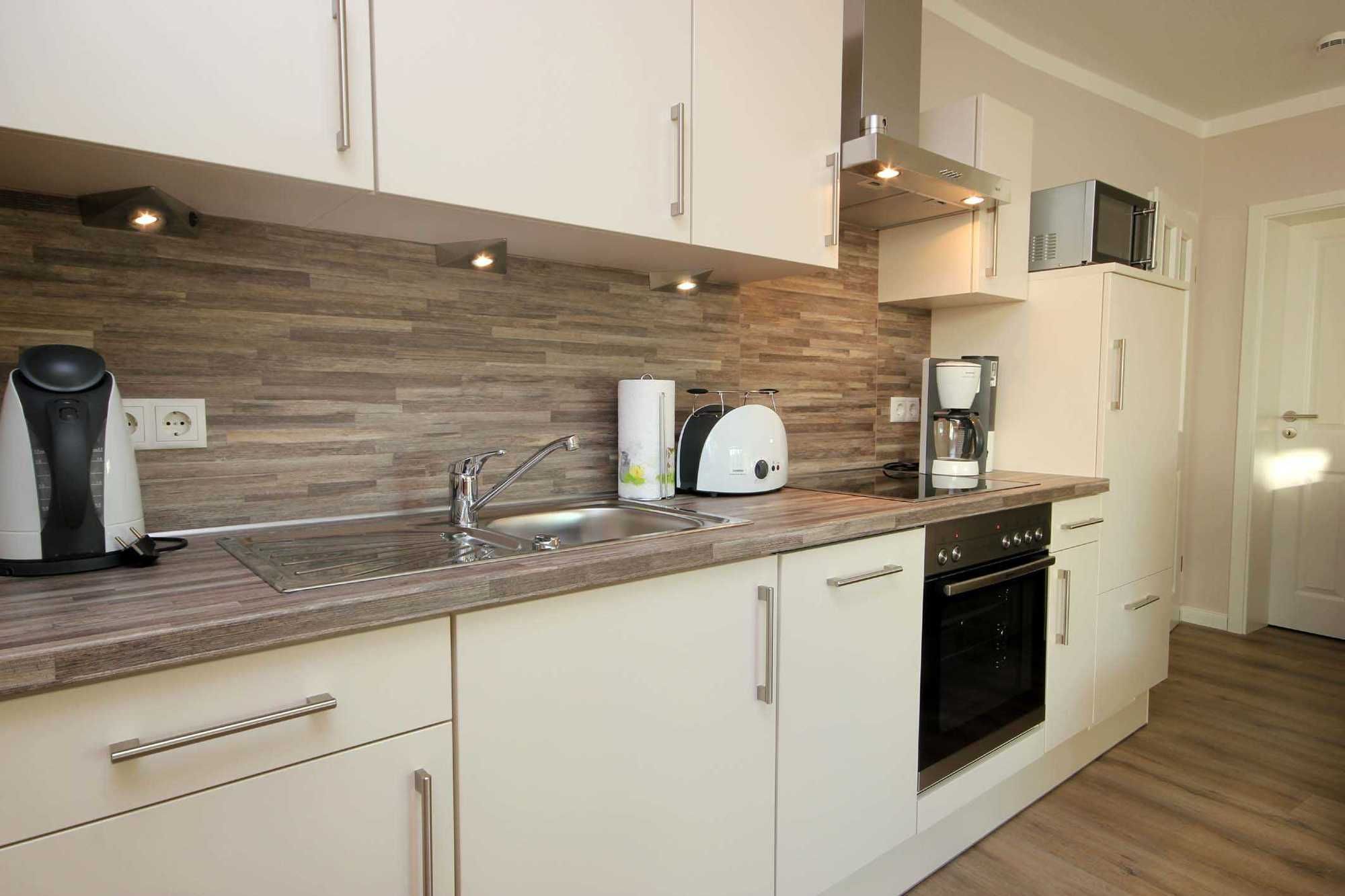 Die Küchenzeile ist mit Geschirrspüler, Cerankochfeld, Backofen, Kühlschrank mit Gefrierfach, Mikrowelle, Kaffeemaschine, Wasserkocher, Toaster sowie umfangreichem Kücheninventar komplett ausgestattet. Zusätzlichen Stauraum für Ihre Koffer oder Strandutensilien bietet der wohnungseigene Abstellraum. Zudem stehen Kinderreisebett sowie Hochstuhl für unsere kleinen Gäste zur Verfügung. Rundum eine erstklassig eingerichtete Wohnung zum Abschalten vom Alltag und Genießen des Urlaubes.