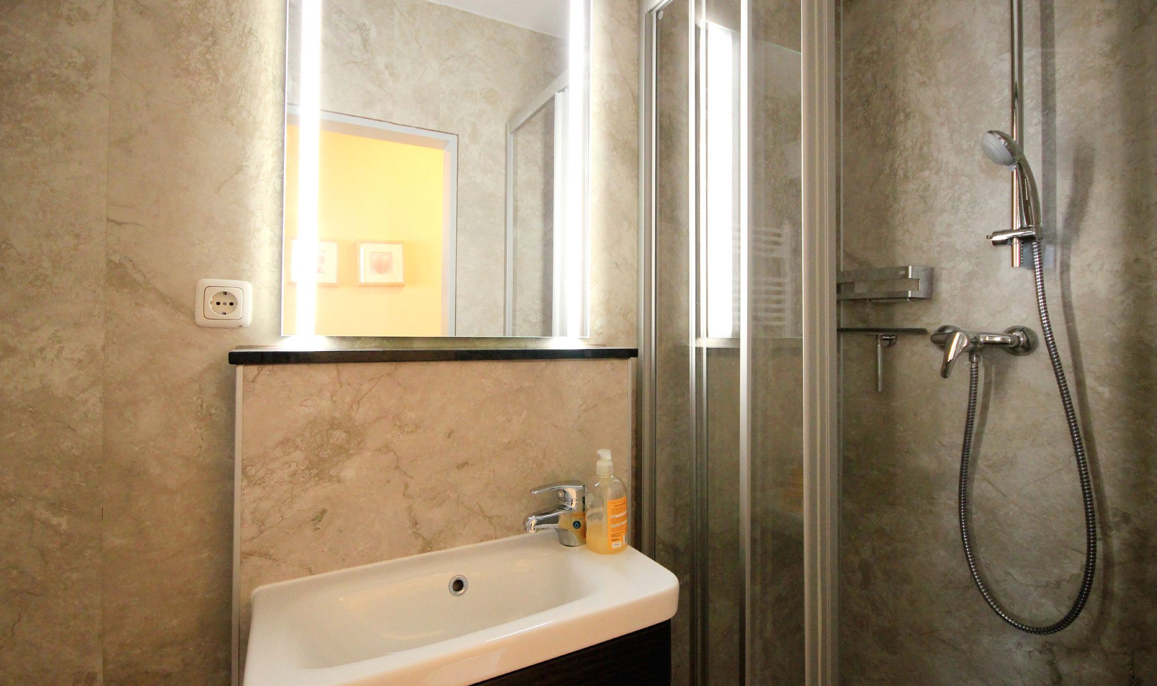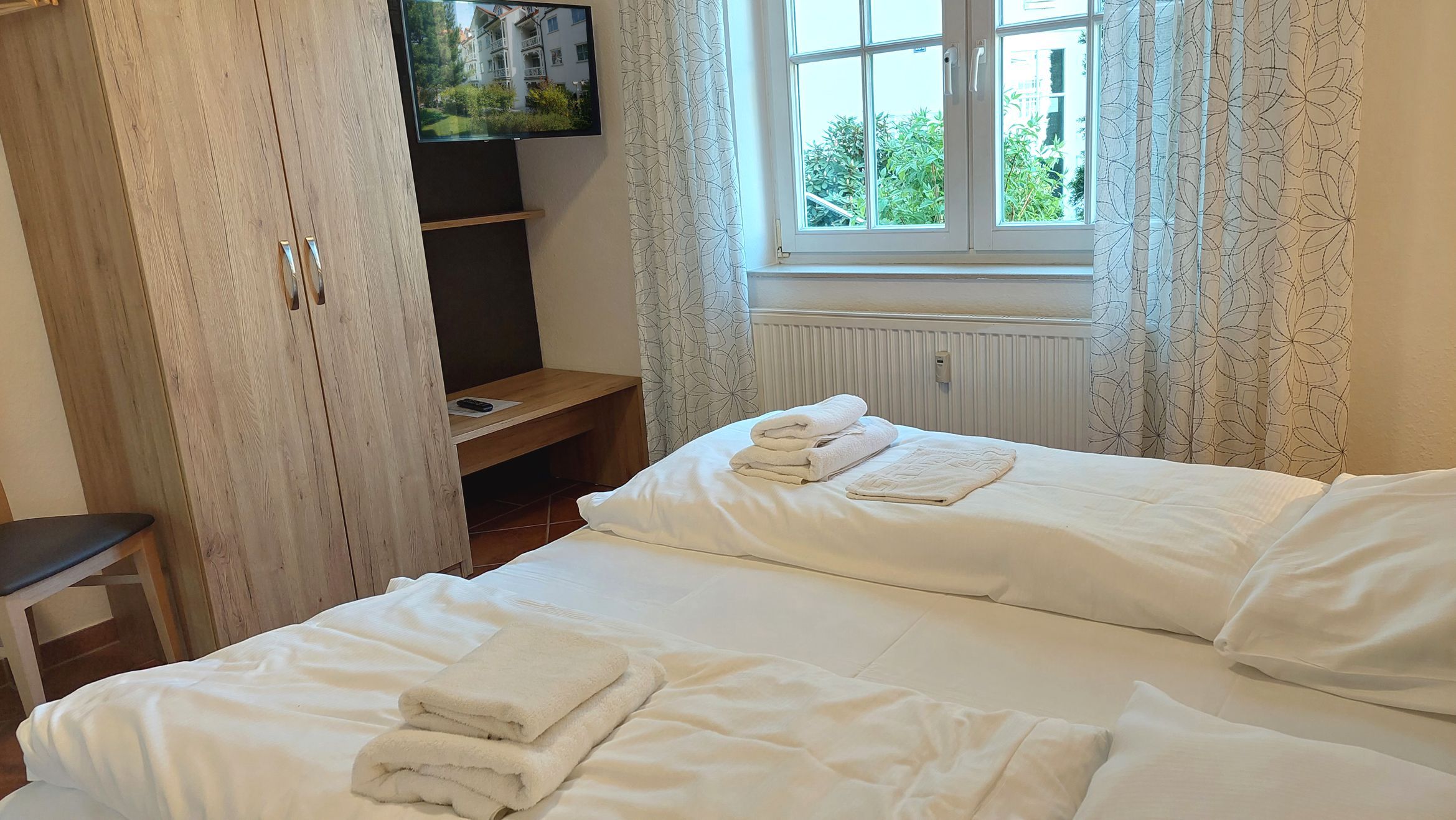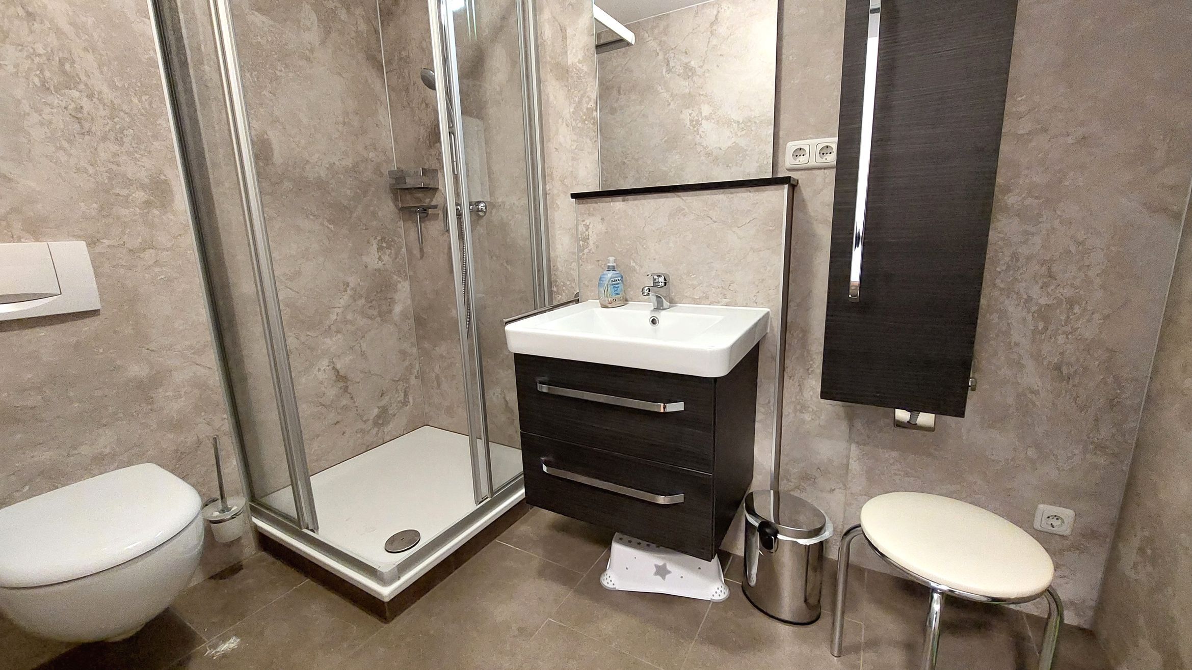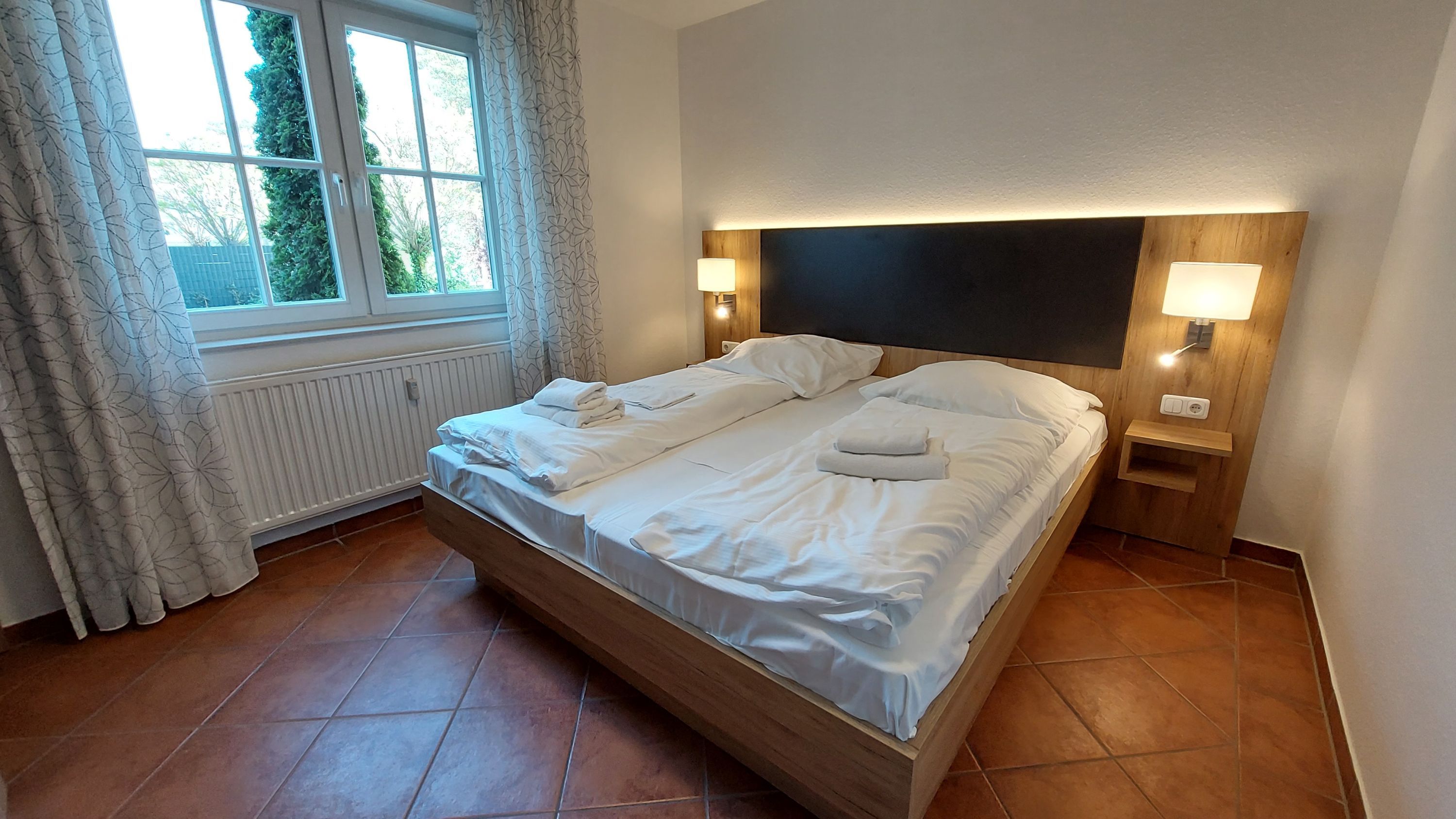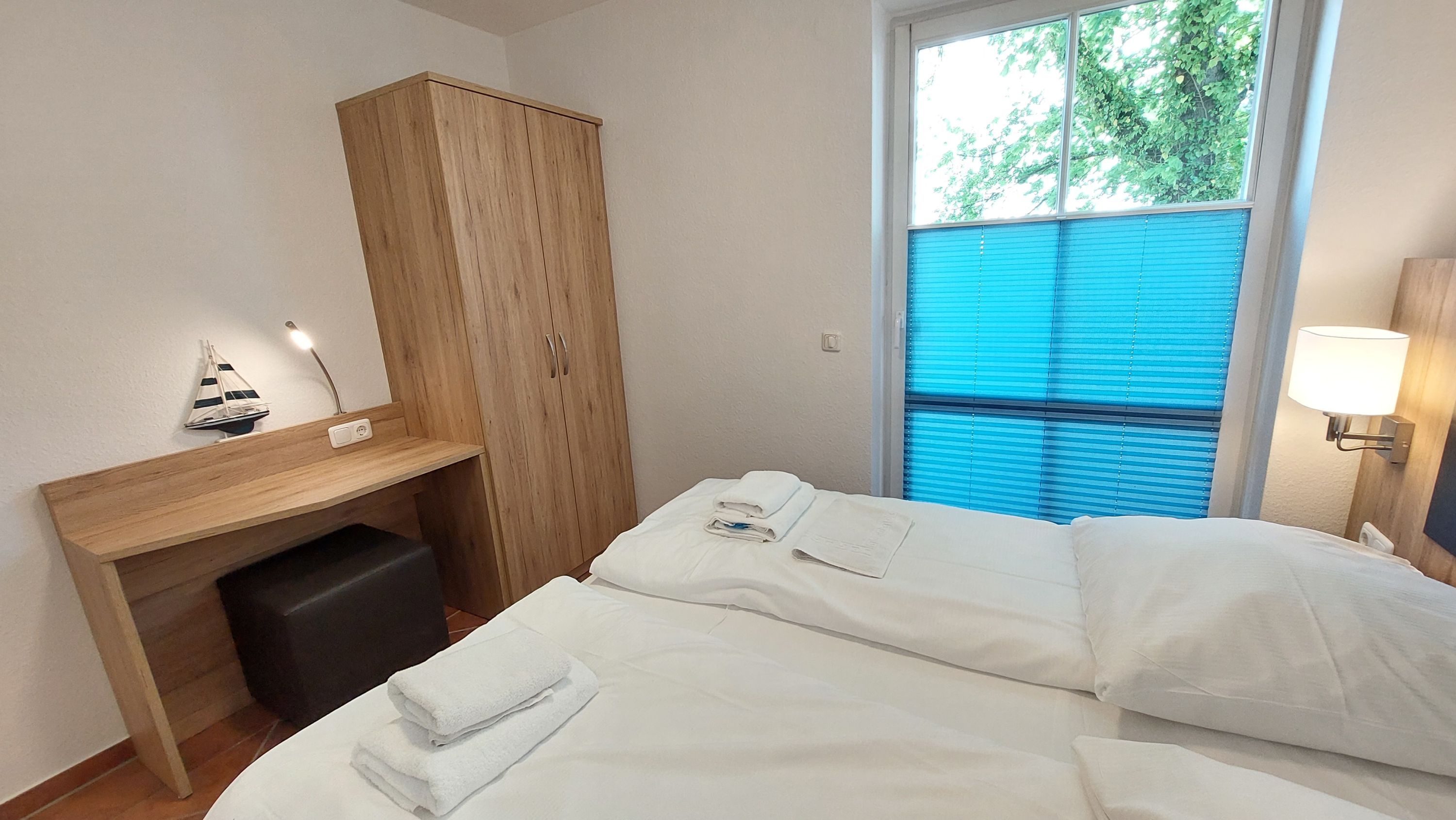 Die beiden Schlafräume sind jeweils mit einem Doppelbett und Kleiderschrank ausgestattet. Im Hauptschlafzimmer finden Sie einen zusätzlichem TV. Das kleinere Schlafzimmer verfügt über einen Schreibtisch und ein fusshohes großes Fenster (franz. Balkon). Beide Schlafzimmer sind durch die elektrischen Außenjalousien verdunkelbar. Die Badezimmer verfügen jeweils über Waschtisch, Dusche und WC. Die Küchenzeile beinhaltet u.a. einen Geschirrspüler, Kochfeld, Kaffeemaschine, Wasserkocher und Toaster.