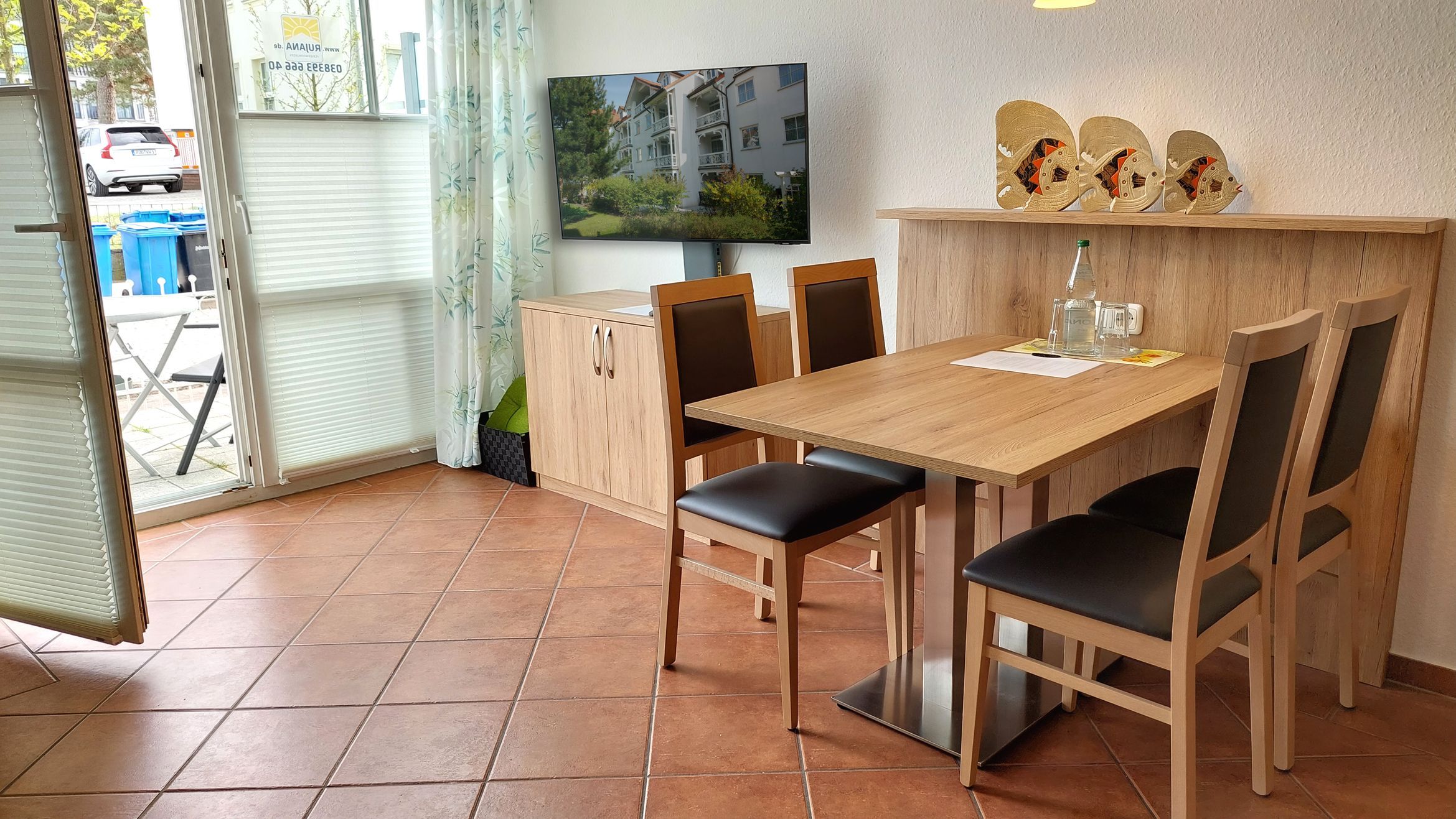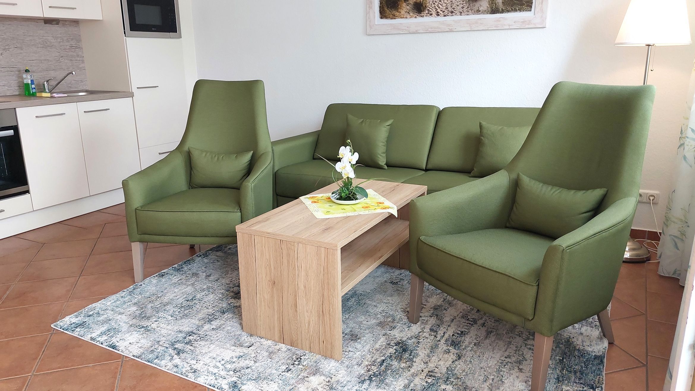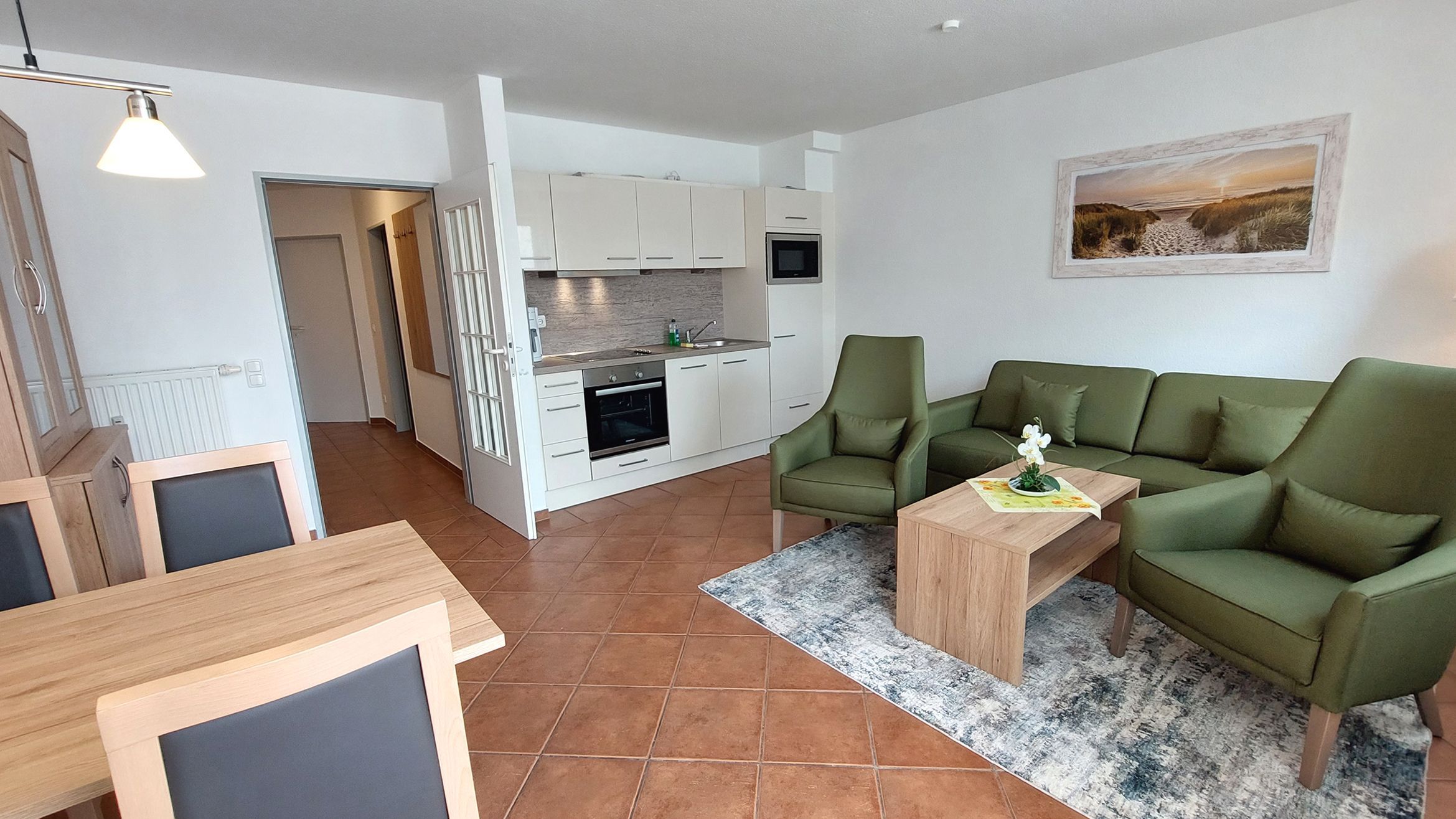 Diese schöne und helle Wohnung teilt sich auf in einen Wohnraum mit Terrassenzugang und kompletter Küchenzeile, zwei vollwertige Badezimmer, zwei separate Schlafräume und Flur. Im Wohnraum finden Sie neben der Sitzgruppe mit Sofa noch einen separaten Essplatz. Ein Flachbildfernseher und WLAN gehören zur Ausstattung.
