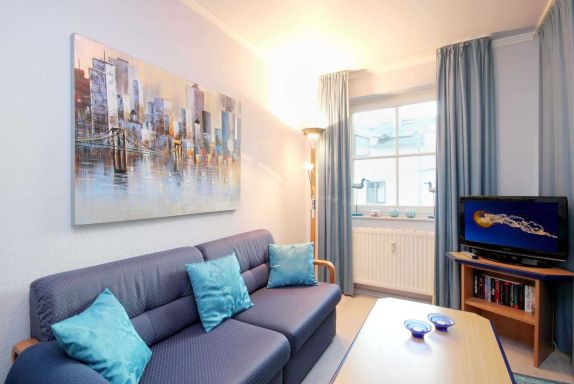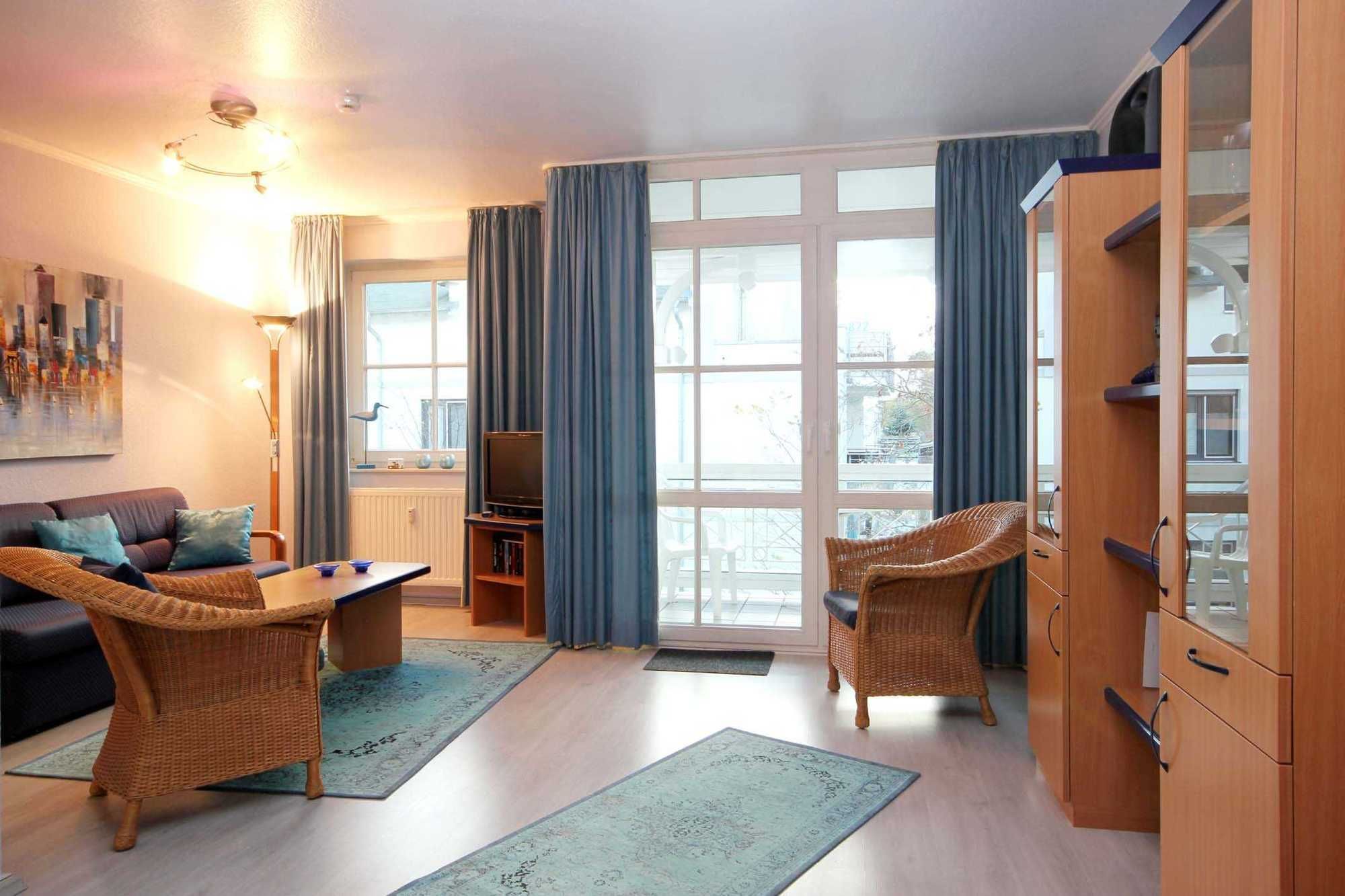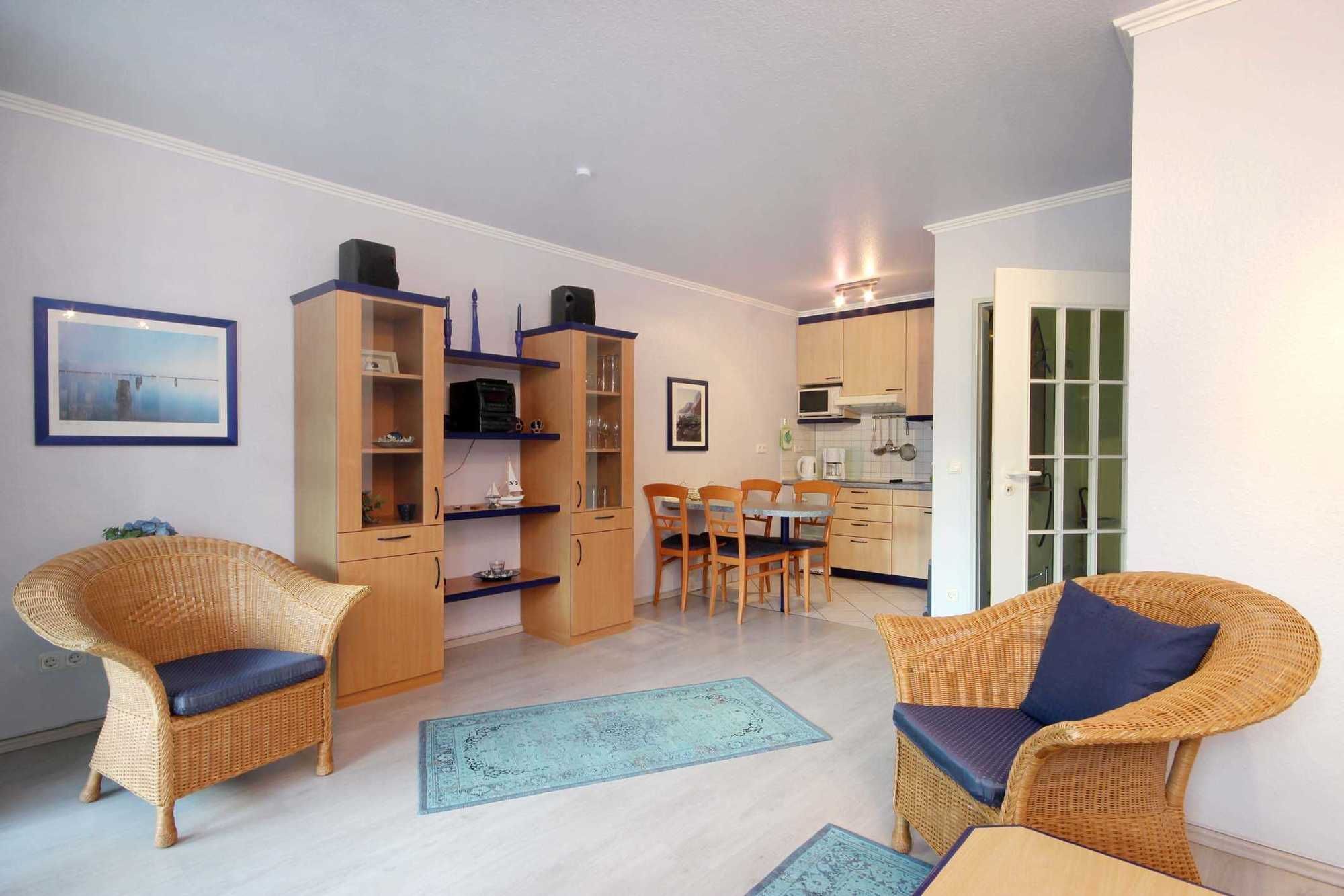 Im Wohnraum finden Sie neben der Sitzgruppe mit Schlafsofa noch einen separaten Essplatz. Ein Flachbildfernseher sowie eine Musikanlage mit CD gehören zur technischen Ausstattung. Der Schlafraum ist mit einem Doppelbett und großzügigem Kleiderschrank ausgestattet. Das Badezimmer erwartet Sie mit einem Waschbecken, Dusche und WC.