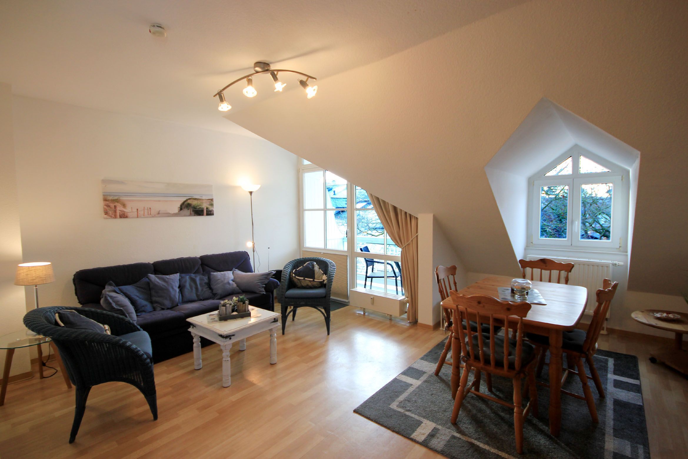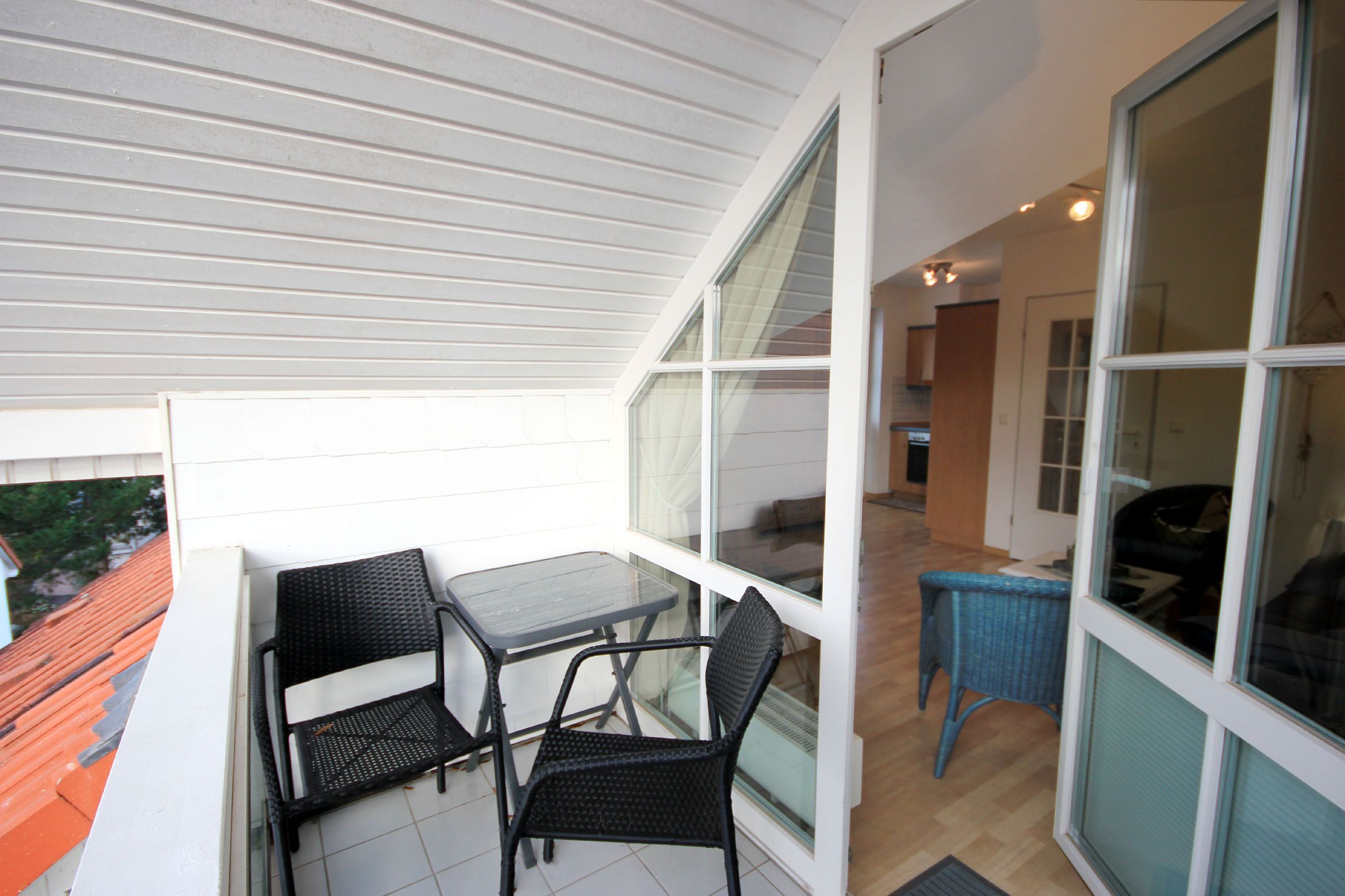 Die helle und gemütliche Wohnung teilt sich auf in einen Wohnraum mit direktem Zugang zum möblierten Balkon sowie eine komplette Küchenzeile, ein Badezimmer, ein Schlafraum und Flur mit Garderobe.