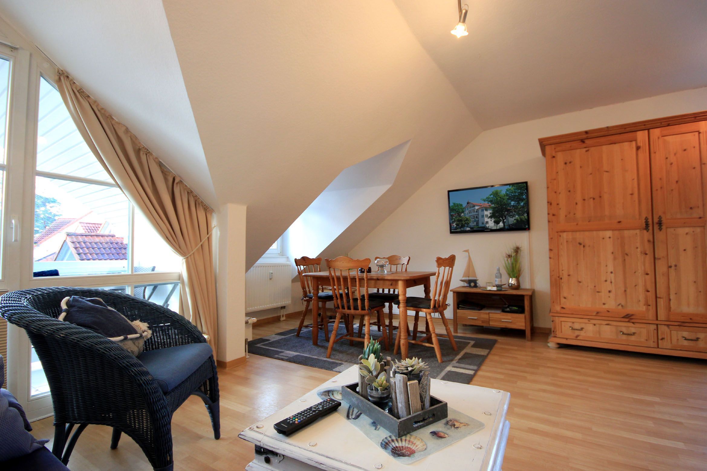Im Wohnraum finden Sie neben der Sitzgruppe mit Schlaffunktion noch einen separaten Essplatz. Ein Flachbildfernseher sowie WLAN gehören zur technischen Ausstattung. Der Schlafraum ist mit einem Doppelbett, einem großzügigen Kleiderschrank und einem zusätzlichen TV ausgestattet. Das Badezimmer erwartet Sie mit einem Waschbecken, Dusche und WC.