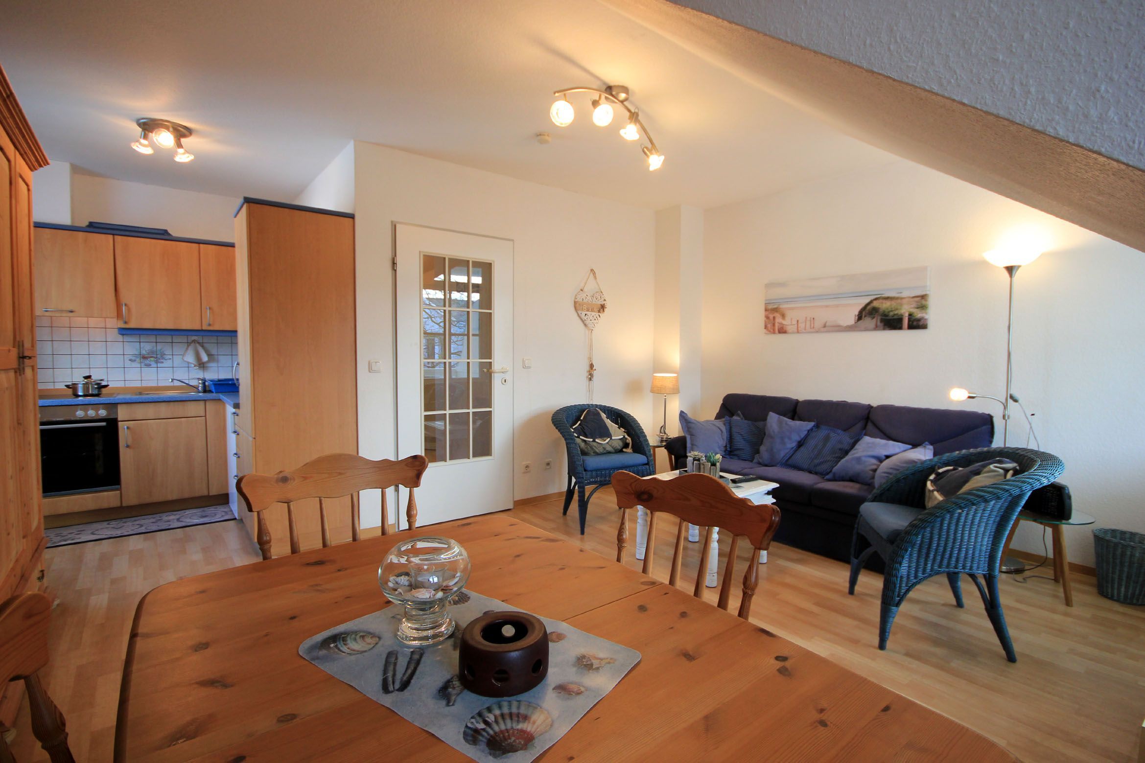 Die Wohnküche beinhaltet u.a. ein 4-Platten-Kochfeld, Kühlschrank, Kaffeemaschine, Wasserkocher, Toaster sowie umfangreiches Kücheninventar.