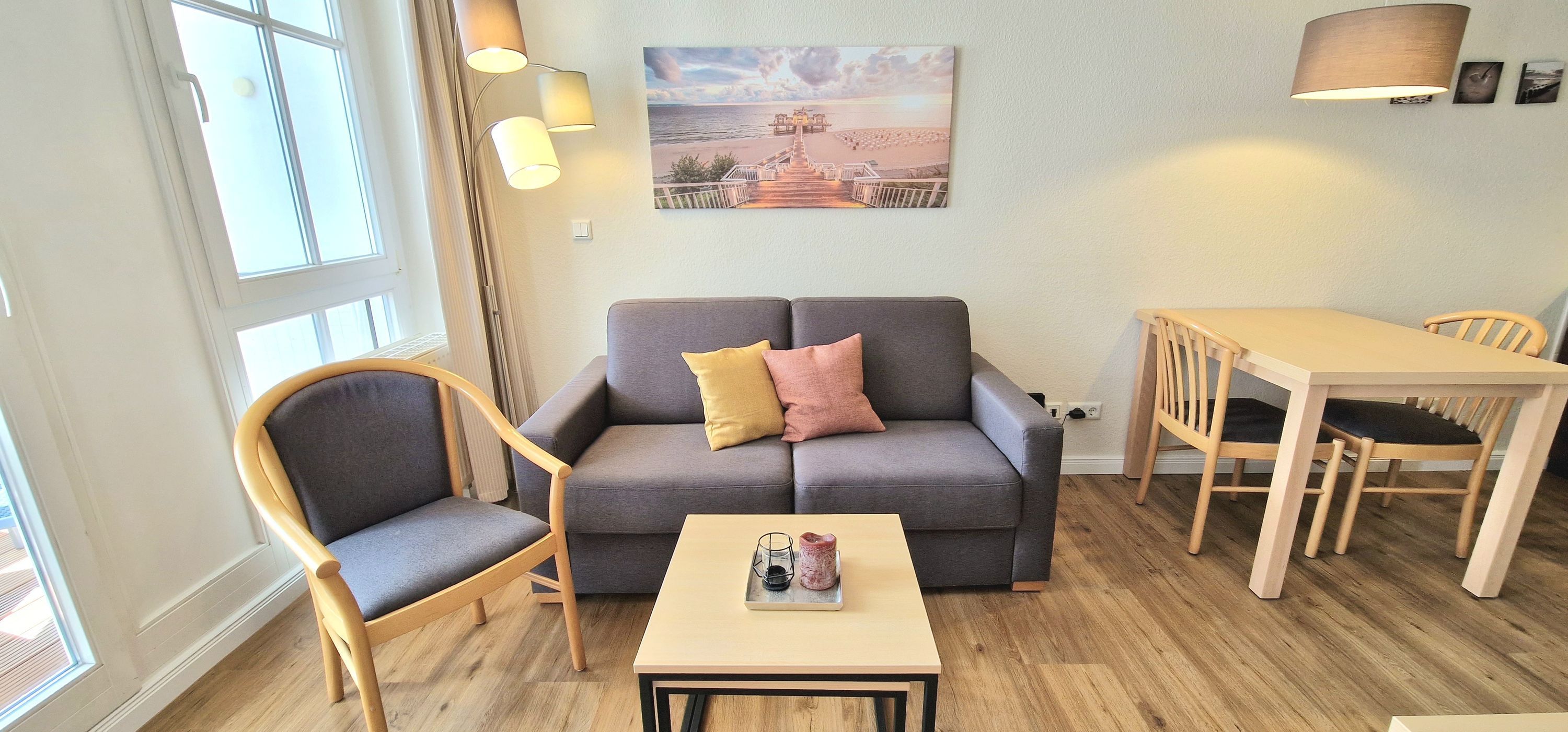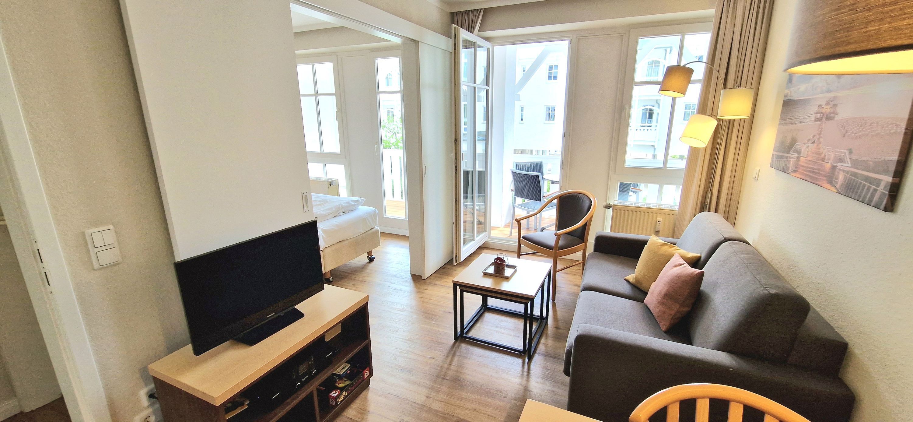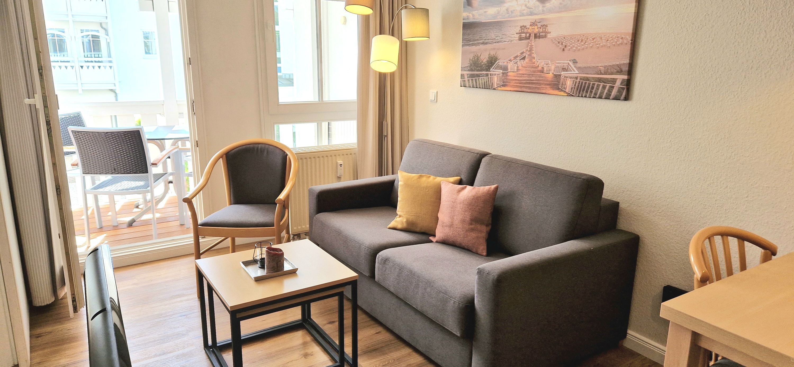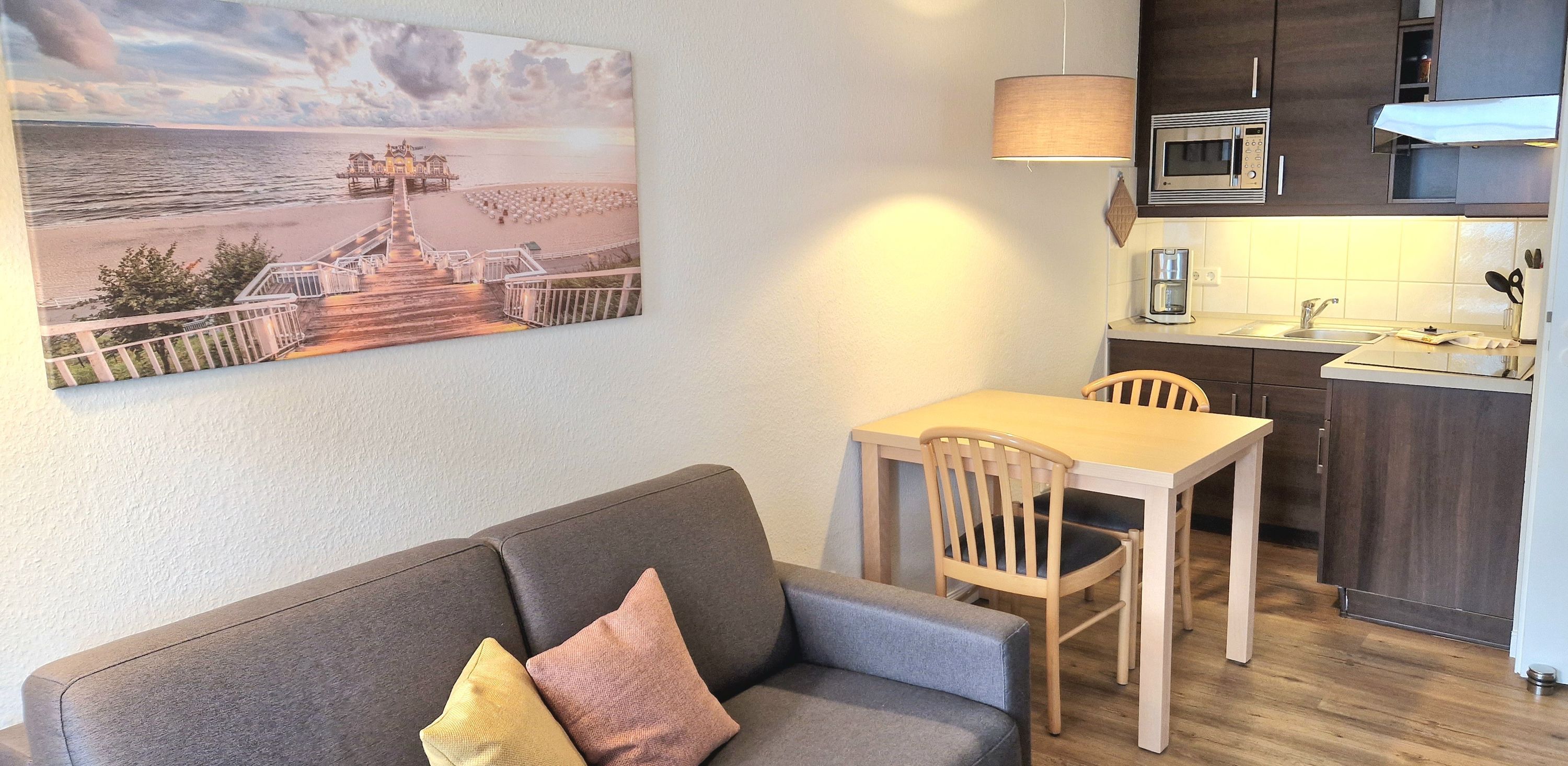 Die Ferienwohnung Fewo 308, Seepark Sellin bietet auf 32 m² Platz für maximal 3 Personen. Sie befindet sich in der 1. Etage des Hauses Haus Having und ist bequem mit einem Fahrstuhl zu erreichen. Die Ausstattung umfasst einen Flachbildfernseher, eine Filterkaffeemaschine, eine Mikrowelle, sowie Bettwäsche inklusive. Auch Haustiere sind herzlich willkommen. Außerdem verfügt die Wohnung über einen Balkon und eine offene Wohnküche.