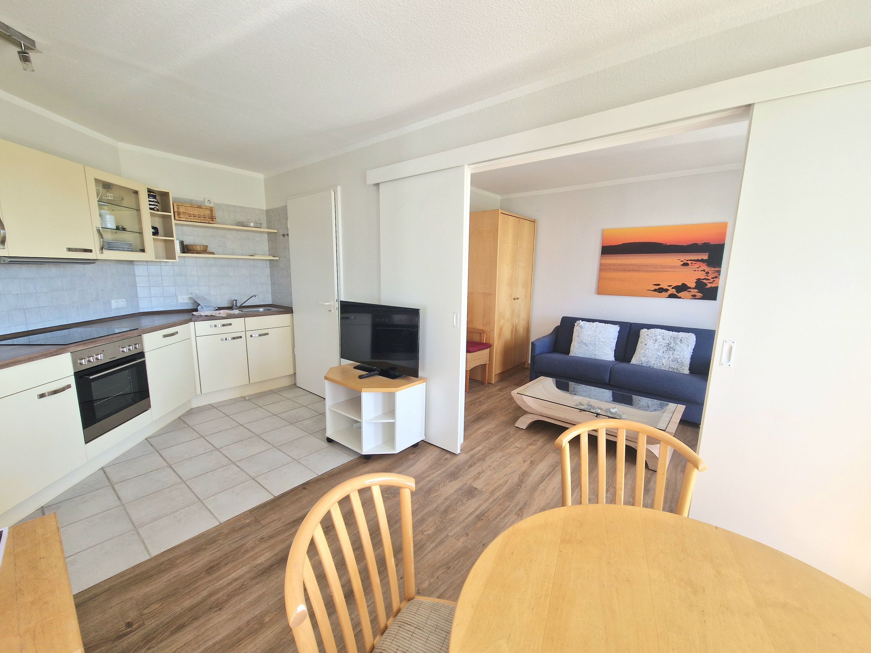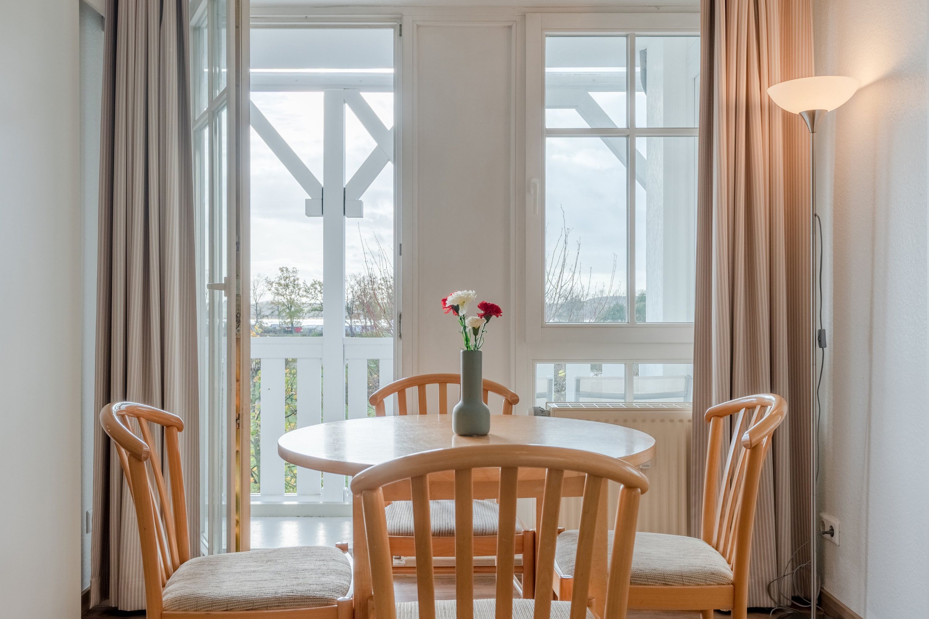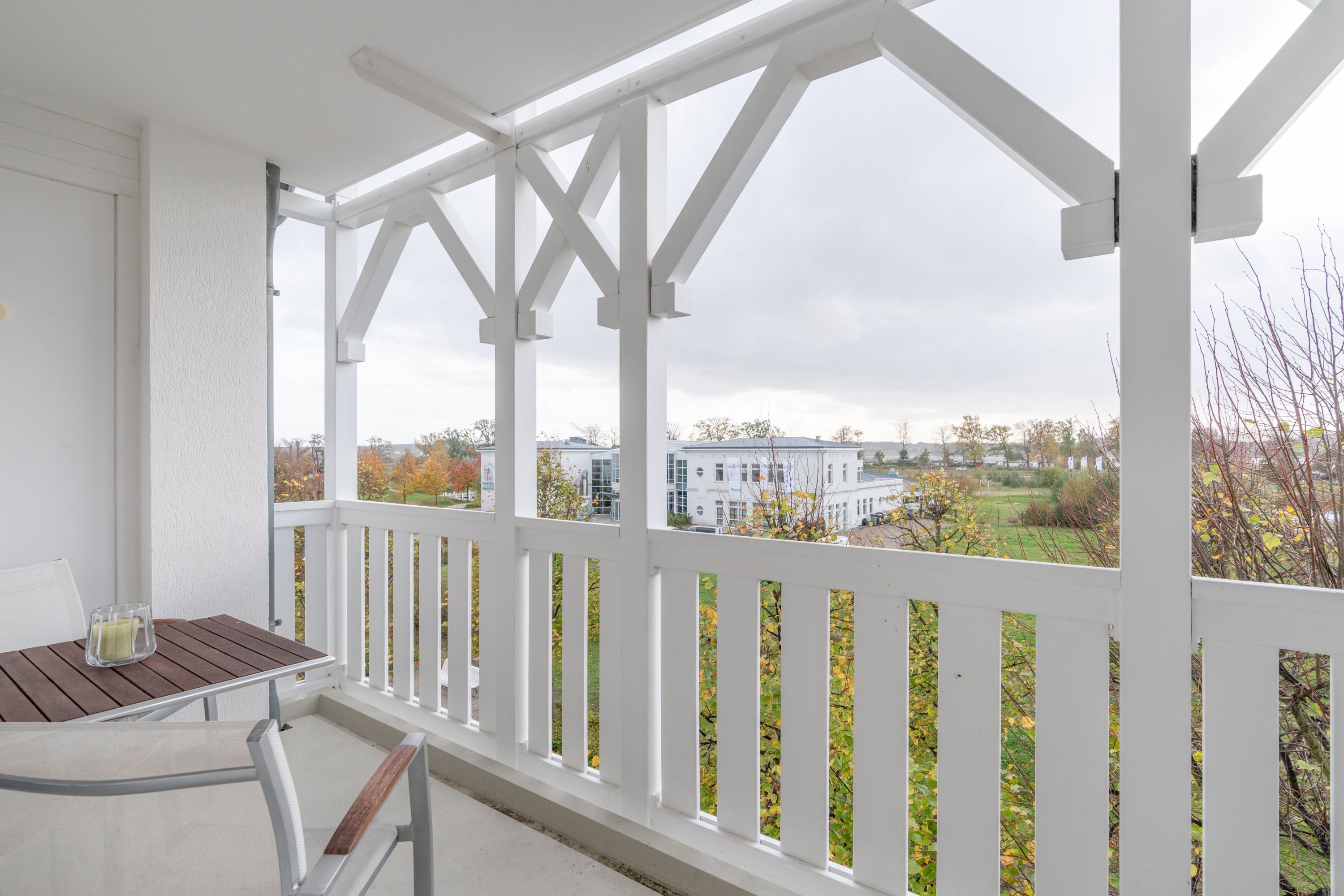 Auf dem Balkon in Südwestlage können die Gäste den Ausblick genießen und auf der Sitzgruppe entspannen. Die Ferienwohnung ist ein Nichtraucher-Apartment, jedoch ist die Mitnahme eines Haustiers erlaubt.