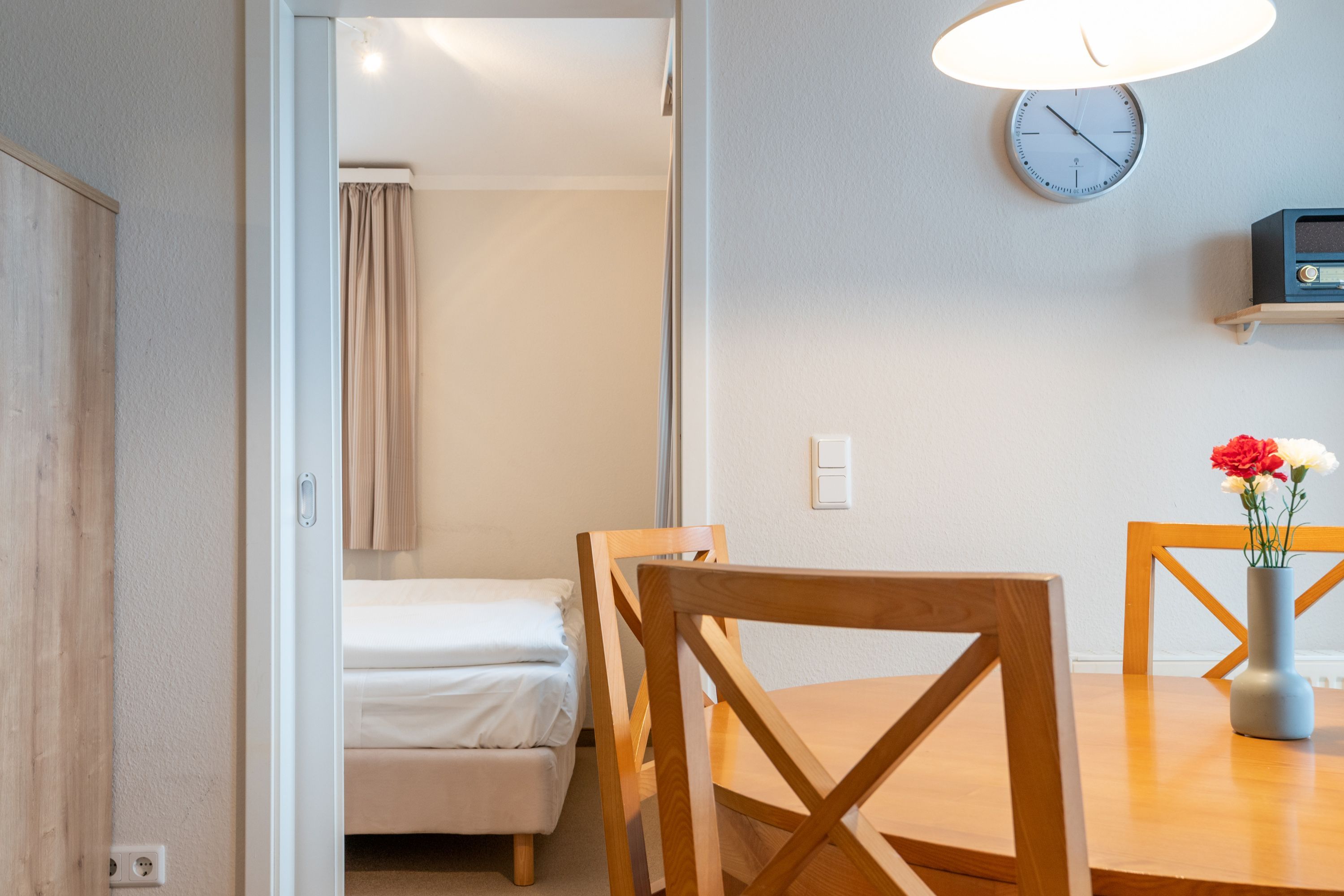 Die Ferienwohnung verfügt über kostenfreies WLAN und die Erstausstattung an Bettwäsche ist inklusive. Das Schlafzimmer mit Verdunklung verfügt über ein Doppelbett, im Wohnzimmer befindet sich zusätzlich eine Doppelschlafcouch. Darüber hinaus verfügt die Ferienwohnung über ein Bad mit Dusche/WC, Föhn und Kosmetikspiegel. Die voll ausgestattete, offene Küche mit Mikrowelle, Geschirrspüler, Kaffeemaschine und Toaster lässt keine Wünsche offen. Ein Fernseher inkl. 3 Sky-Sender rundet die Einrichtung ab.