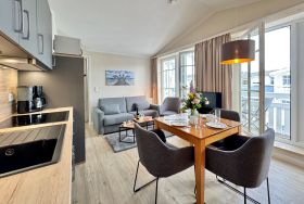 Die Ausstattung umfasst einen Flachbildfernseher, eine Kaffeemaschine mit Filter, eine Mikrowelle und Bettwäsche, die bereits im Preis inkludiert ist. Ein Balkon lädt zum Entspannen ein und die offene Wohnküche bietet genügend Platz zum gemeinsamen Kochen. Für die Unterbringung von Fahrrädern steht ein Fahrradkeller zur Verfügung. Außerdem gibt es einen WLAN-Anschluss und ein Fernseher mit Sky-Sendern. Für den morgendlichen Brötchenservice ist ebenfalls gesorgt.