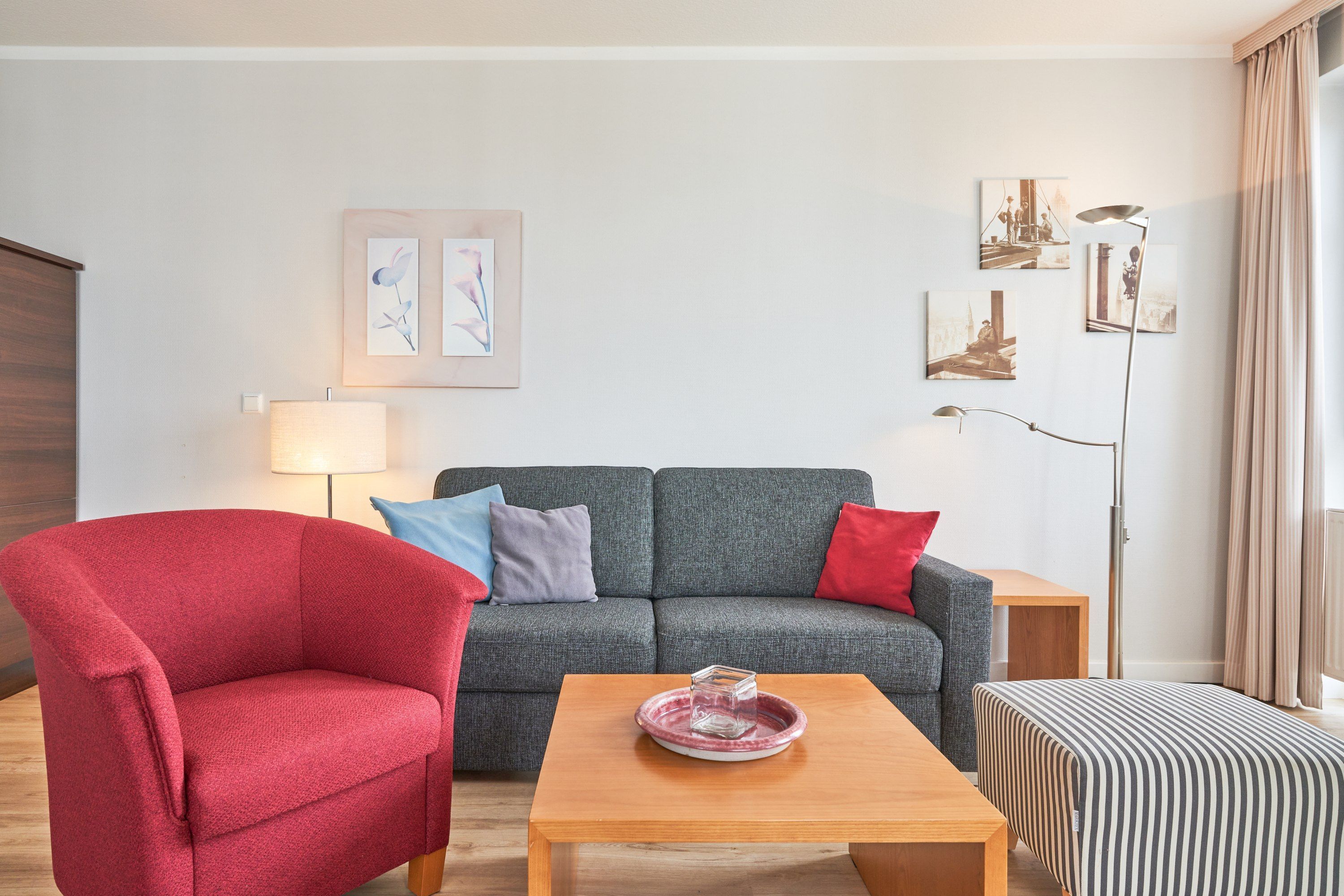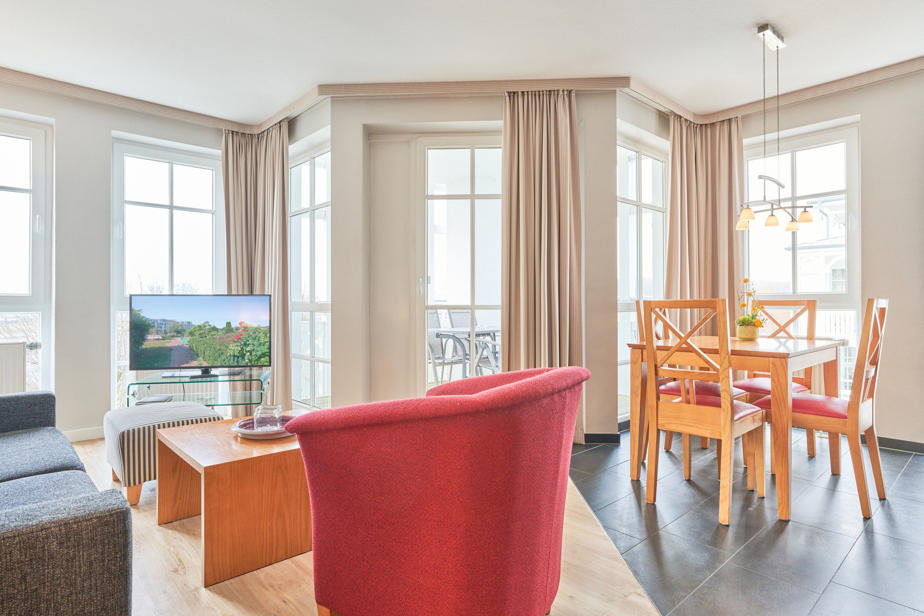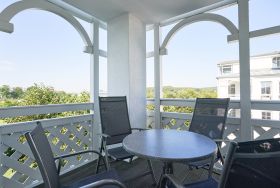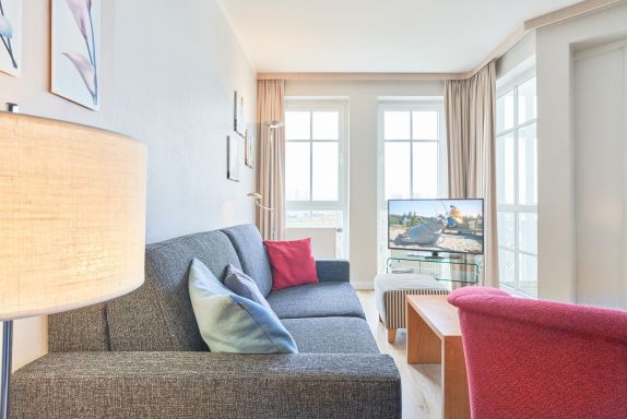 Auf dem Balkon in Südwestlage können die Gäste den Ausblick und die Sitzgruppe nutzen, um sich zu entspannen. Die Wohnung ist ein Nichtraucher-Apartment und es sind keine Haustiere erlaubt.