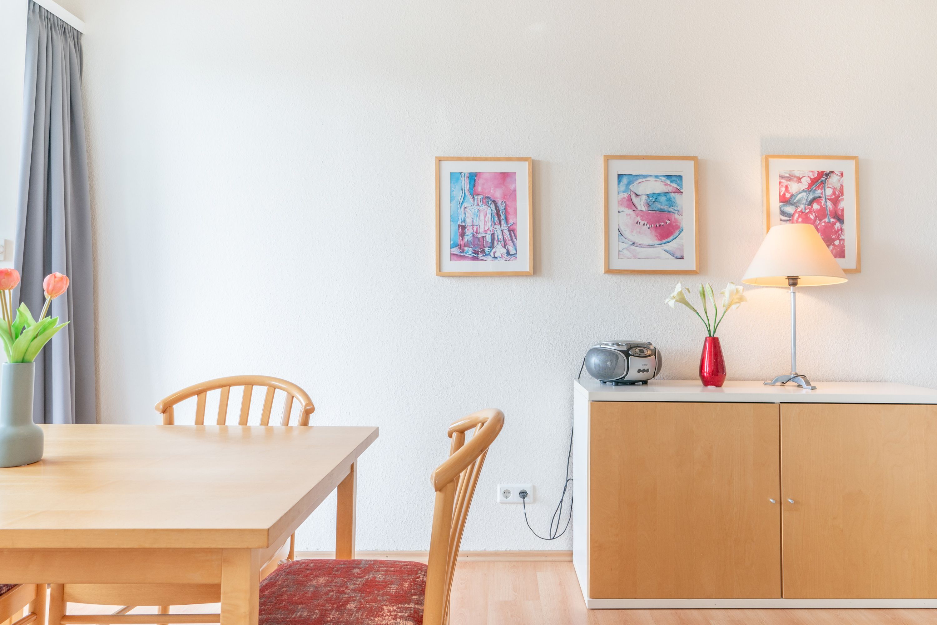 Zur Ausstattung der Ferienwohnung gehören kostenloses WLAN und eine Erstausstattung an Bettwäsche. Das Schlafzimmer verfügt über Verdunklungsvorhänge und ein Doppelbett, im Wohnzimmer steht zusätzlich eine Doppelschlafcouch zur Verfügung. Auch ein Bad mit Dusche und WC sowie eine voll ausgestattete offene Küche mit Mikrowelle, Kaffeemaschine und Toaster sind vorhanden. Ein Fernseher mit 3 Sky-Sendern rundet die Einrichtung ab. Auf dem Balkon in Südostlage können die Gäste den Ausblick und die Sitzgruppe genießen und sich entspannen. Die Wohnung ist Nichtraucher und Haustiere sind nicht erlaubt.
