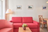 Zur Ausstattung der Ferienwohnung gehören kostenfreies WLAN und eine Erstausstattung an Bettwäsche. Das Schlafzimmer verfügt über ein Doppelbett und Verdunklungsmöglichkeiten. Im Wohnzimmer gibt es zusätzlich eine Doppelschlafcouch. Das Badezimmer ist mit einer Dusche, einem WC, einem Föhn und einem Kosmetikspiegel ausgestattet. Die offene Küche bietet alles, was man für die Zubereitung von Mahlzeiten benötigt, einschließlich einer Mikrowelle, einer Kaffeemaschine und einem Toaster. Ein Fernseher mit 3 Sky-Sendern rundet die Einrichtung ab. Auf dem Balkon in Südostlage können die Gäste den Ausblick und die Sitzmöglichkeiten genießen. Die Wohnung ist ein Nichtraucher-Apartment, in dem ein Haustier mitreisen darf.