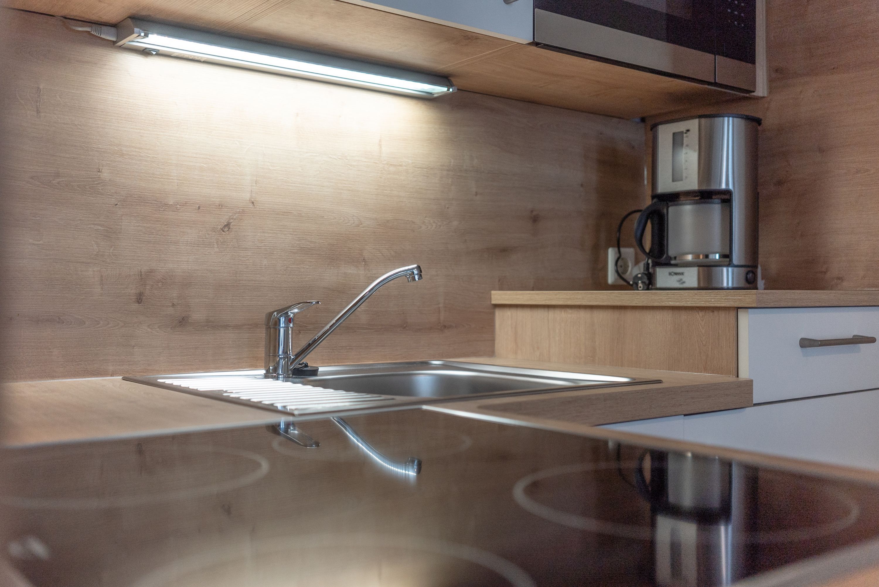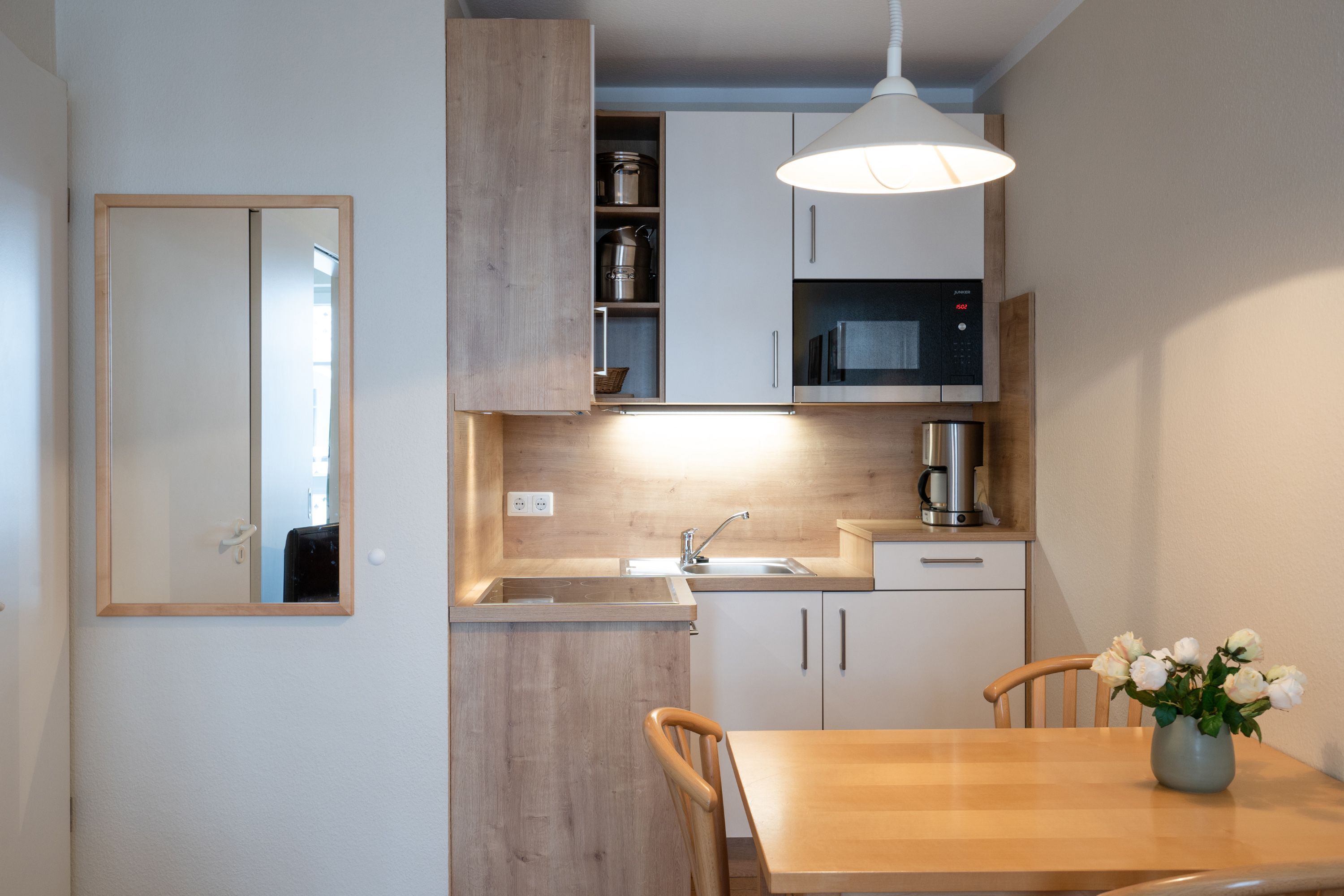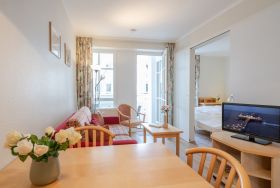 Die Ferienwohnung verfügt über kostenfreies WLAN und die Erstausstattung an Bettwäsche ist inklusive. Das Schlafzimmer verfügt über ein Doppelbett, im Wohnzimmer befindet sich zusätzlich eine Doppelschlafcouch. Darüber hinaus verfügt die Ferienwohnung über ein Bad mit Dusche/WC. Die voll ausgestattete, offene Küche mit Geschirrspüler, Mikrowelle, Kaffeemaschine und Toaster lässt keine Wünsche offen. Ein Fernseher inkl. 3 Sky-Sender rundet die hochwertige Einrichtung ab. Nach einem erlebnisreichen Urlaubstag können Sie auf dem Balkon in Nordwestlage Platz nehmen. Der Ausblick und die Sitzgruppe sorgen hier für ein wunderbares Urlaubsgefühl. Im Nichtraucher-Apartment ist ein mitreisendes Haustier gestattet.