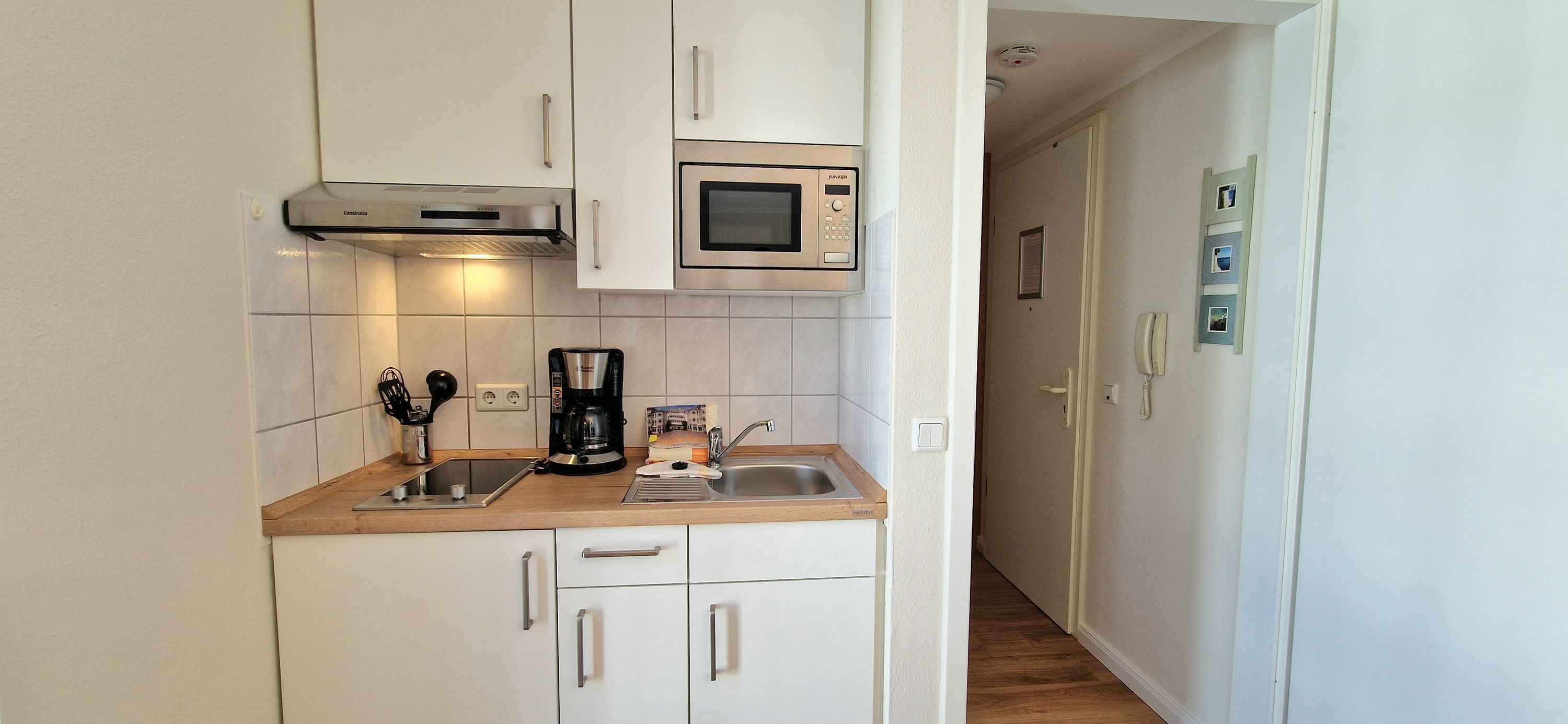 Die Ferienwohnung verfügt über kostenfreies WLAN und die Erstausstattung an Bettwäsche ist inklusive. Der kombinierte Wohn-/Schlafbereich mit Verdunklung verfügt über ein Doppelbett. Darüber hinaus verfügt die Ferienwohnung über ein Bad mit Dusche/WC. Die voll ausgestattete Pantry mit Kaffeemaschine und Toaster lässt keine Wünsche offen. Ein Fernseher inkl. 3 Sky-Sender rundet die gute Einrichtung ab.