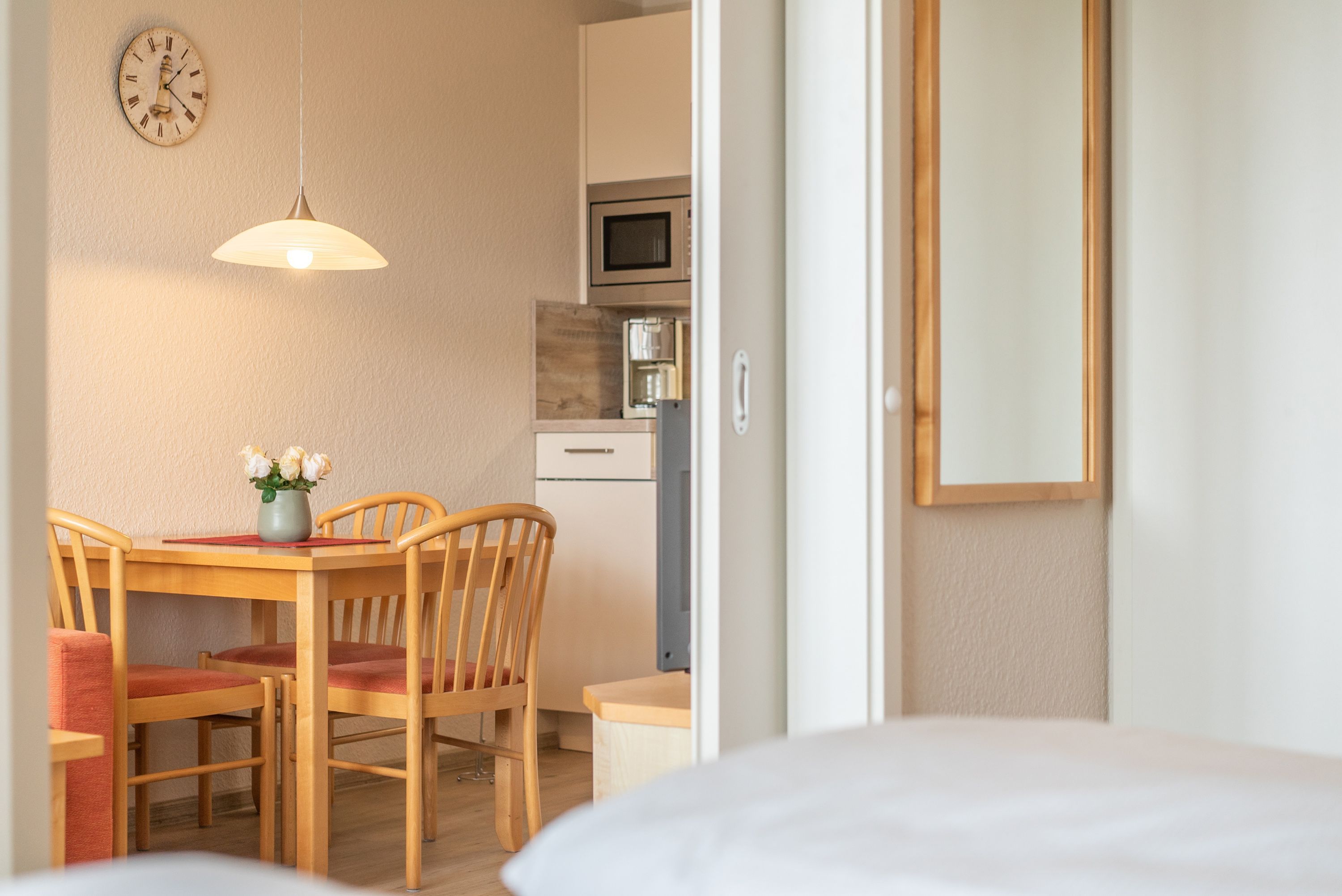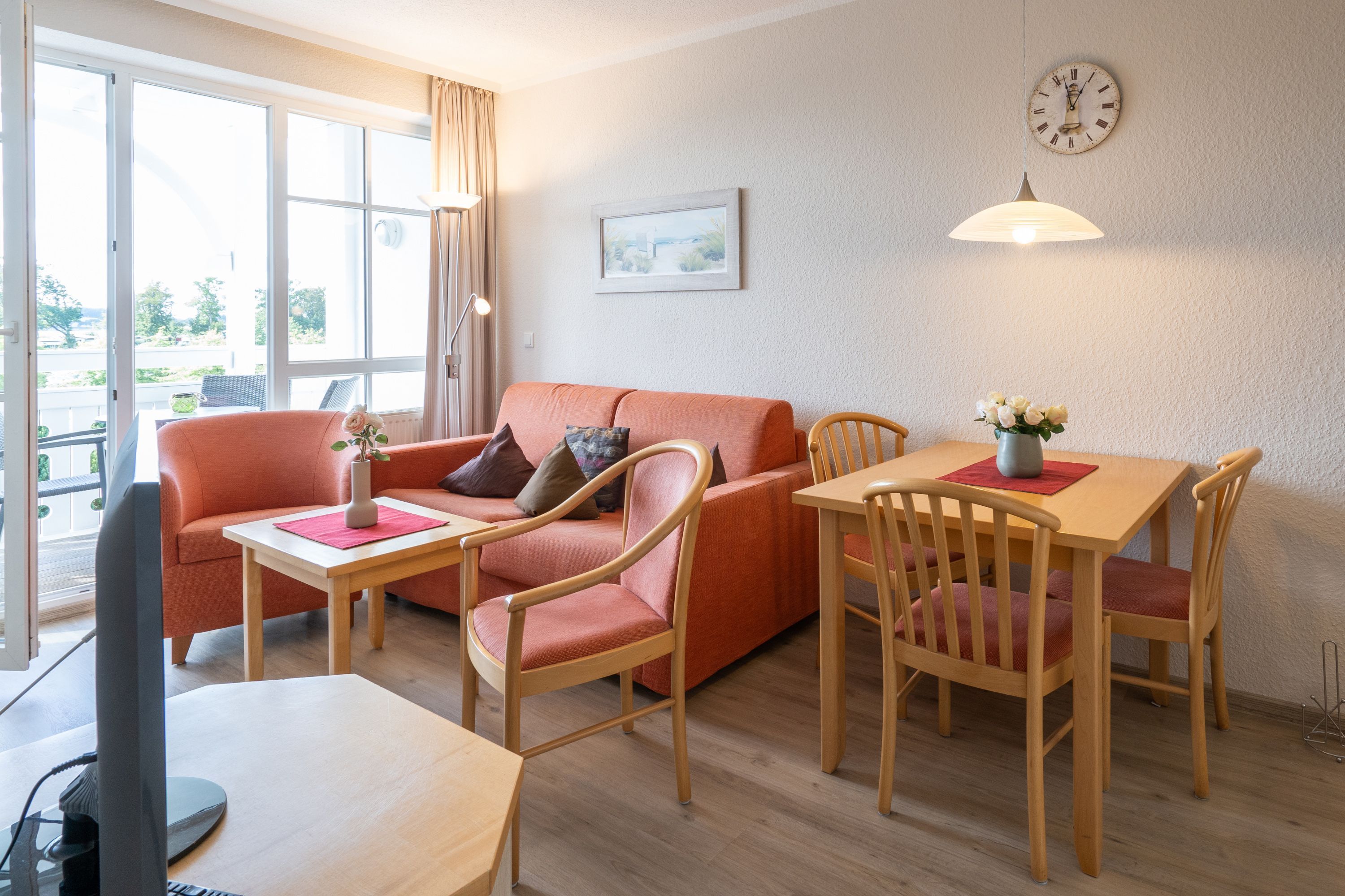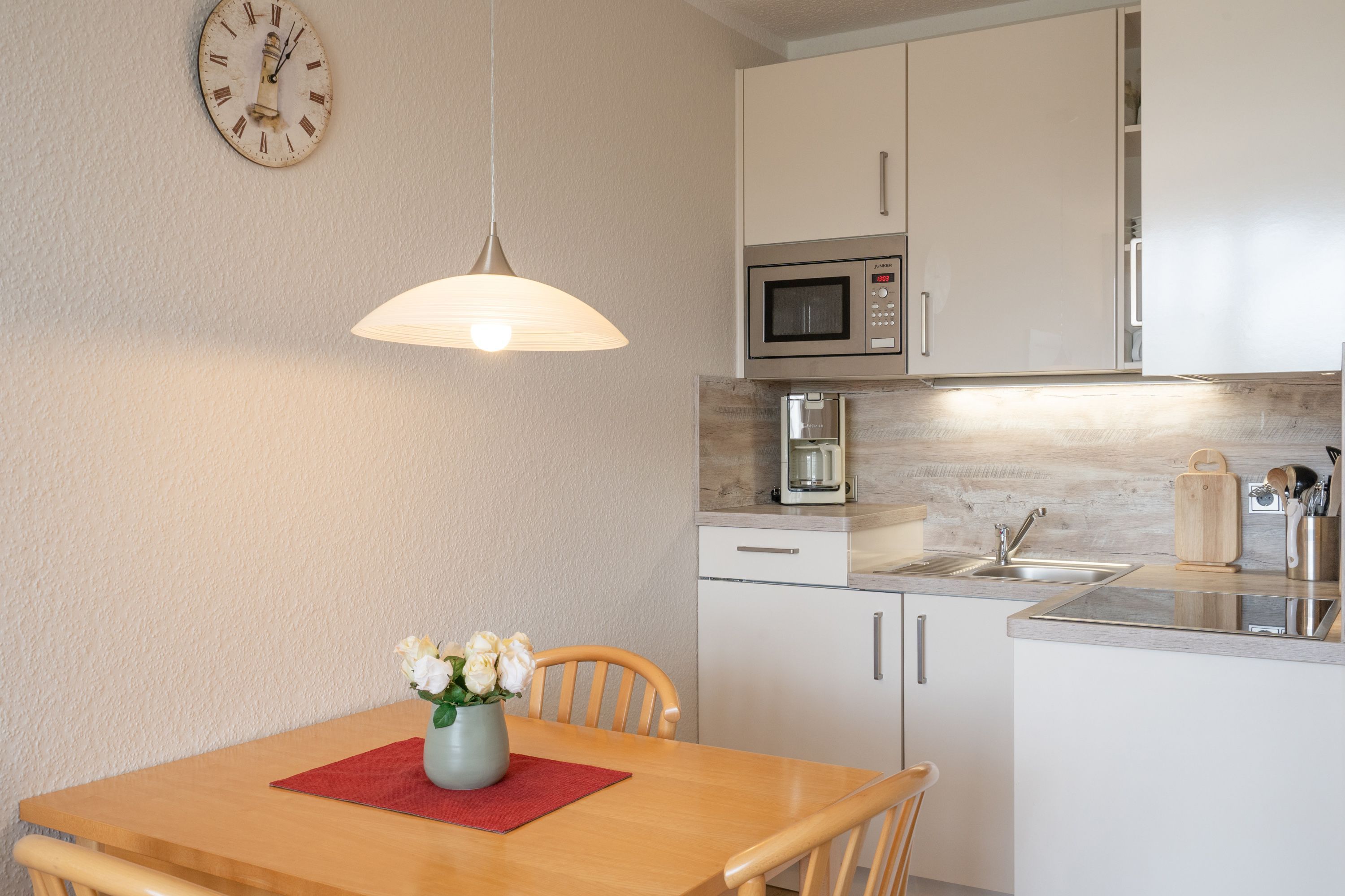 Die Ferienwohnung verfügt über kostenfreies WLAN und die Erstausstattung an Bettwäsche ist inklusive. Das Schlafzimmer mit Verdunklung verfügt über ein Doppelbett, im Wohnzimmer befindet sich zusätzlich eine Doppelschlafcouch. Darüber hinaus verfügt die Ferienwohnung über ein Bad mit Dusche/WC, Föhn sowie einem Kosmetikspiegel. Die voll ausgestattete, offene Küche mit Geschirrspüler, Mikrowelle, Kaffeemaschine und Toaster lässt keine Wünsche offen. Ein Fernseher inkl. 3 Sky-Sender rundet die hochwertige Einrichtung ab. Nach einem erlebnisreichen Urlaubstag können Sie auf dem Balkon in Südwestlage Platz nehmen. Der Ausblick und die Sitzgruppe sorgen hier für ein wunderbares Urlaubsgefühl. Im Nichtraucher-Apartment sind Haustiere nicht gestattet.