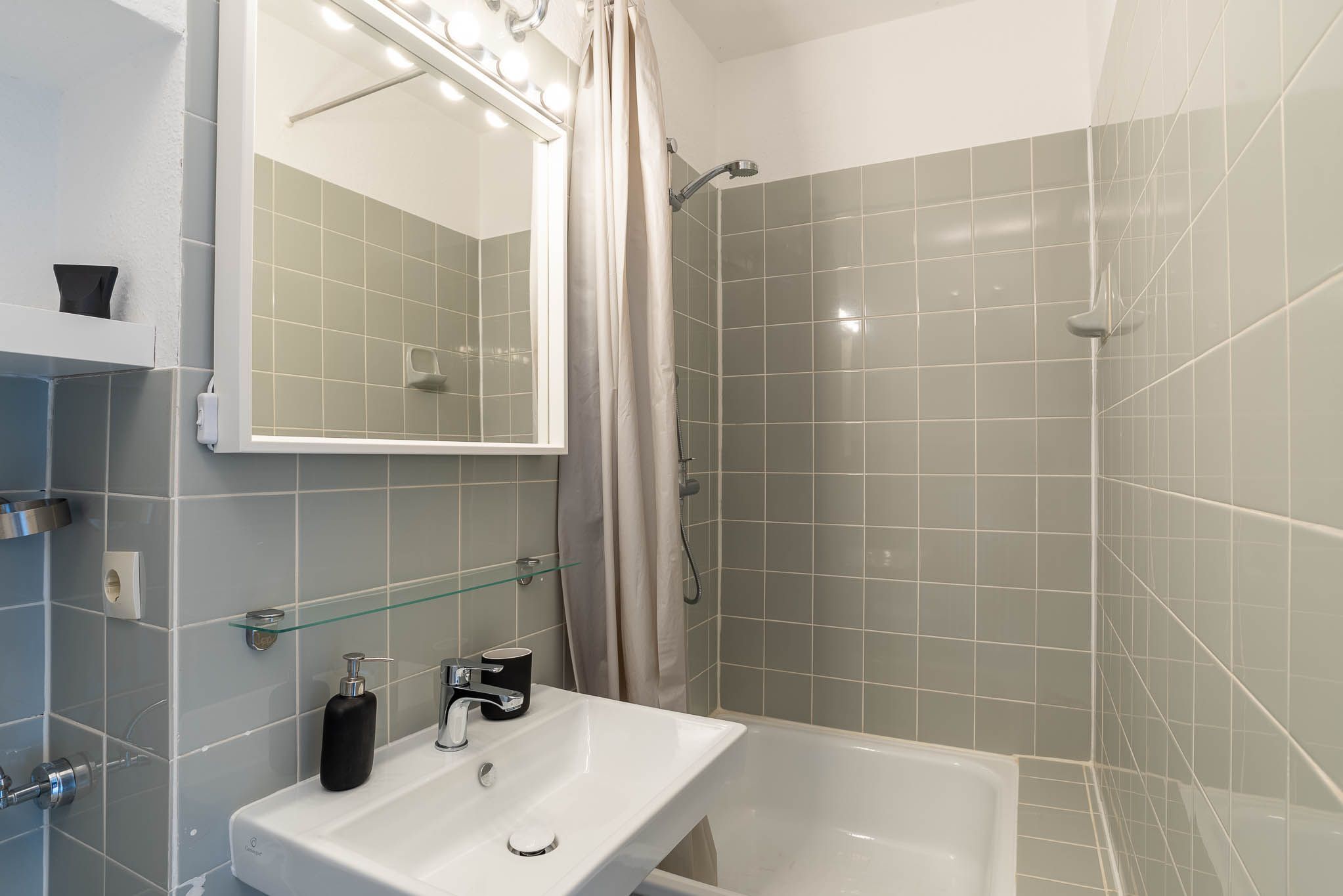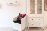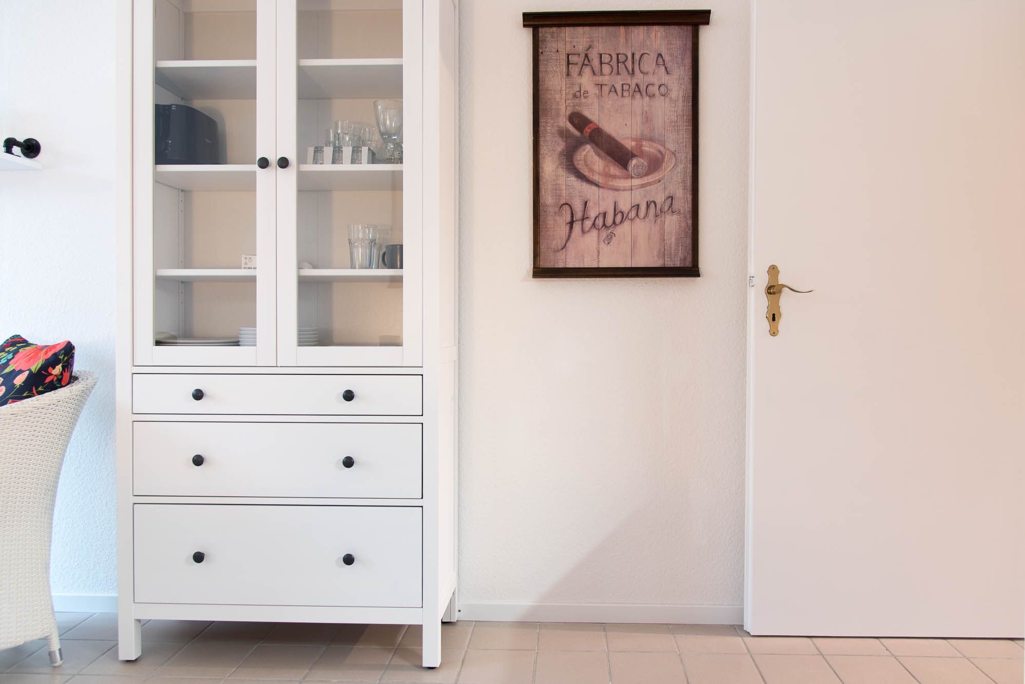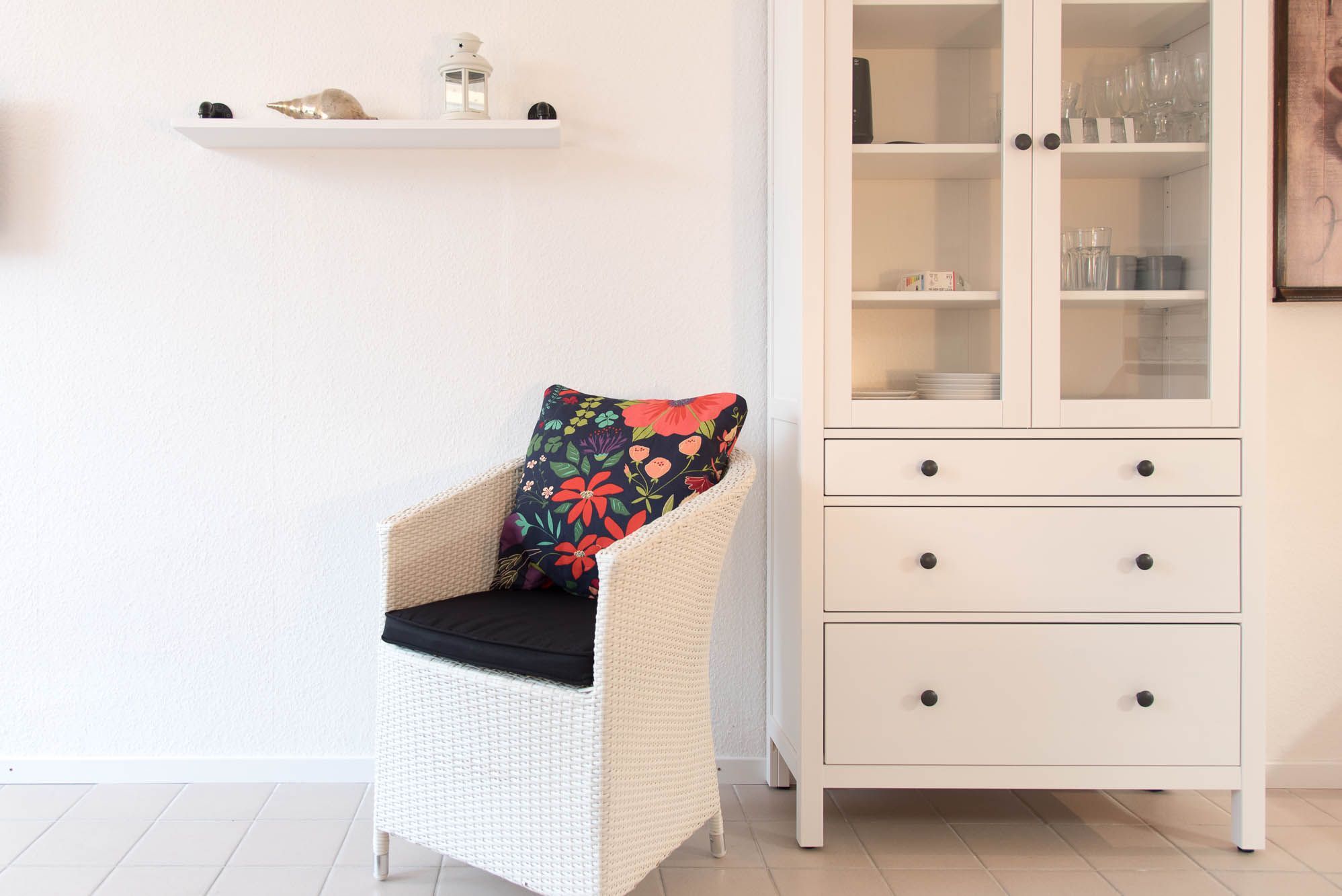 Die 1-Zimmer-Wohnung ist freundlich eingerichtet. Beim Betreten der Wohnung gelangen Sie zuerst in einen kleinen Flur mit Möglichkeiten Ihr Gepäck zu verstauen. Von hier aus erreichen Sie das voll ausgestattete Badezimmer, sowie den Wohn-, Ess-, und Schlafbereich. Das Apartment lässt sich bei Bedarf mit Gardinen abdunkeln. Zum Übernachten steht Ihnen ein Doppelbett (Liegefläche von 160 x 200 cm) zur Verfügung. Neben einer Vitrine, die ausreichend Stauraum bietet und einem Sessel ist zudem ein kleiner Flatscreen-Fernseher in diesem Apartment für Sie vorhanden.