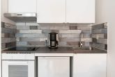 Die offene Küche ist mit gut ausgestattet, was Sie für den täglichen Bedarf benötigen: Von der Kaffeemaschine über das Ceran-Kochfeld, den Ofen, Toaster, Kühlschrank mit Gefrierfach bis hin zum Wasserkocher und ausreichendem Geschirr und Gläser, sollte es Ihnen an nichts fehlen. An der Küchenzeile schließt sich der Essbereich mit einem Tisch und zwei Stühlen an.