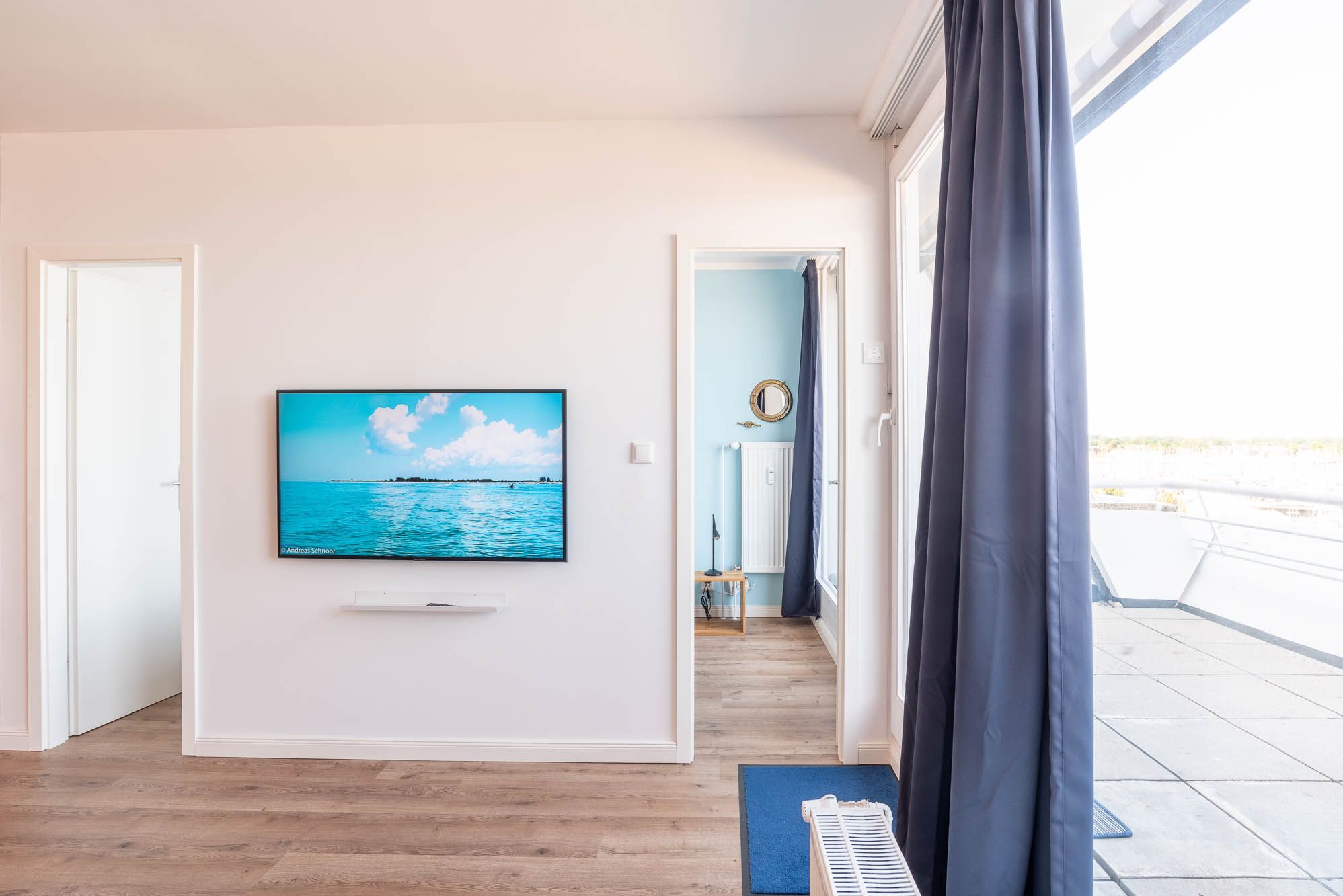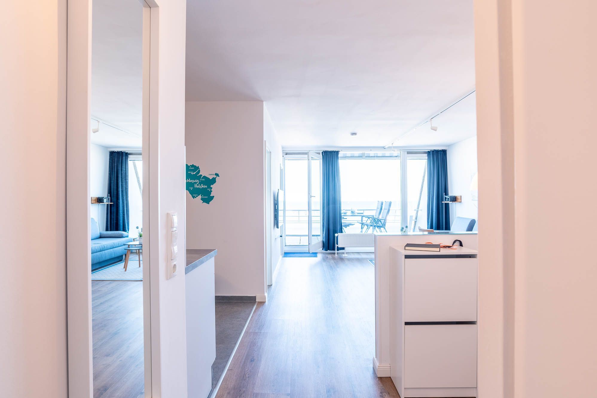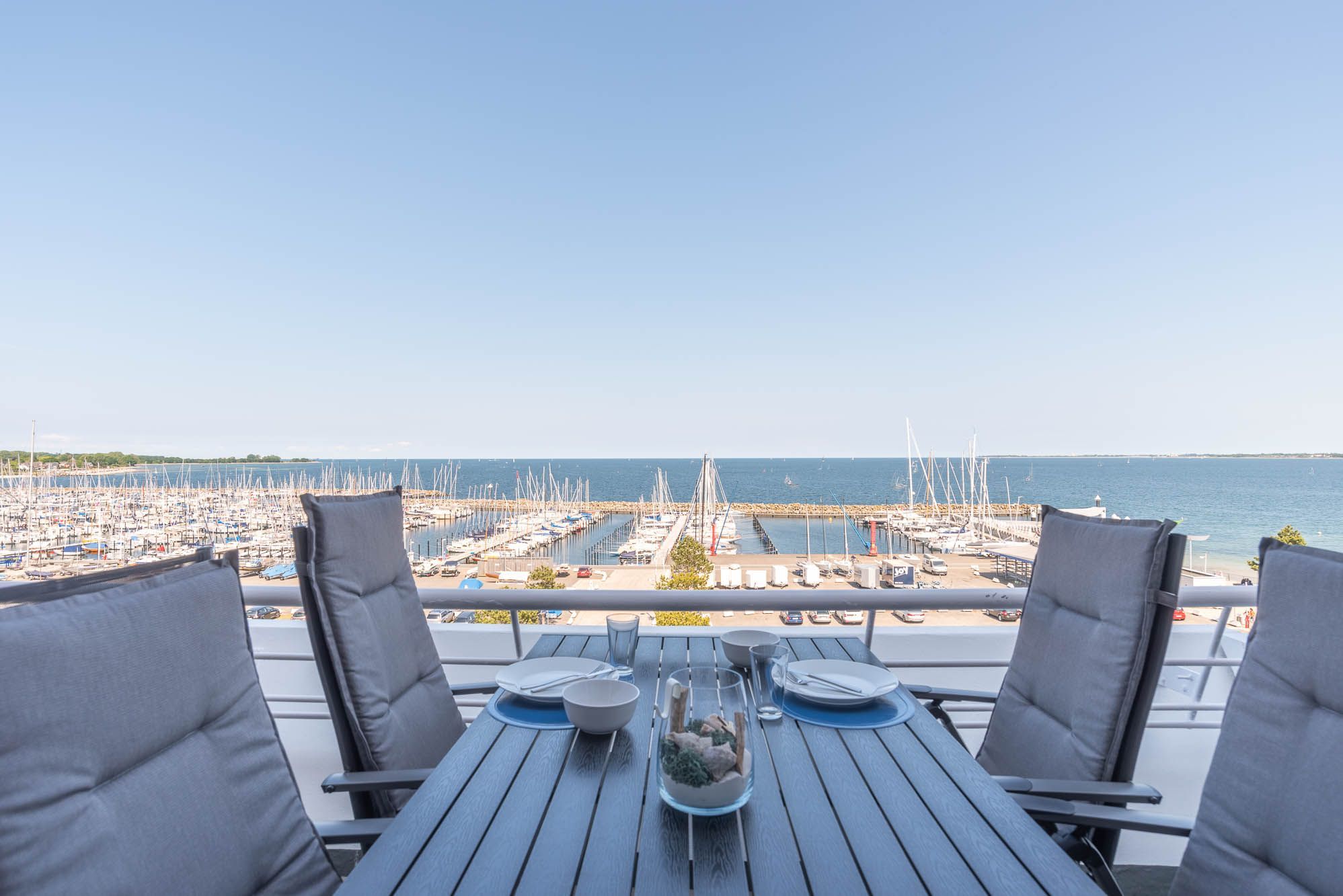 Der Balkon, welcher sich über die gesamte Breite des Apartments verläuft, ist mit Tisch und Stühlen sowie einer Markise ausgestattet. Durch östliche Ausrichtung genießen Sie den Sonnenaufgang mit Blick auf die Förde und können in aller Ruhe frühstücken und die Sonne bis zum Mittag in vollen Zügen genießen.