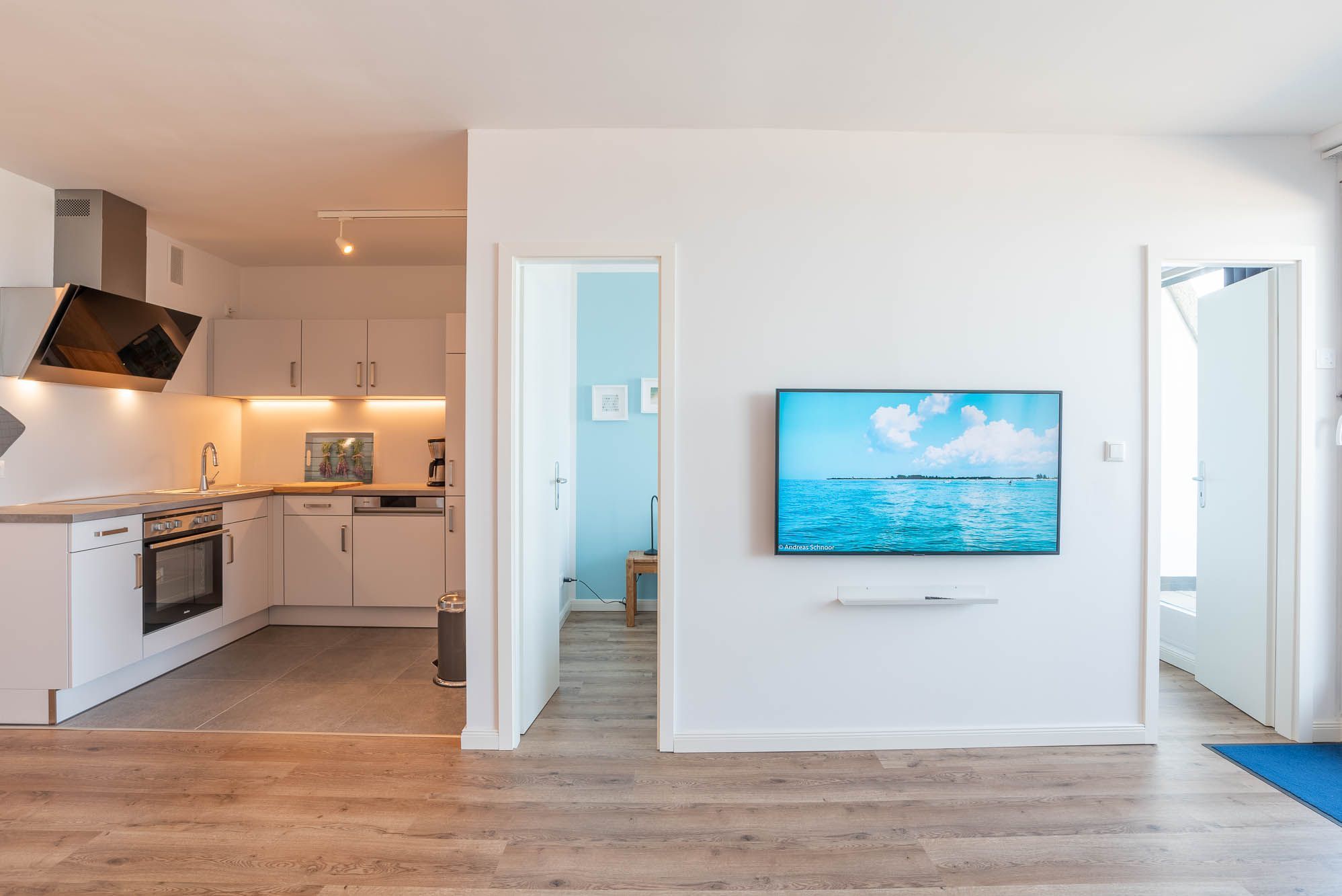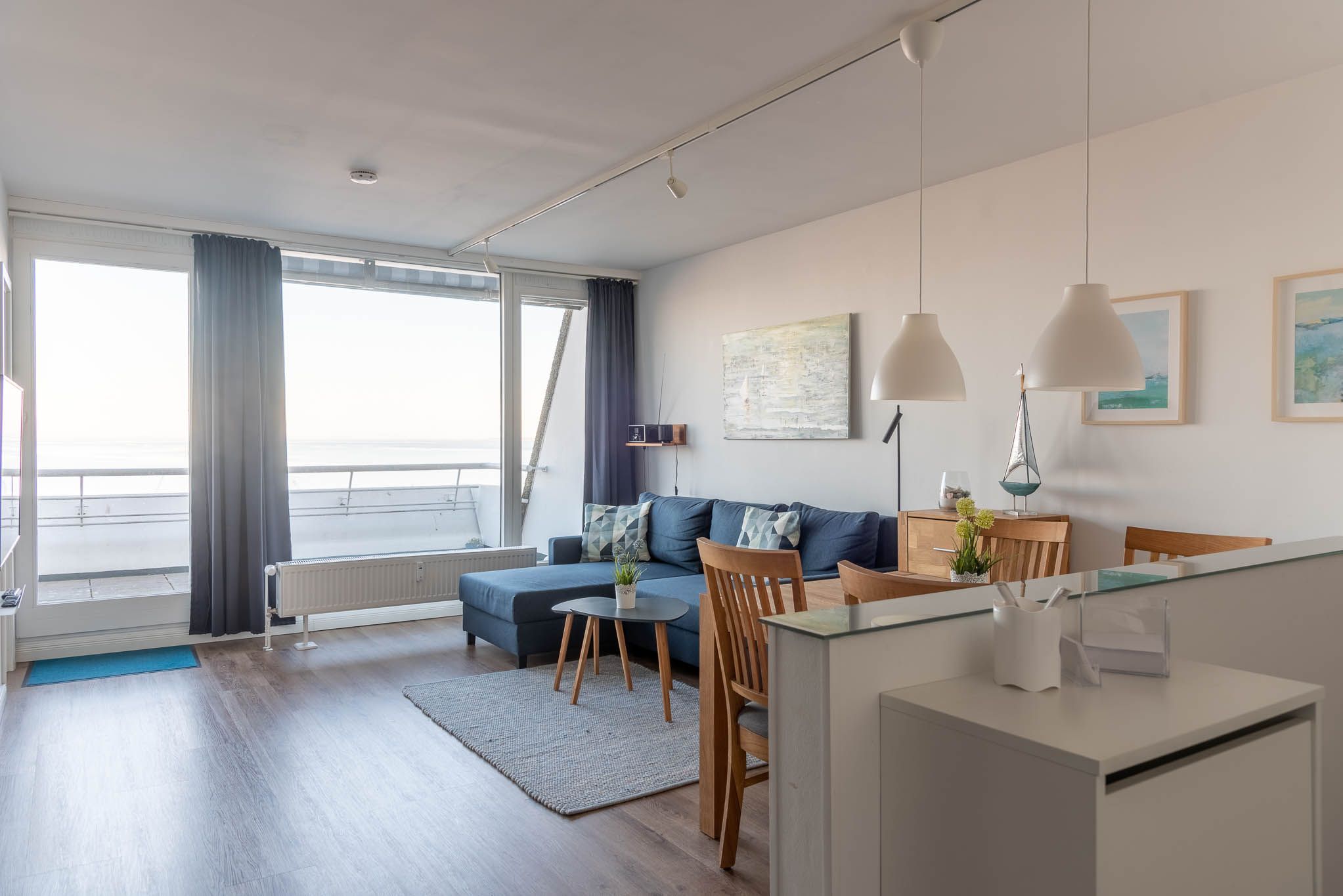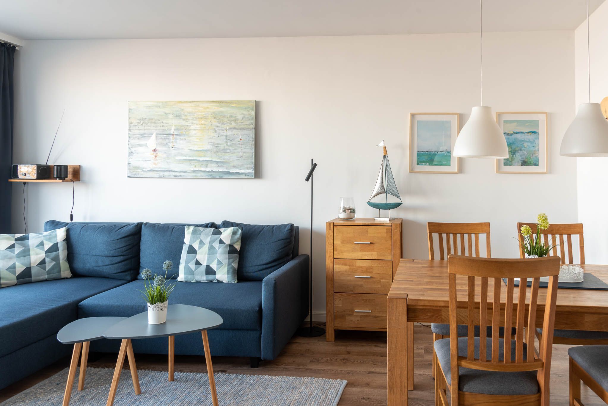 Die bodentiefe Fensterfront lässt die Wohnung hell erscheinen. Selbstverständlich lassen sich mit Gardinen die Ferienwohnung abdunkeln. Der Wohnbereich ist großzügig geschnitten und verfügt über eine gemütliche Couch. Mit nur wenigen Handgriffen lässt sie sich in ein bequemes Schlafsofa (140cm x 200cm) umwandeln und bietet weiteren Platz für eine Person. Von der Couch aus lassen gemütliche Fernsehabende keine Wünsche offen: Ein LCD-Fernseher mit USB- und Kabelanschluss bietet die Möglichkeit Ihr Heimkino auch im Urlaub zur Verfügung zu haben. Die Ferienwohnung ist außerdem mit kostenlosem WLAN und einem DAB-Radio ausgestattet.