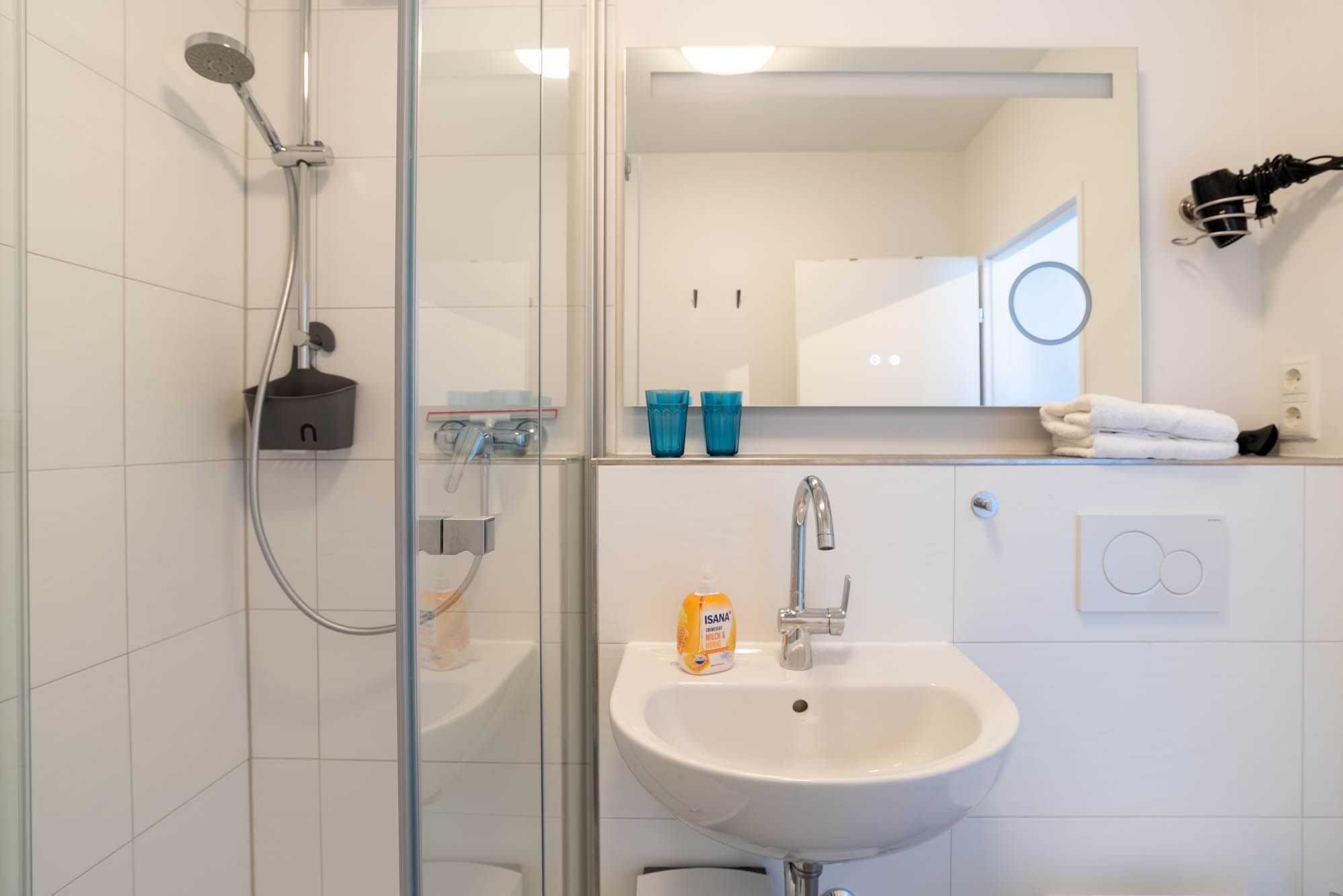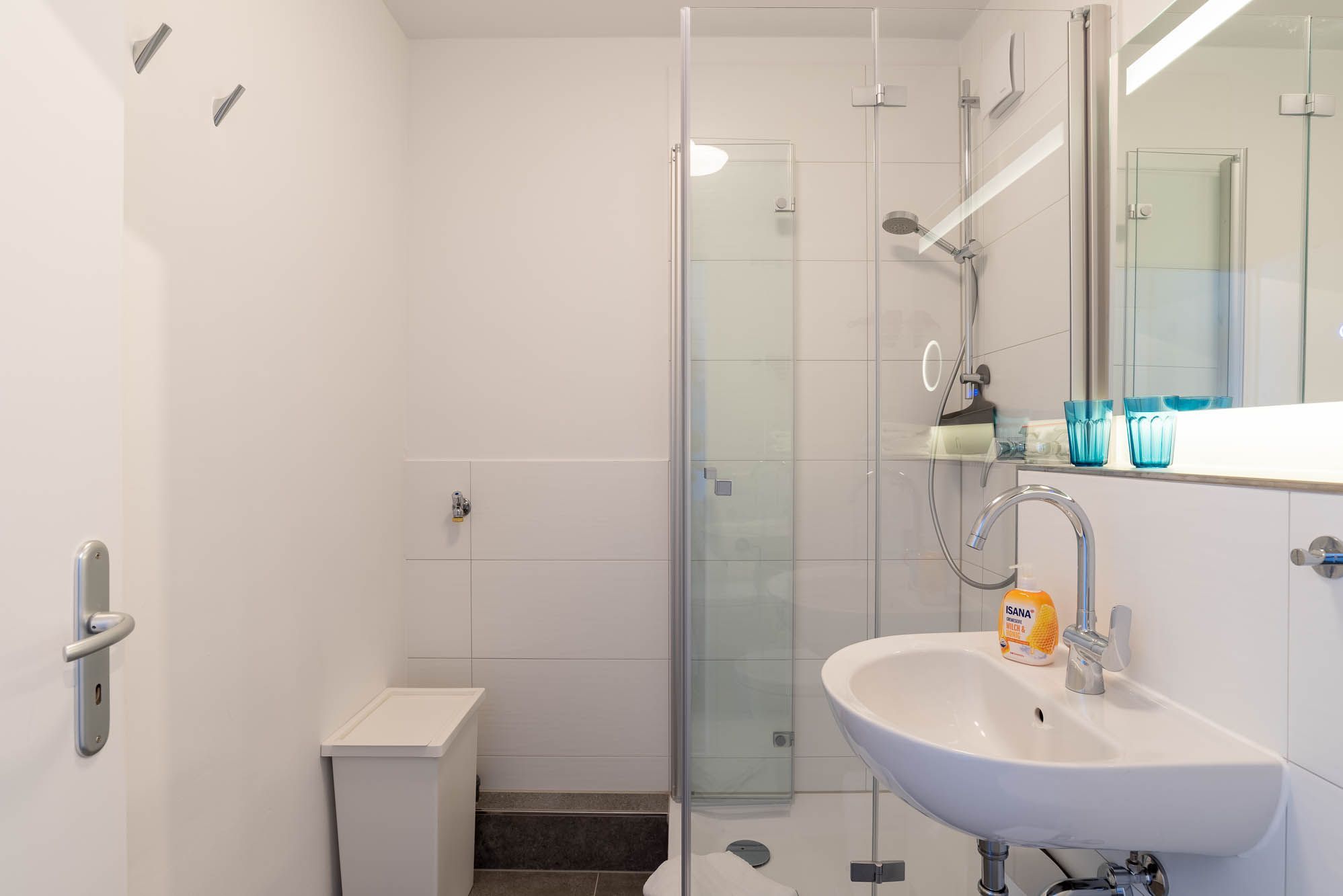 Durch eine eingezogene halbhohe Wand wird der Eingangsbereich optisch vom Wohn- und Essbereich getrennt. Somit bekommt das Apartment einen loftartigen-Charakter. Im Flurbereich befinden sich eine Abstellkammer und ein Kleiderschrank. Direkt angrenzend befindet sich das gepflegte Badezimmer, welches neben einem WC, einer Dusche und Waschbecken mit einem großen Spiegel und dimmbaren Licht ausgestattet ist.
