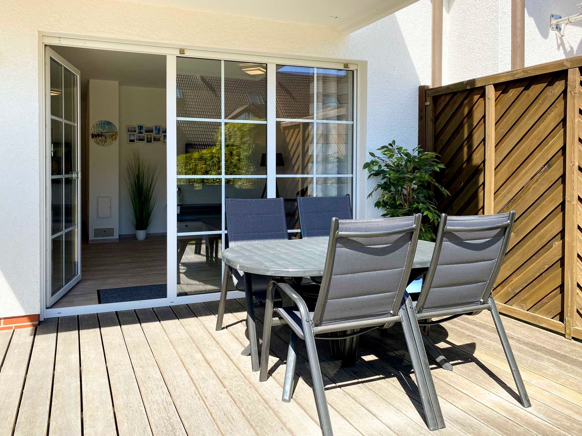 • Terrasse und Garten: Umzäunter Garten mit Terrasse, ausgestattet mit Sonnenliegen und Sonnenschirm