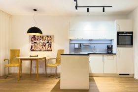 • Küche: Offene, voll ausgestattete Küche mit Backofen, Geschirrspüler, Kühlschrank, Toaster, Filterkaffeemaschine, Wasserkocher und großzügigem Stauraum