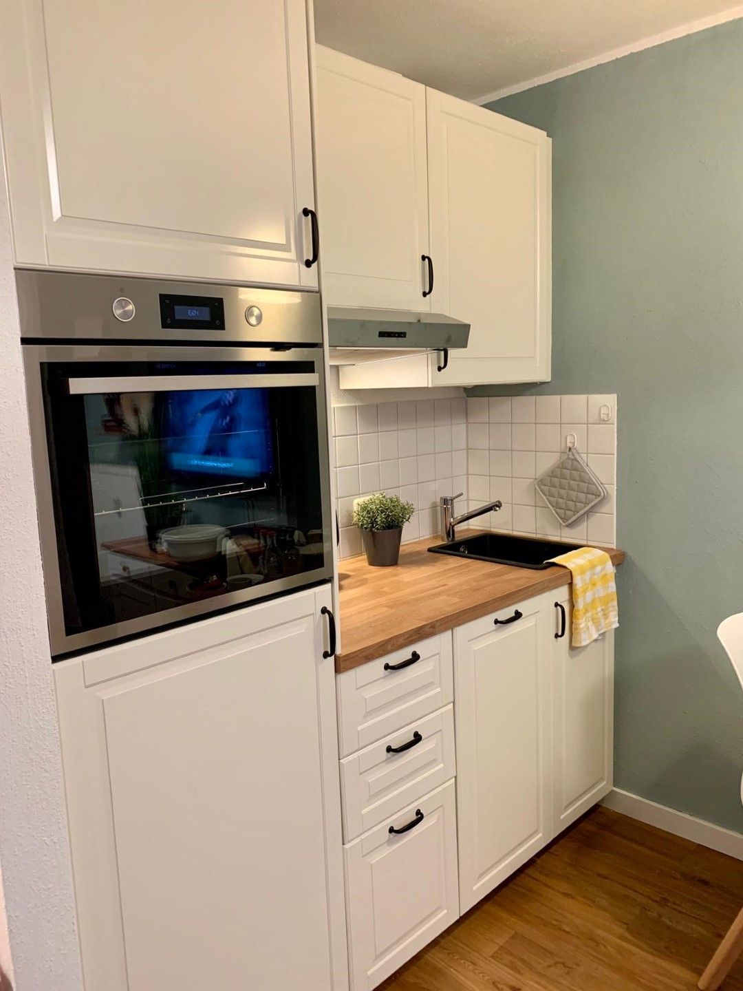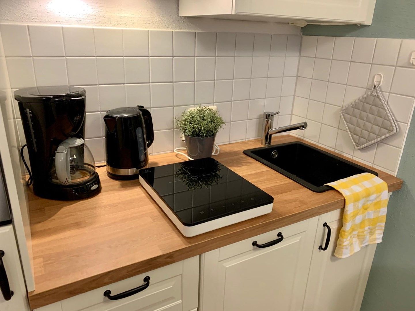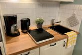 An den Wohn-Schlafbereich grenzt die kleine Küchenzeile, welche gut ausgestattet ist. Hier finden Sie einen Induktionherd, Geschirrspüler, Backofen, Toaster, Kaffeemaschine, Wasserkocher und natürlich genügend Geschirr.