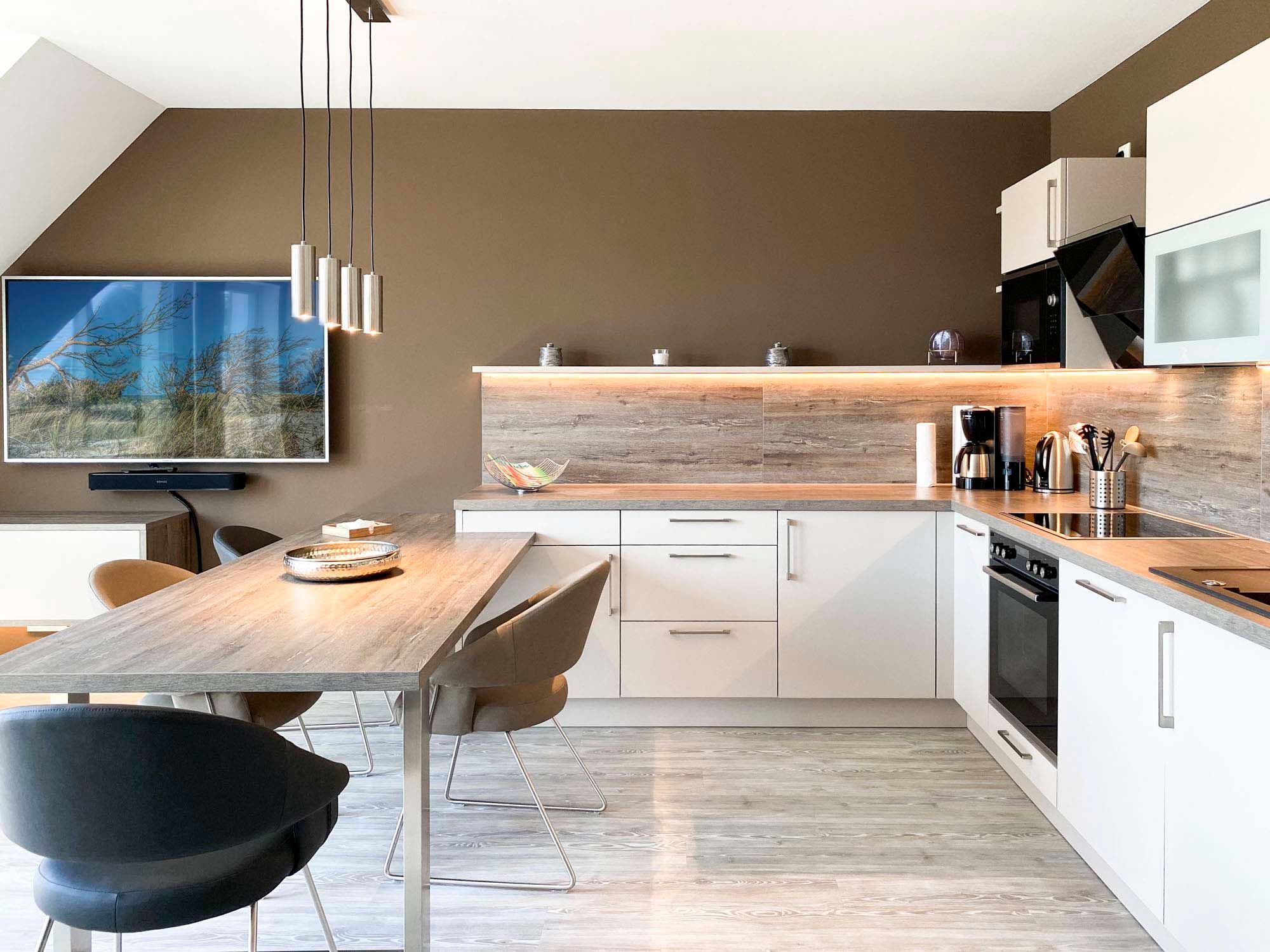 • Küche: Voll ausgestattete Küchenzeile mit Induktionskochfeld, Backofen, Geschirrspüler, Kühlschrank mit Gefrierfach, Mikrowelle, Filterkaffeemaschine, Toaster und Wasserkocher