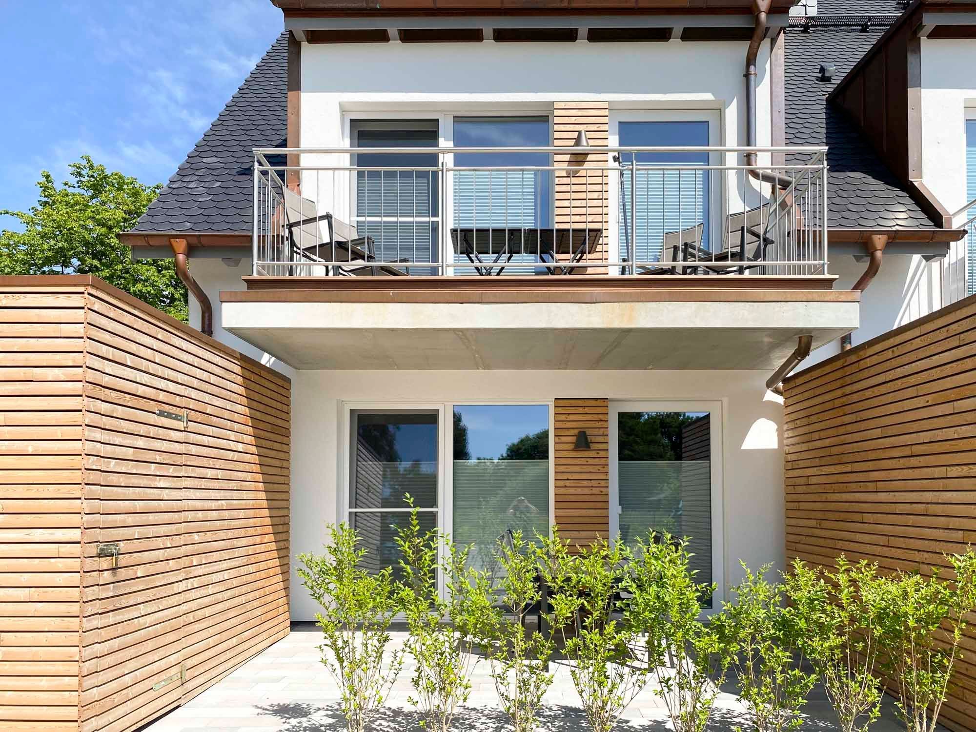 • Balkon: Westlich ausgerichteter Balkon mit Gartenmöbeln und Sonnenschirm, ideal zum Entspannen