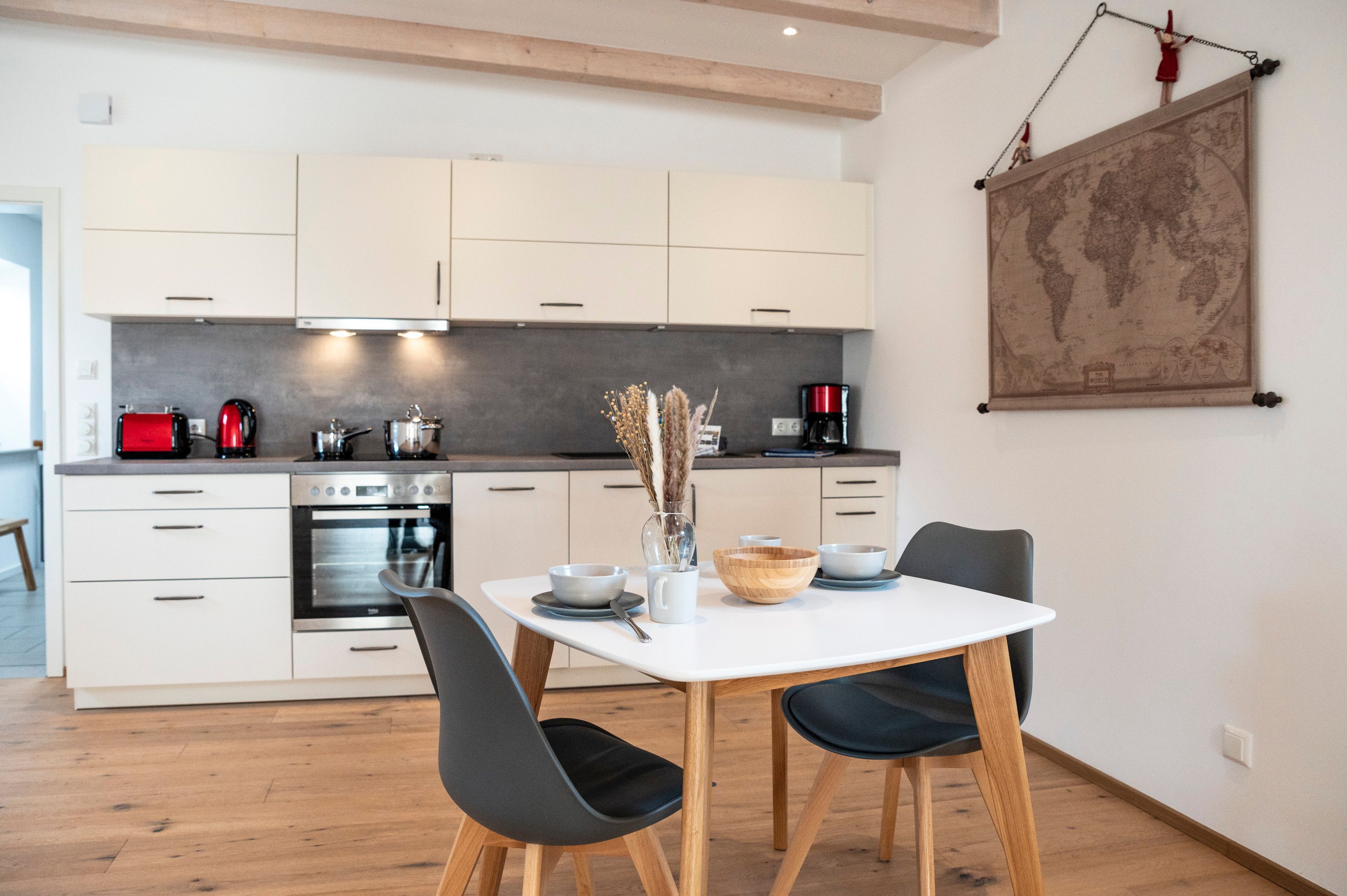 • Voll ausgestattete Küchenzeile: Kochfeld, Backofen, Kühlschrank, Geschirrspüler und Filterkaffeemaschine