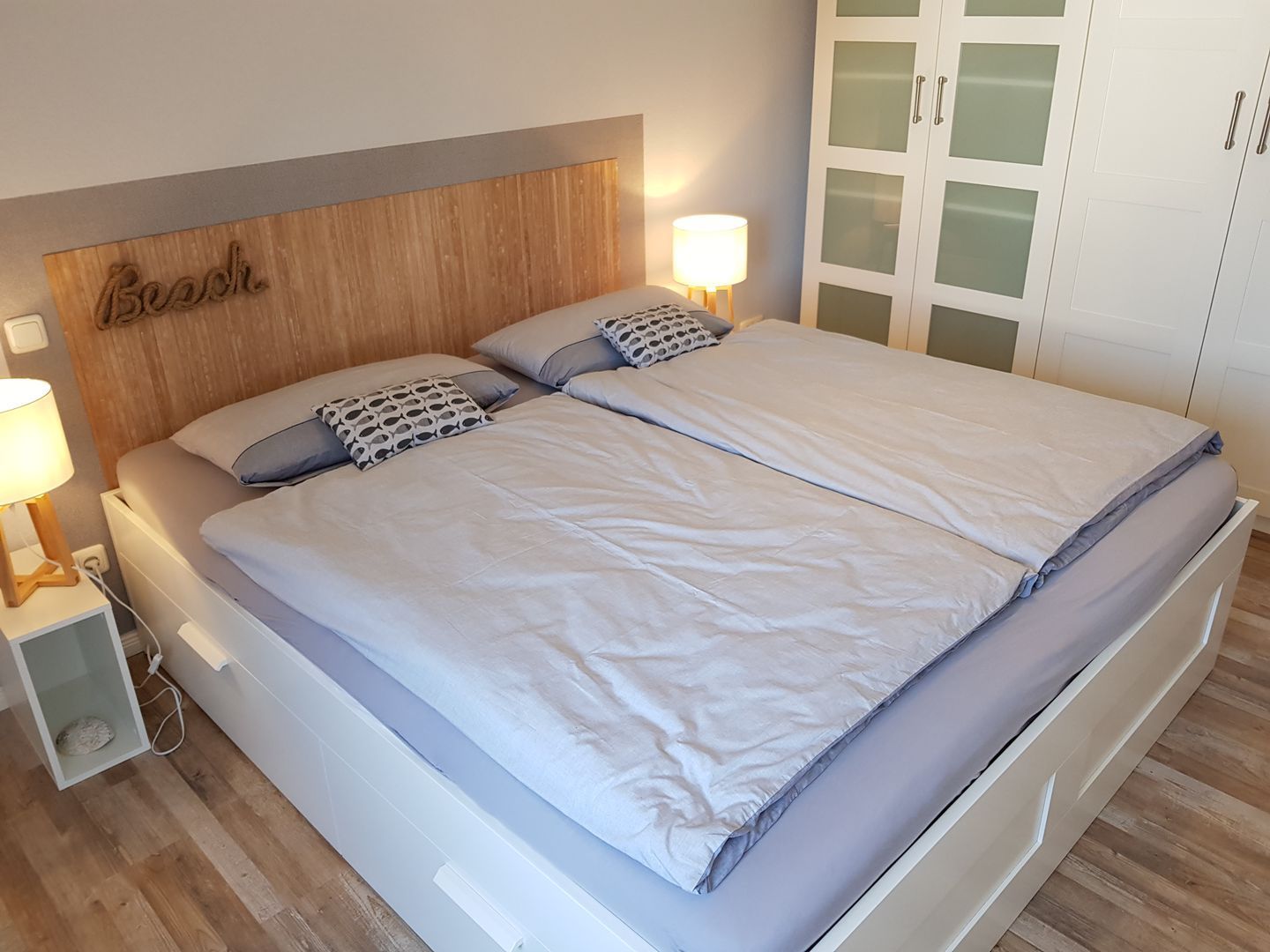 Das Schlafzimmer ist mit einem bequemen Doppelbett ausgestattet und verfügt über einen geräumigen Kleiderschrank.