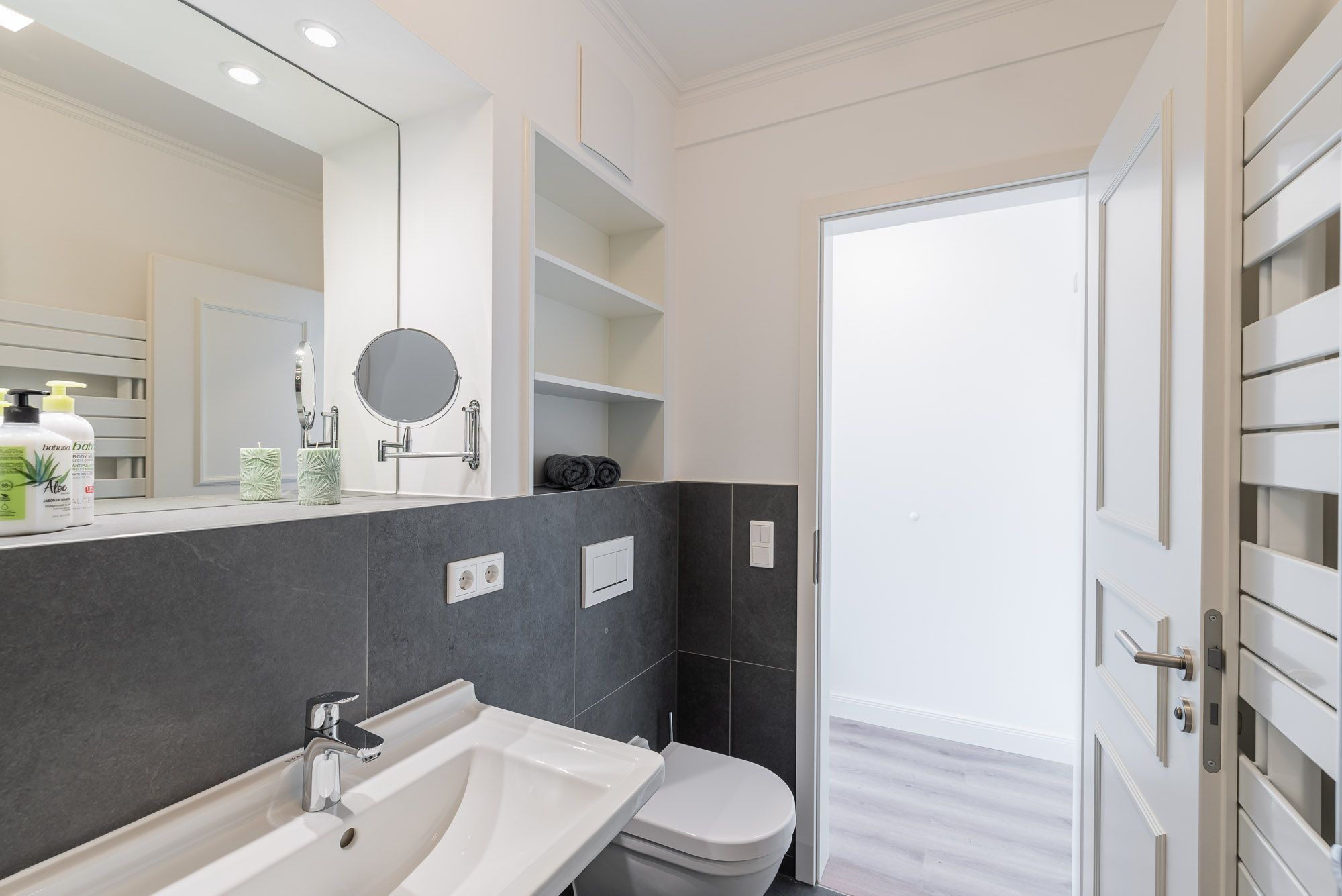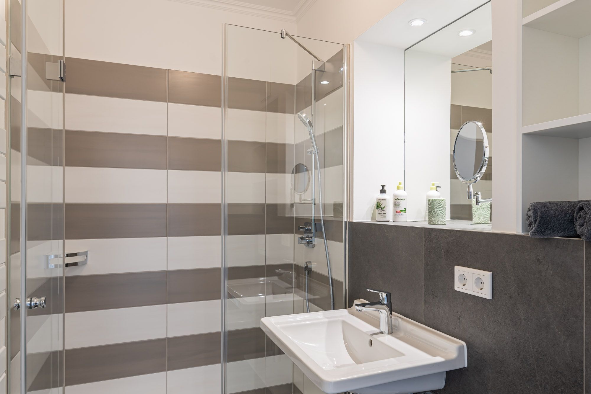 Das Bad verfügt über eine Dusche, einem Haartrockner und einem Handtuchtrockner. Zu Ihrem Apartment gehört ebenfalls ein großer und lichtdurchfluteter Wohn- und Essbereich mit offener Küche.