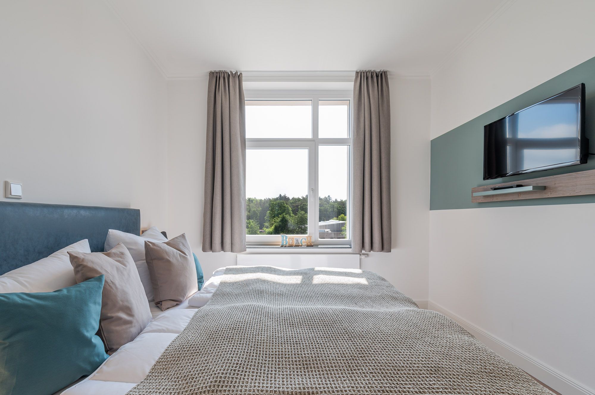 Das Schlafzimmer verfügt über ein 1,80 x 2,00 m Bett, sowie über einen Kleiderschrank und ein TV-Gerät. Die zweite Schlafmöglichkeit ist ein bequemes Schlafsofa mit einer Liegefläche von 1,29 x 1,98 m. Für unsere kleinen Gäste können ein Kinderreisebett und ein Kinderhochstuhl bereitgestellt werden (kostenpflichtig zu buchbar).