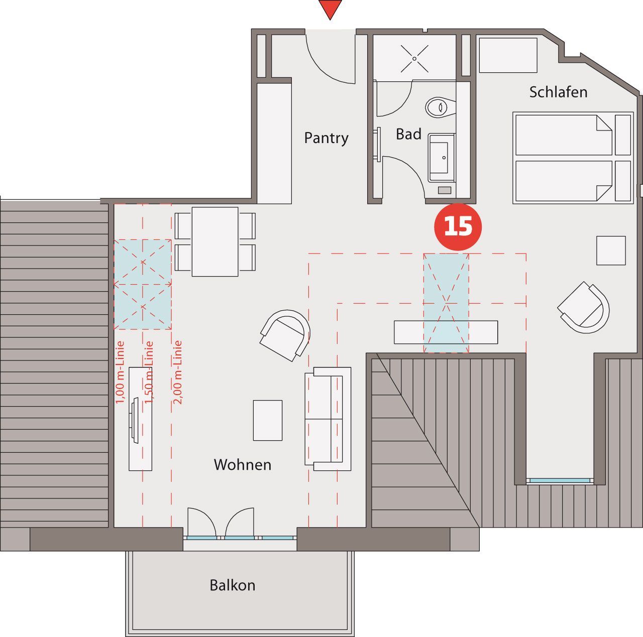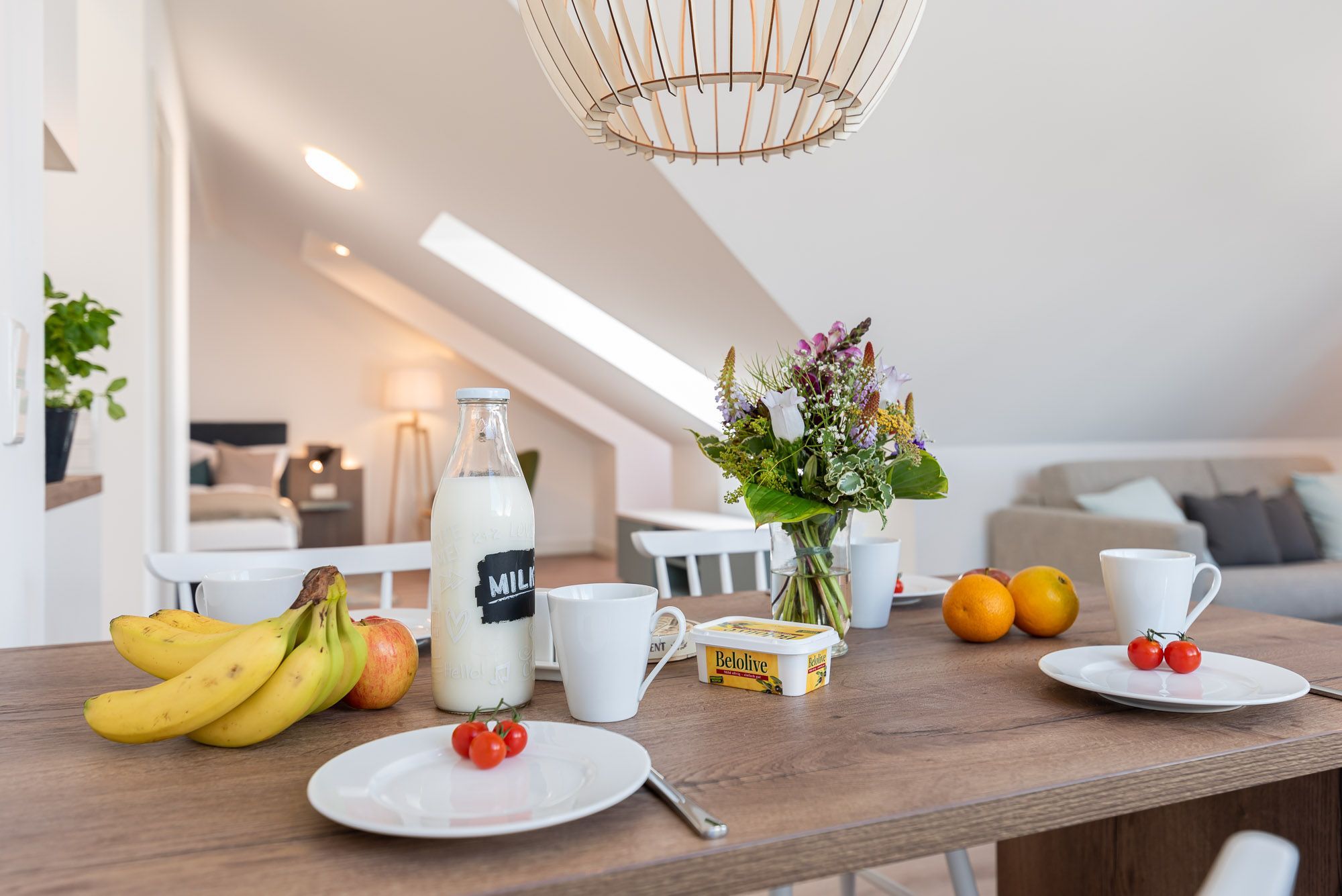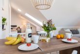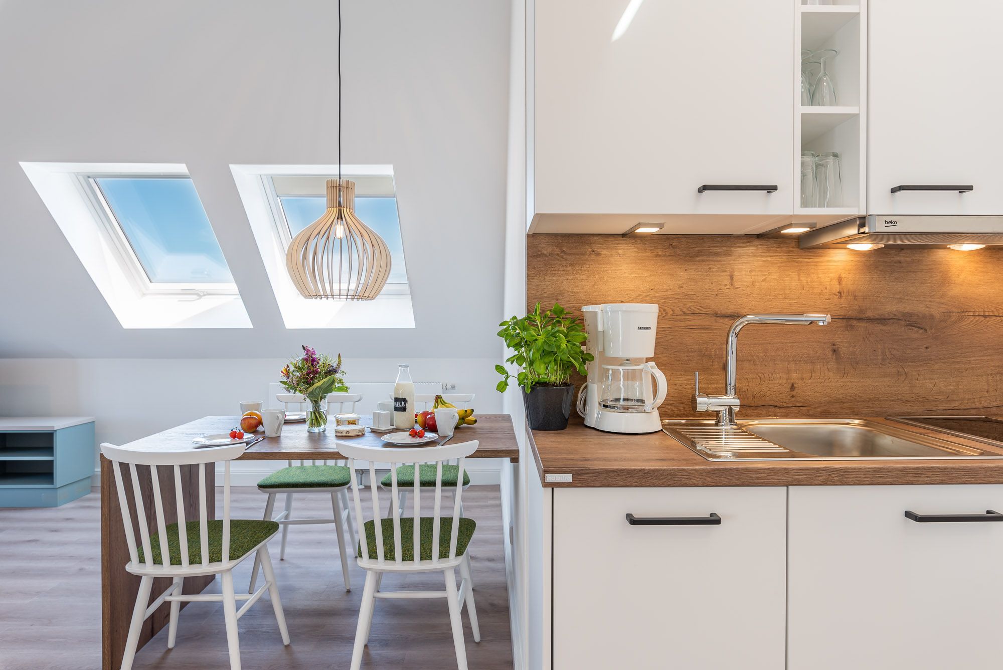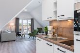 Das Bad verfügt über eine Dusche, einem Haartrockner und einem Handtuchtrockner. Zu Ihrem Apartment gehört ebenfalls ein großer und lichtdurchfluteter Wohn- und Essbereich mit offener Küche.