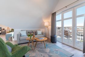 Das Einzimmer-Apartment bietet genügend Platz für 4 Personen. Außerdem verfügt es neben seiner Wohnfläche von ca. 52 qm auch über einen Balkon. Dieser ist mit Balkonmöbeln und einem Sonnenschirm ausgestattet.