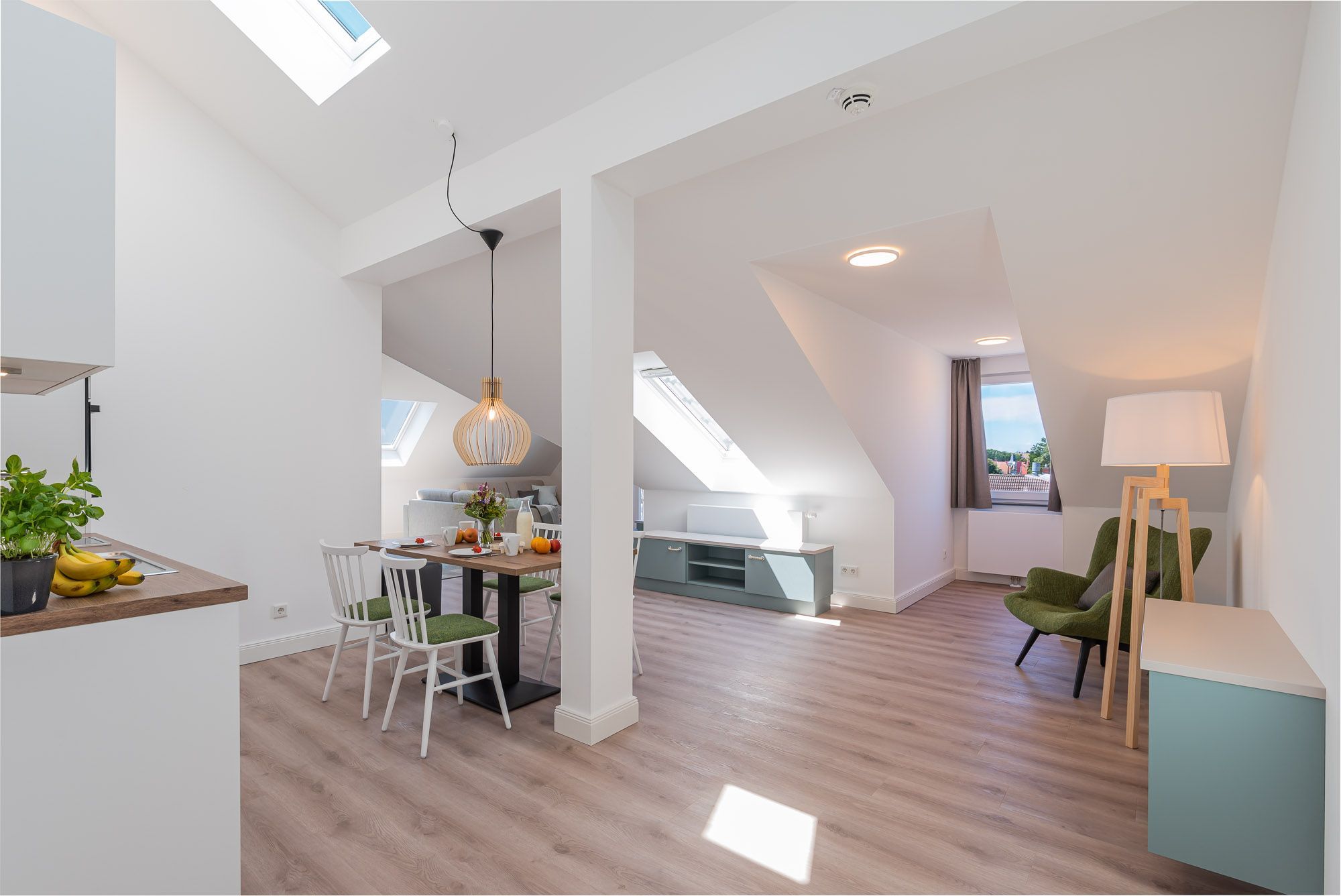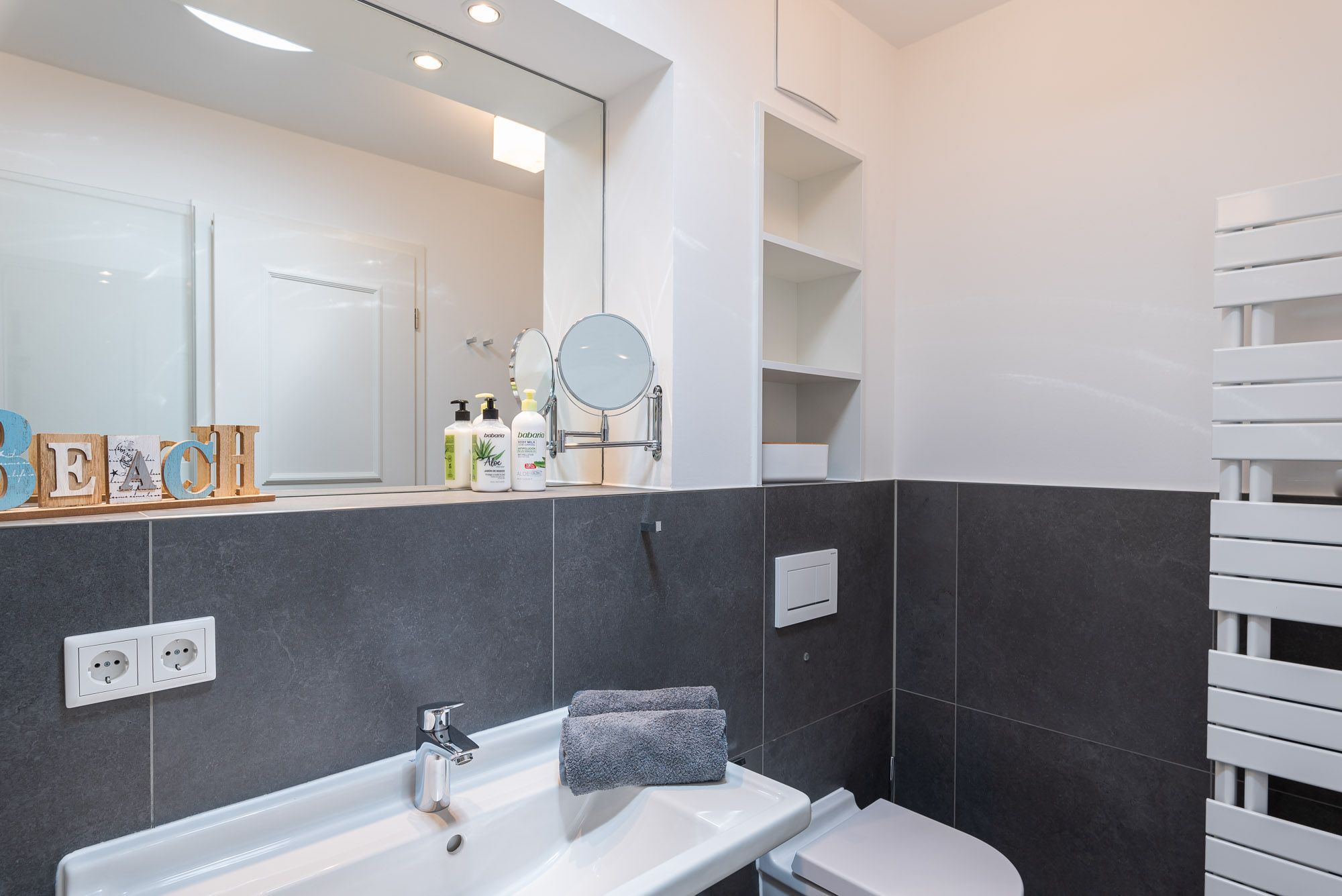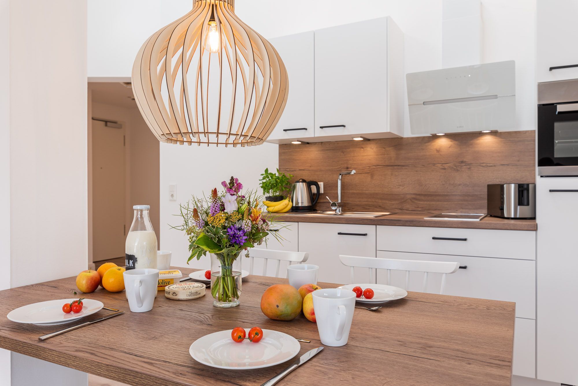 Das Bad verfügt über eine Dusche, einem Haartrockner und einem Handtuchtrockner. Zu Ihrem Apartment gehört ebenfalls ein großer und lichtdurchfluteter Wohn- und Essbereich mit offener Küche.