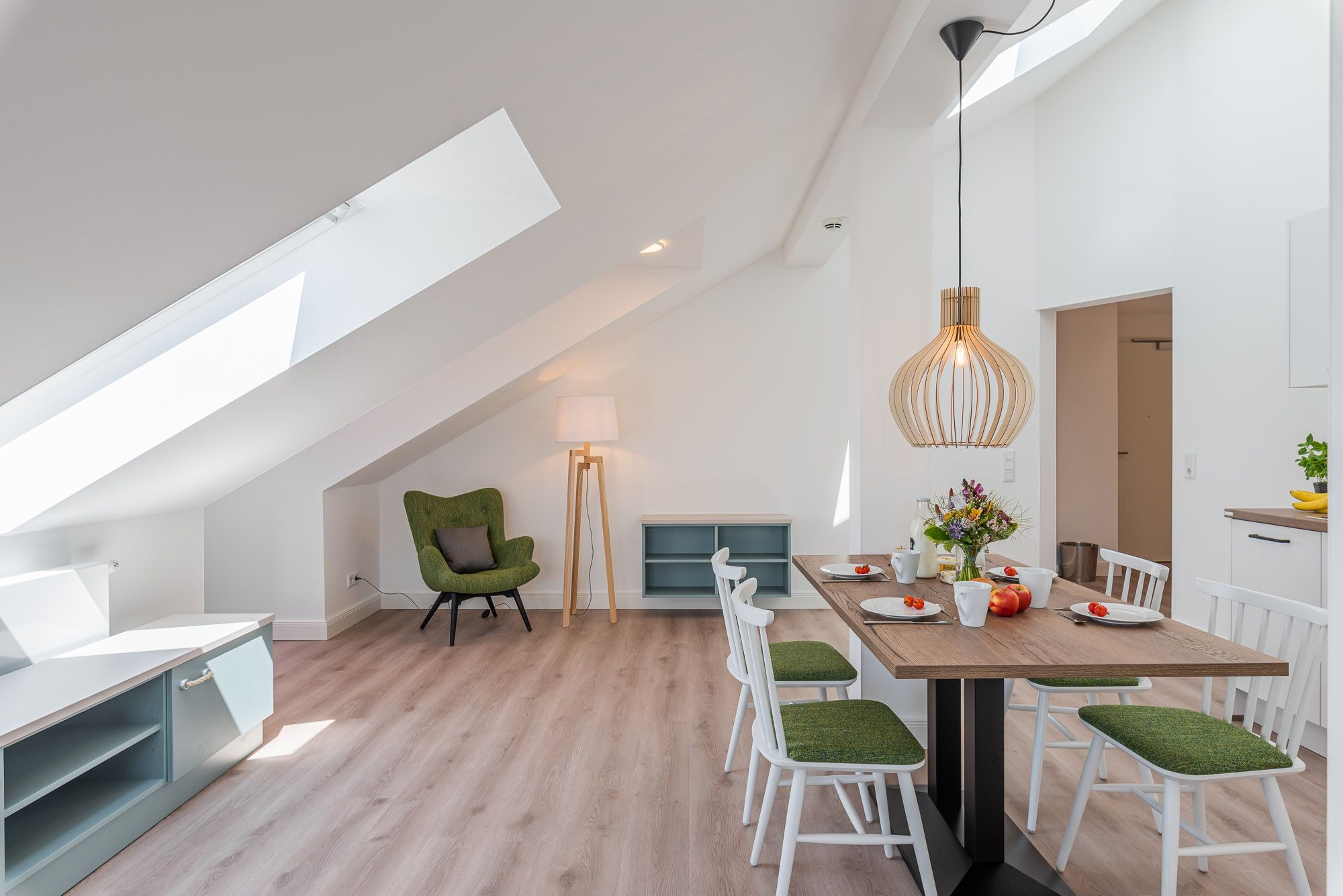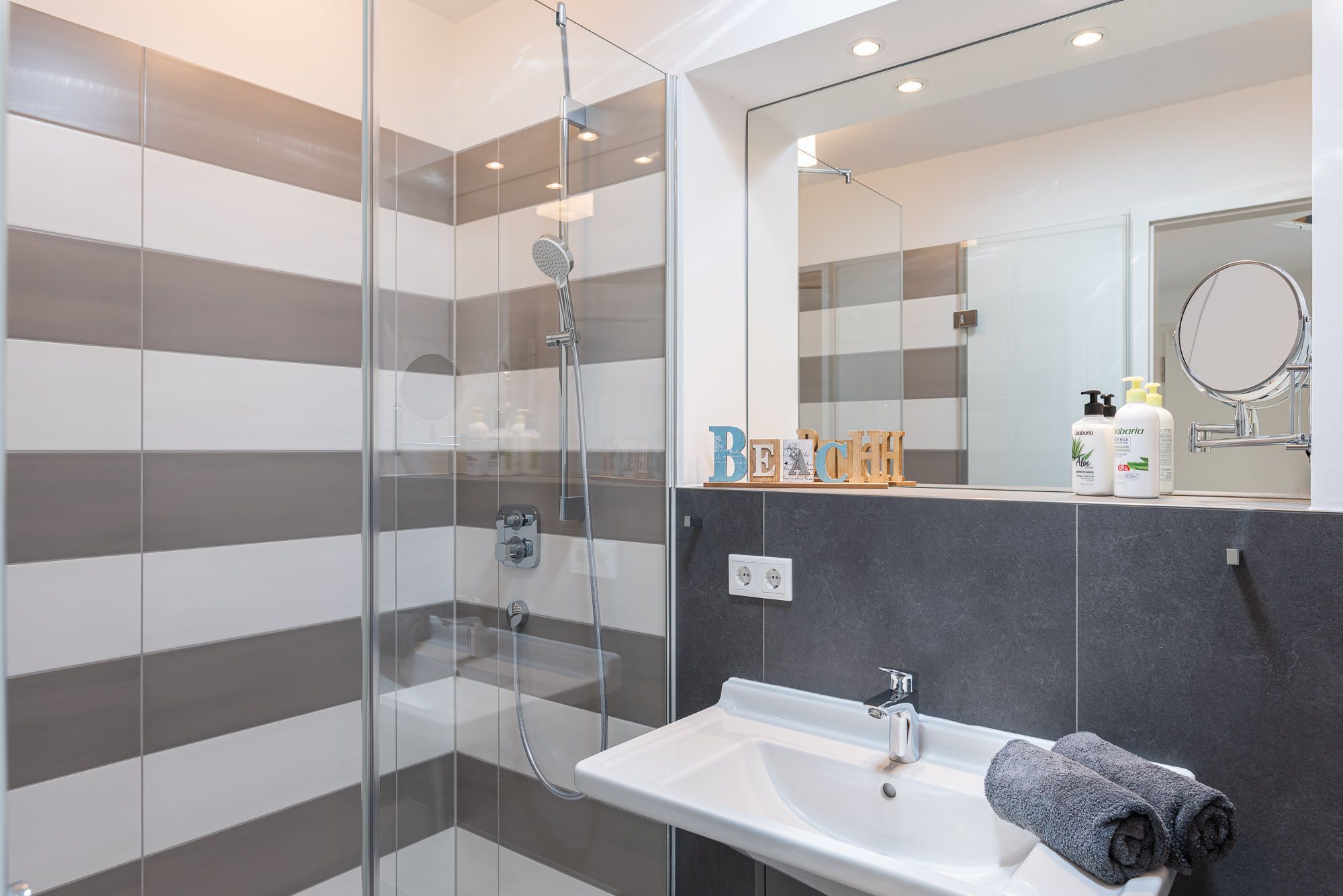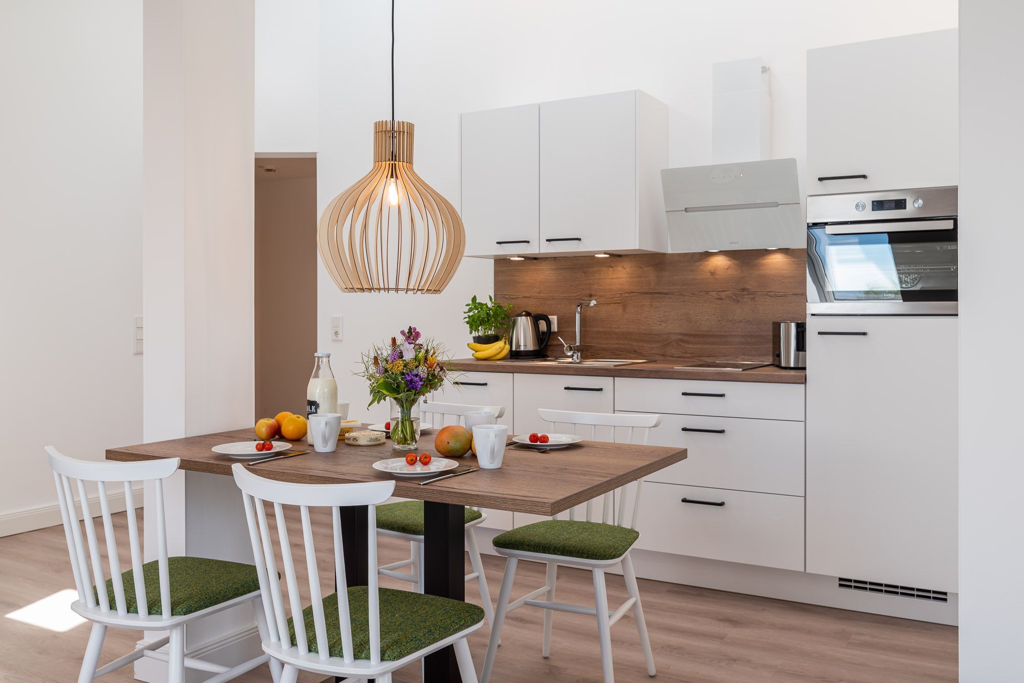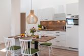 Das Bad verfügt über eine Dusche, einem Haartrockner und einem Handtuchtrockner. Zu Ihrem Apartment gehört ebenfalls ein großer und lichtdurchfluteter Wohn- und Essbereich mit offener Küche.