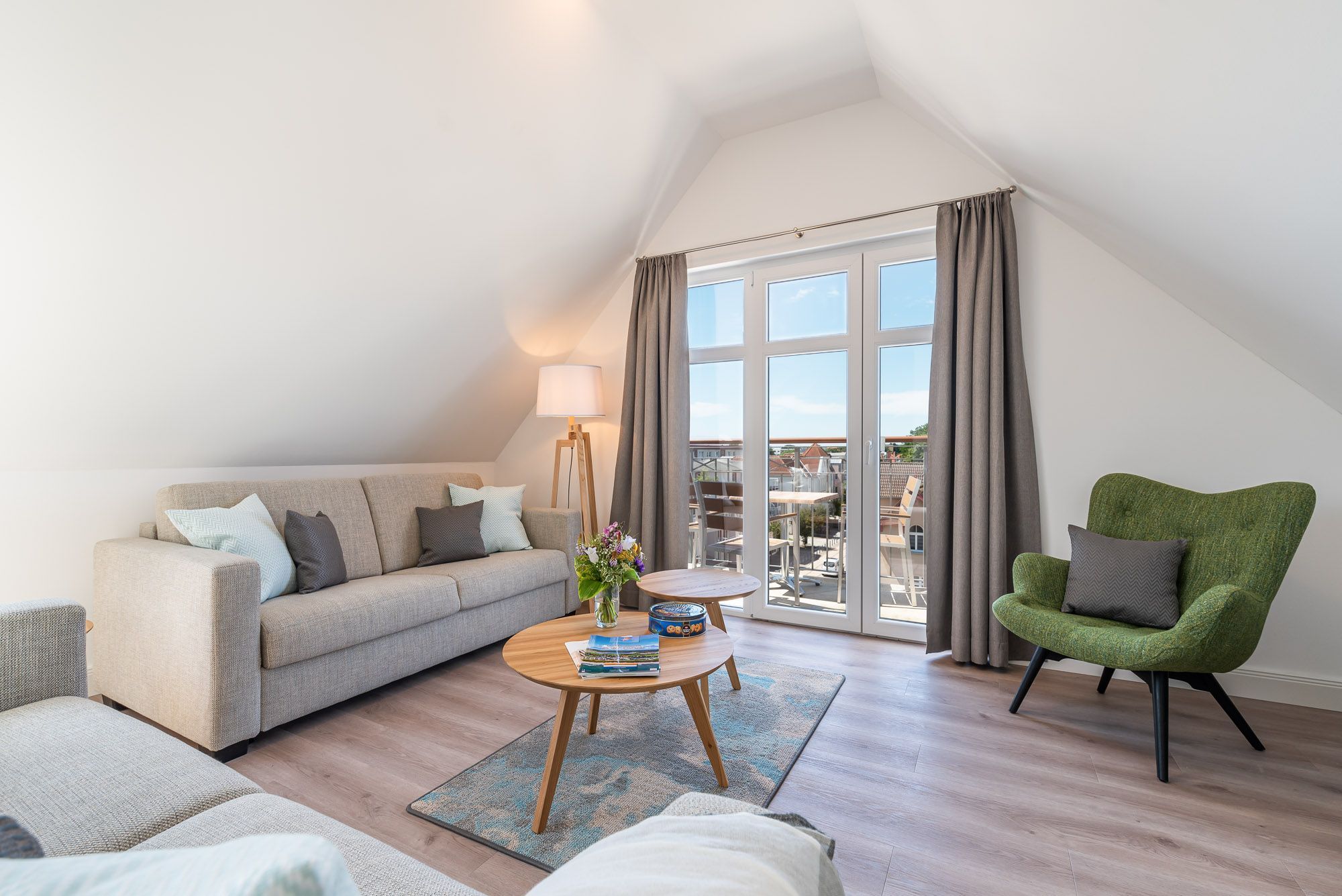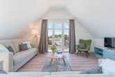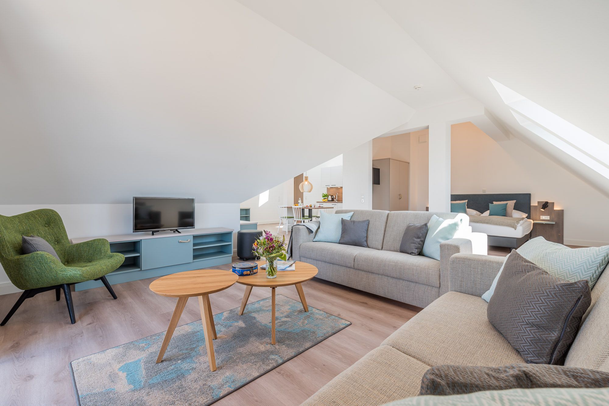 Der Schlafbereich verfügt über ein 1,80 x 2,00 m Bett, sowie über einen Kleiderschrank und ein TV-Gerät. Die zweite Schlafmöglichkeit ist ein bequemes Schlafsofa mit einer Liegefläche von 1,50 x 1,95 m. Für unsere kleinen Gäste können ein Kinderreisebett und ein Kinderhochstuhl bereitgestellt werden (kostenpflichtig zu buchbar).