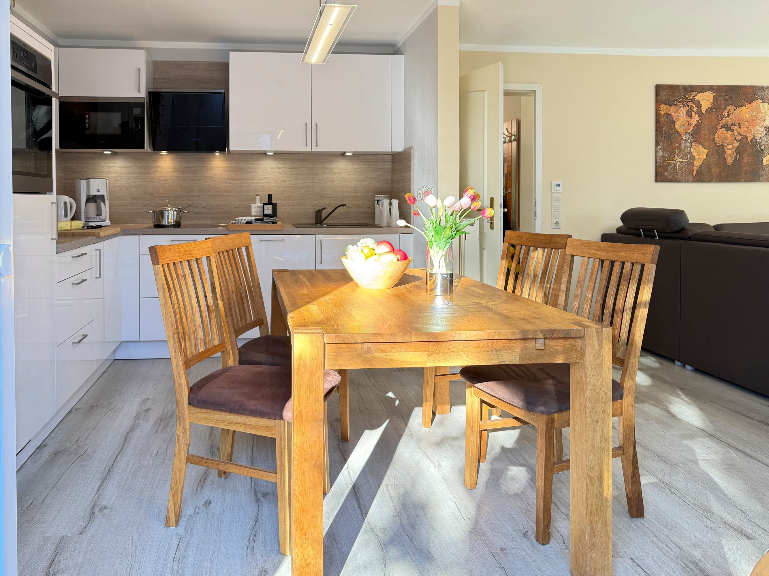 • Küche: Moderne, voll ausgestattete Küche mit Backofen, Kochfeld, Mikrowelle, Kühlschrank, Geschirrspüler, Kaffeemaschine, Toaster und Wasserkocher